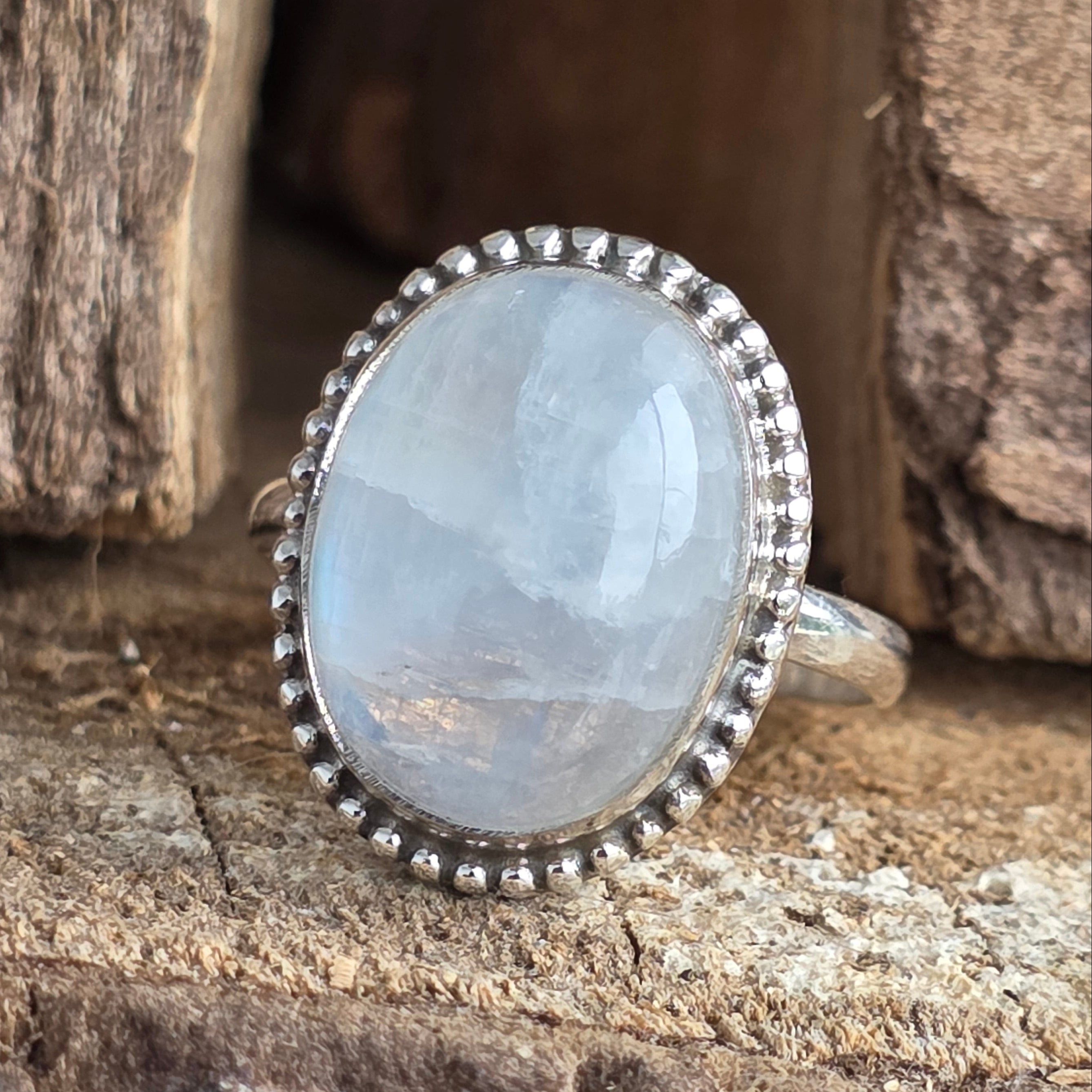 Egy gyönyörű 925-ös ezüst gyűrű, természetes szivárvány holdkővel, amelyről ismert, hogy kékes és gyöngyházfényű reflexeit minden mozdulatra táncoltatja. A rawa workkézzel készült dizájn kiemeli a kő eleganciáját, és egyszerre ad egy kifinomult és bohém hangulatot.