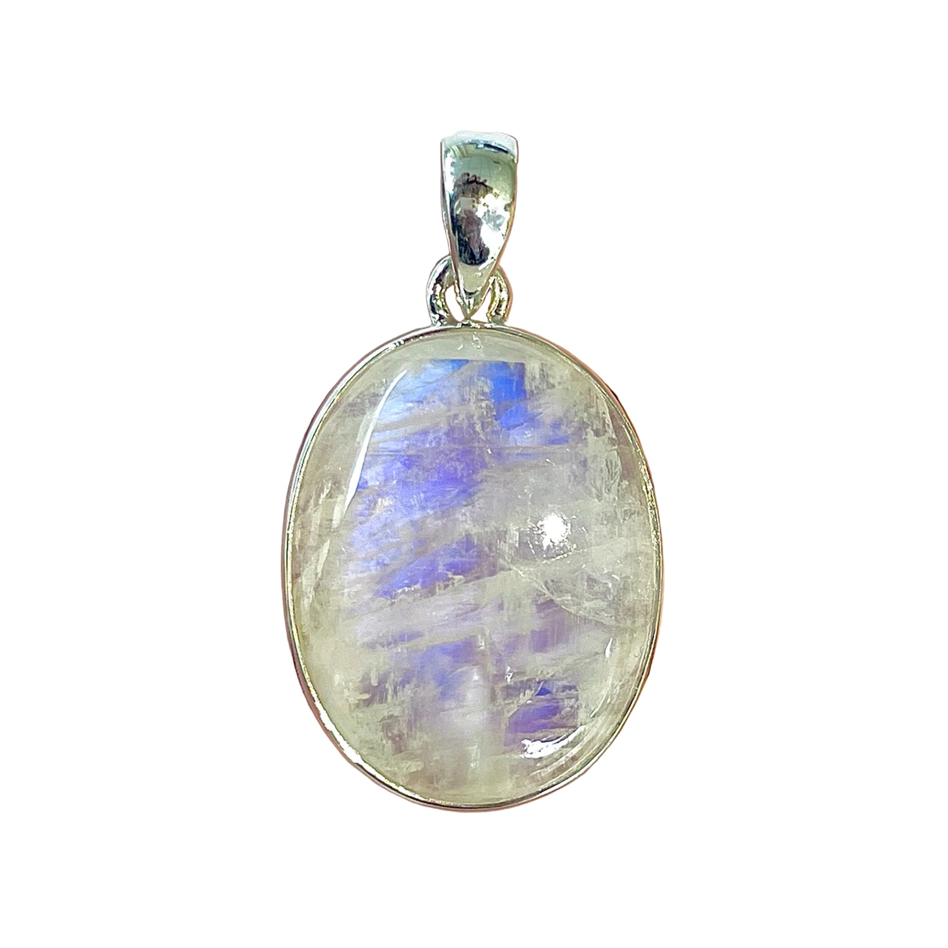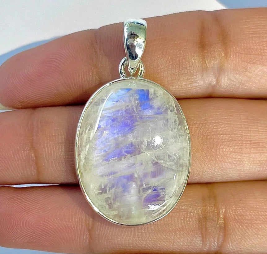 Ez az egyedi szivárvány holdkő medál úgy ragyog, mint a víz felszínén visszatükröződő fény, kék-lila irizáló fényeket mutatva, amelyek a mozgással táncolnak. Átlátszó és titokzatos, a kő magára vonja a tekintetet, és egy ősi talizmán varázsát hozza magával.