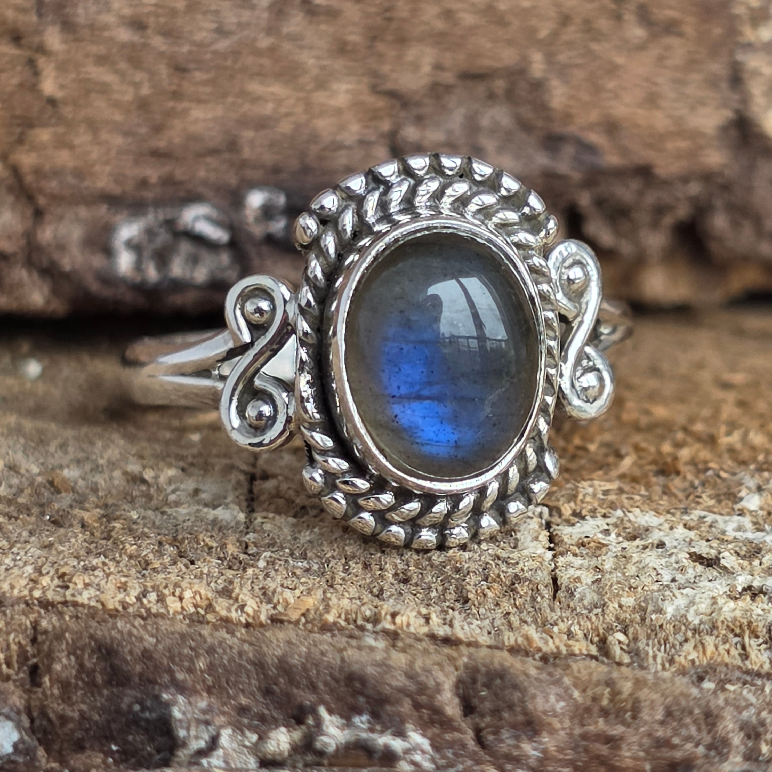 Egy igazán bűbájos 925 ezüst gyűrű, természetes labradorittal efogatva, amely a fénytől függően kék és arany fényeket ad. A kézzel készült foglalat finom rawa work részleteket ötvöz ezüstből faragott díszítésekkel, így egy bohém és kifinomult ékszert eredményez.