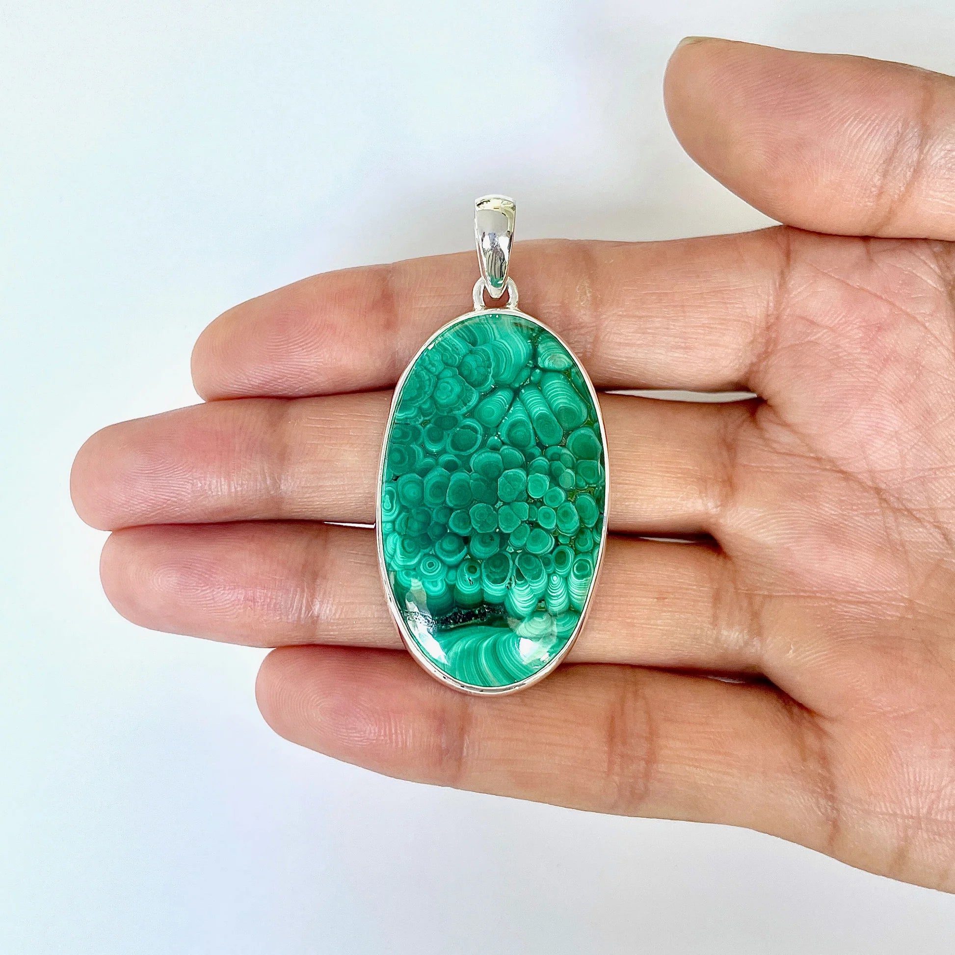 Ez a masszív medál természetes malachitból és 925-ös ezüstből készült, és intenzív zöld árnyalataival, valamint a körkörös, látványos mintáival tűnik ki, amelyek erre az ásványra jellemzőek. Az oválisra csiszolt cabochon kő egy egyszerű ezüst foglalattal van kiemelve, amely megőrzi természetes szépségét.