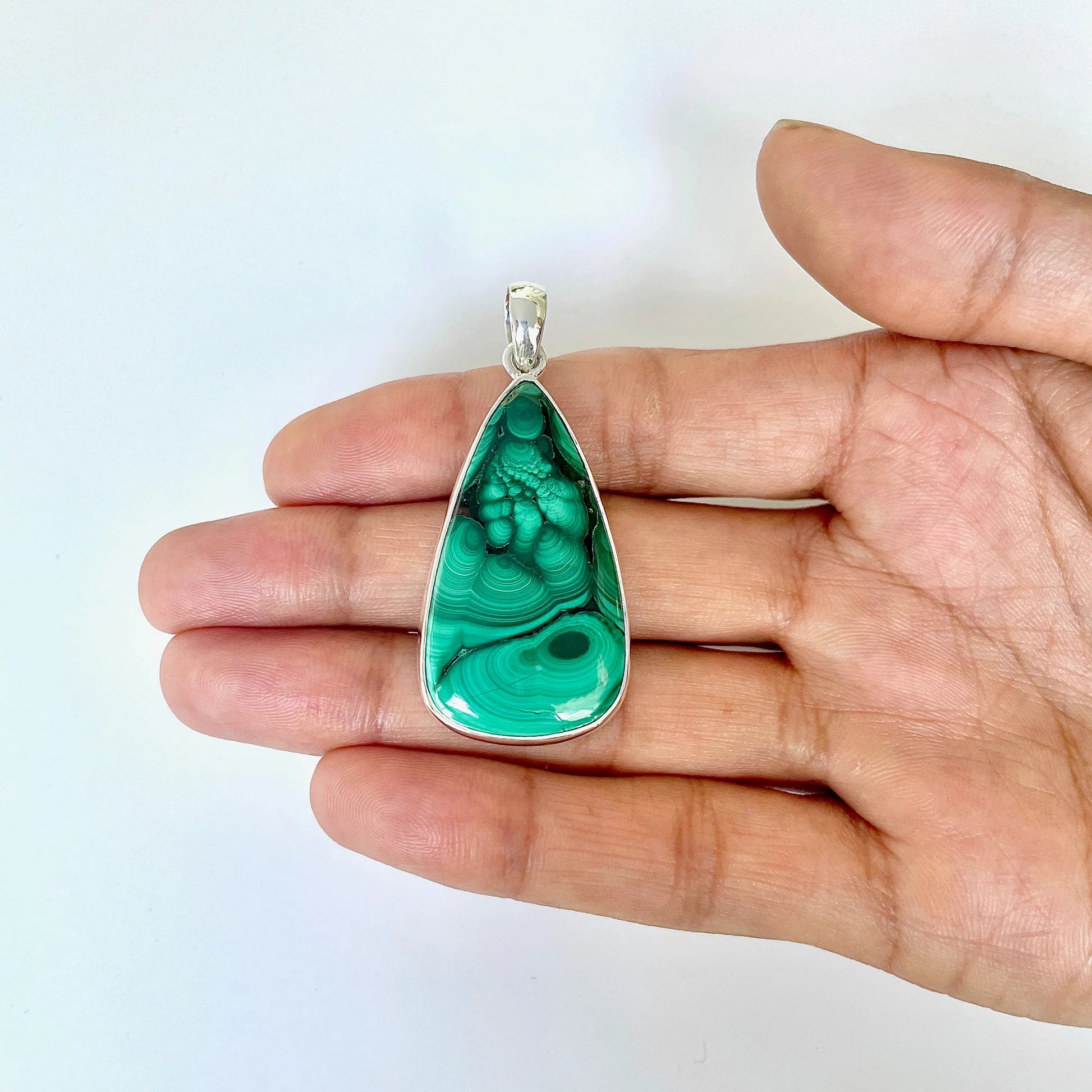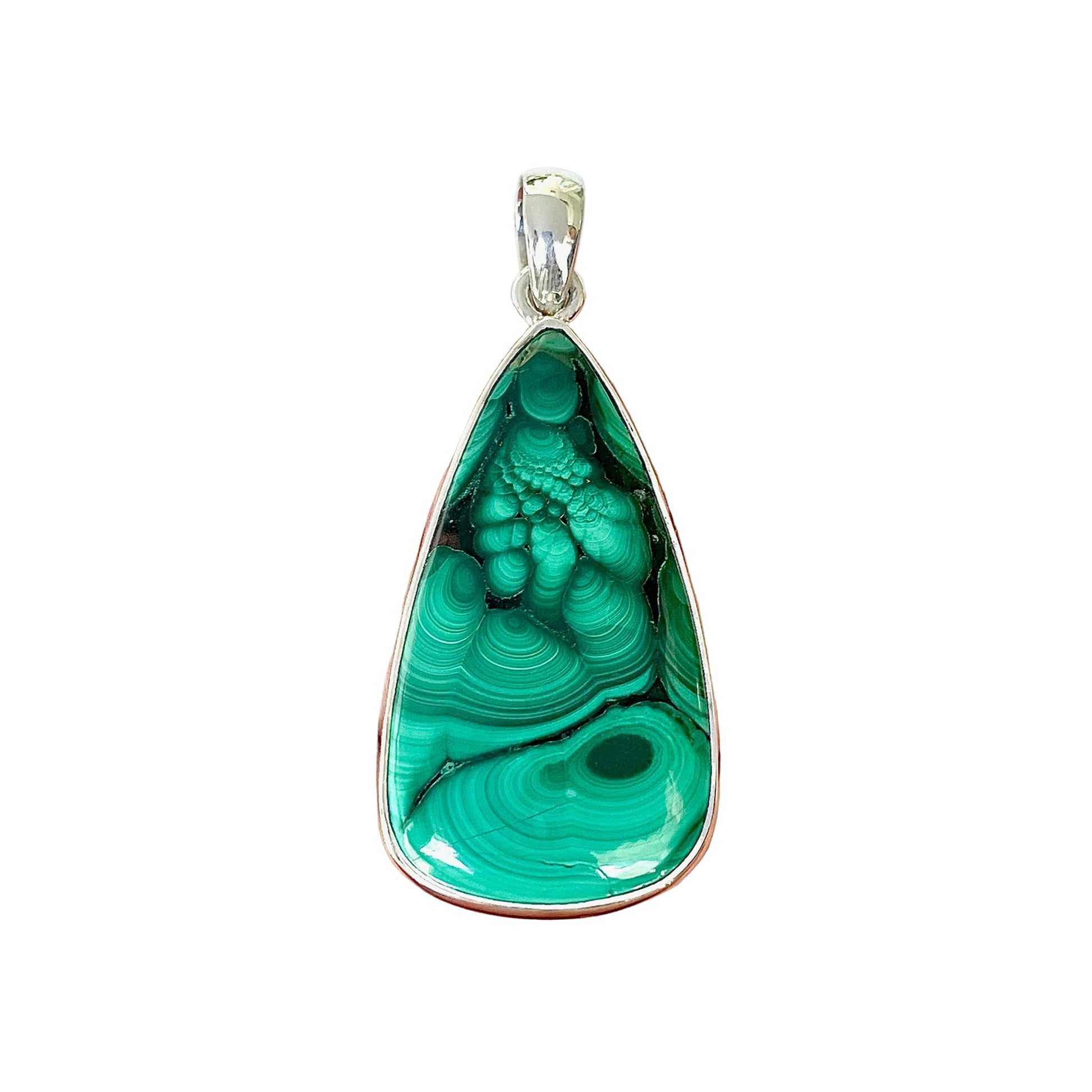 Ez a masszív medál természetes malachitból és 925-ös ezüstből kiemelkedik intenzív zöld árnyalataival és a mineralra jellemző látványos körmintáival. A káboson stílusban oválisan csiszolt követ egyszerű ezüst foglalat emeli ki, amely megőrzi természetes szépségét.