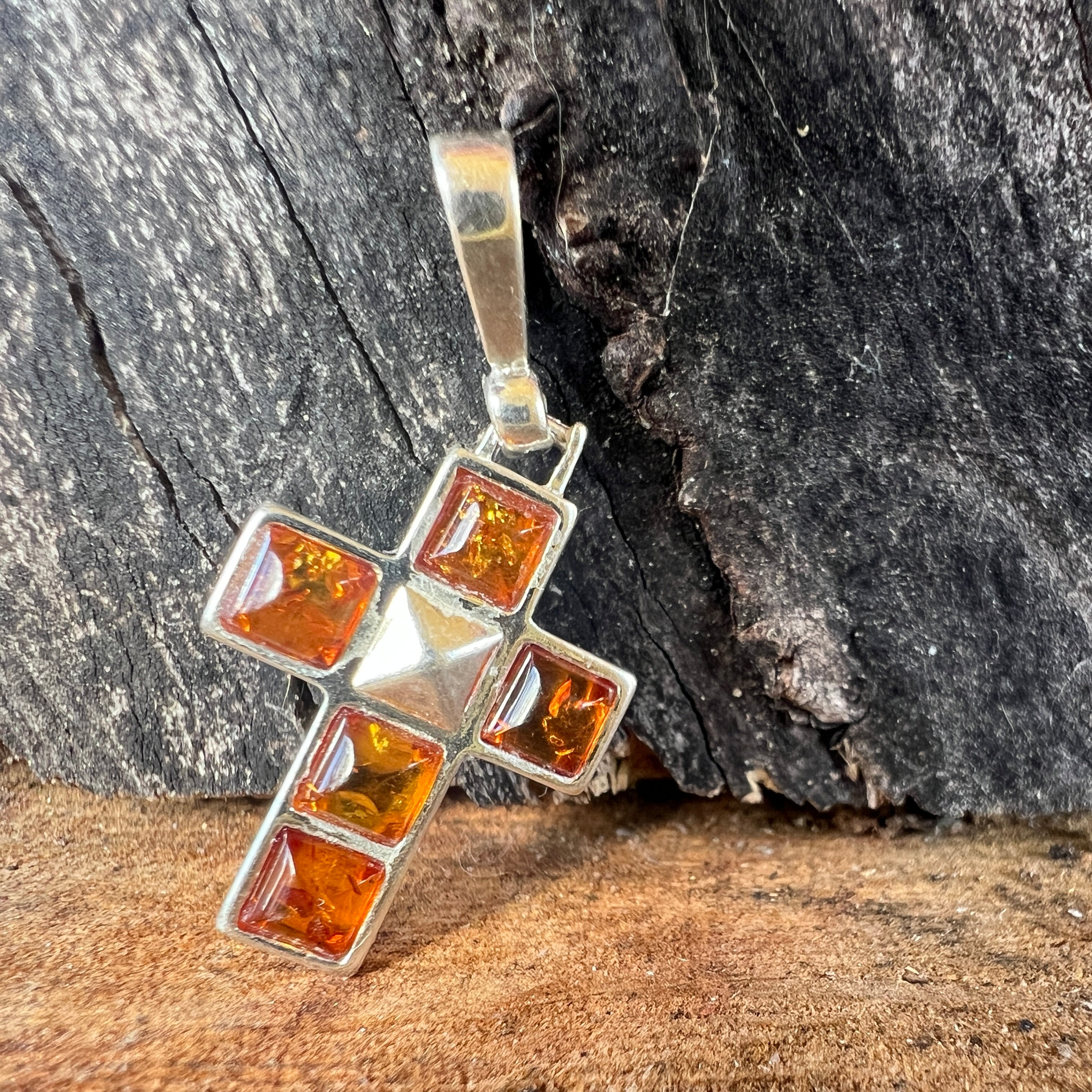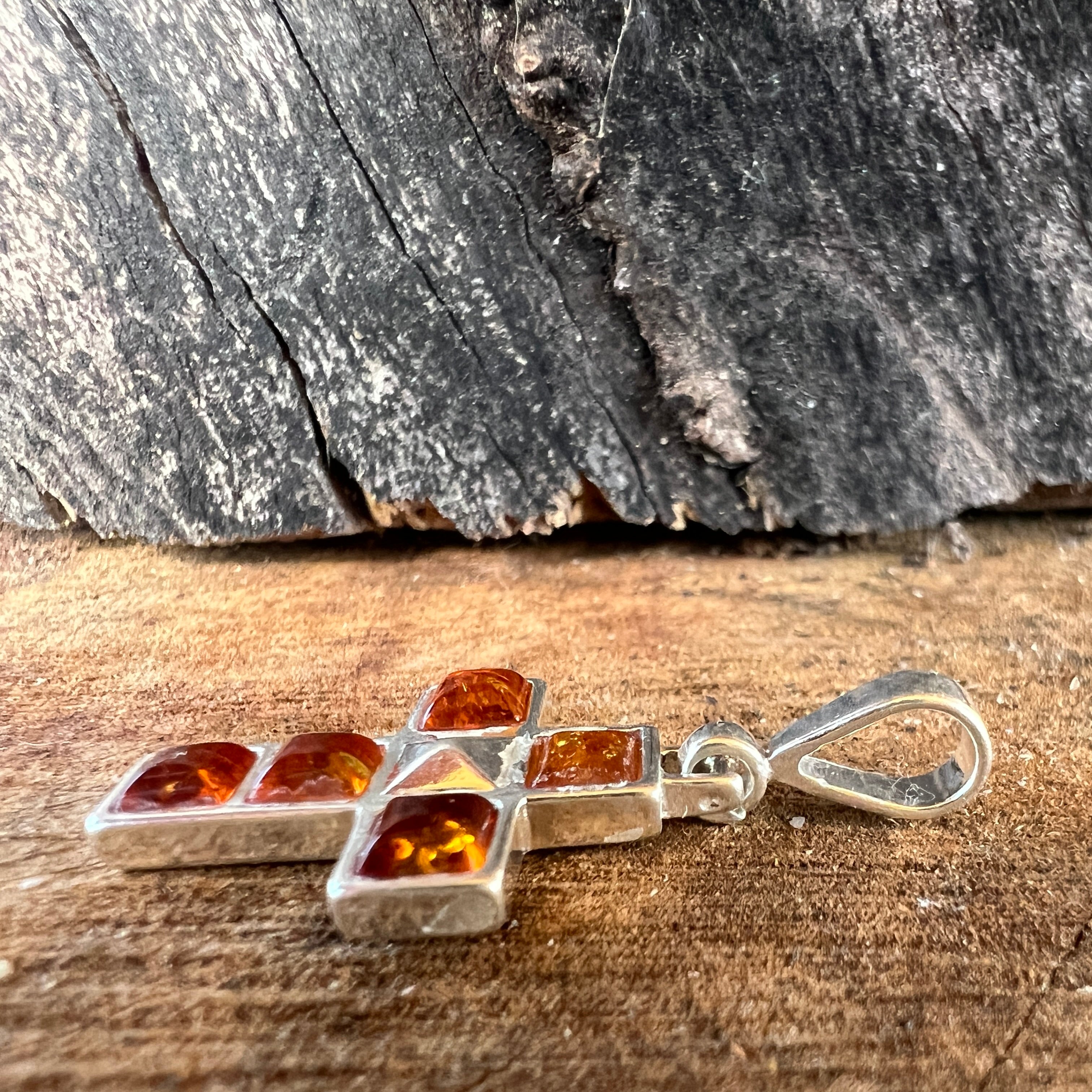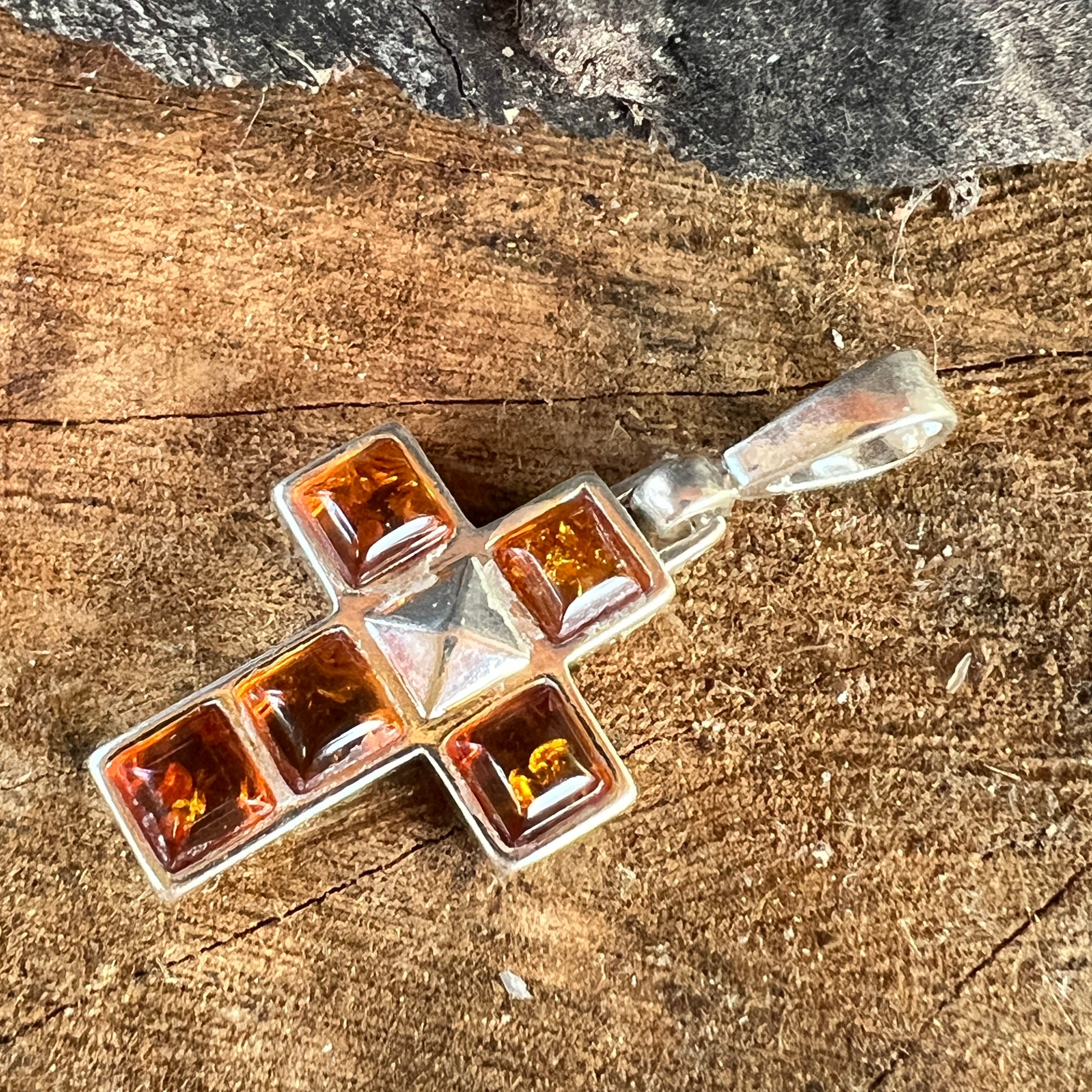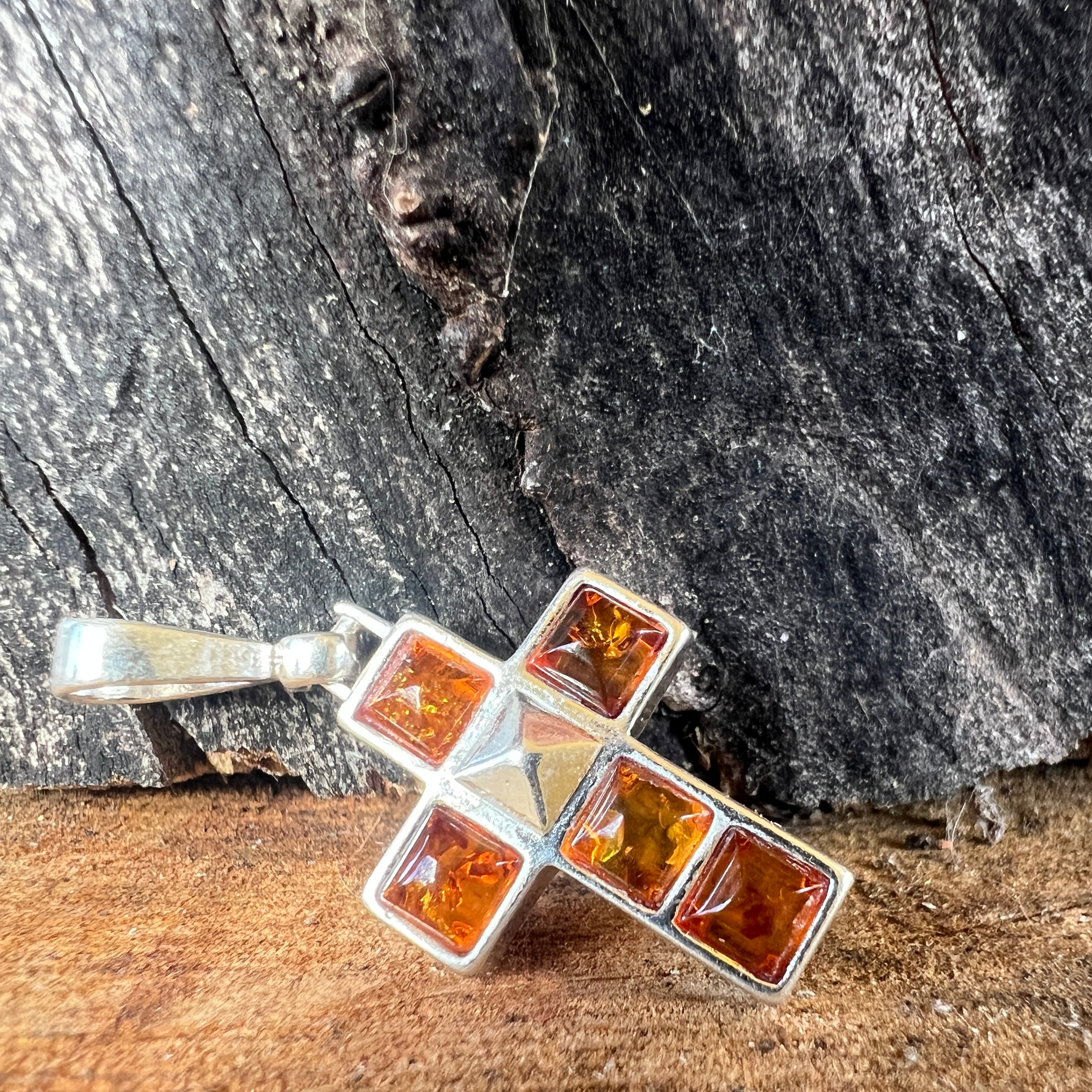 Ezüst medál borostyánnal, kereszt formájú Amber32