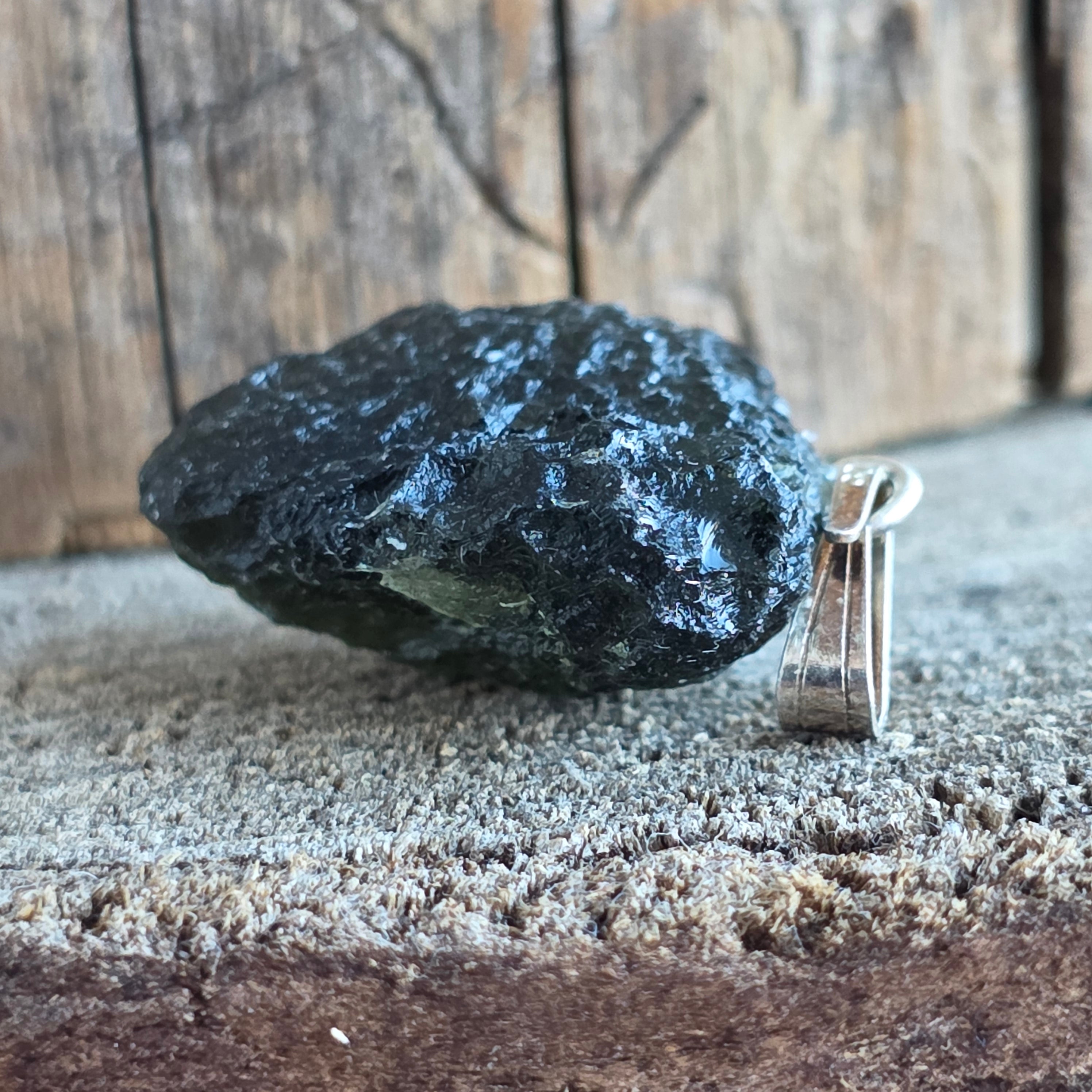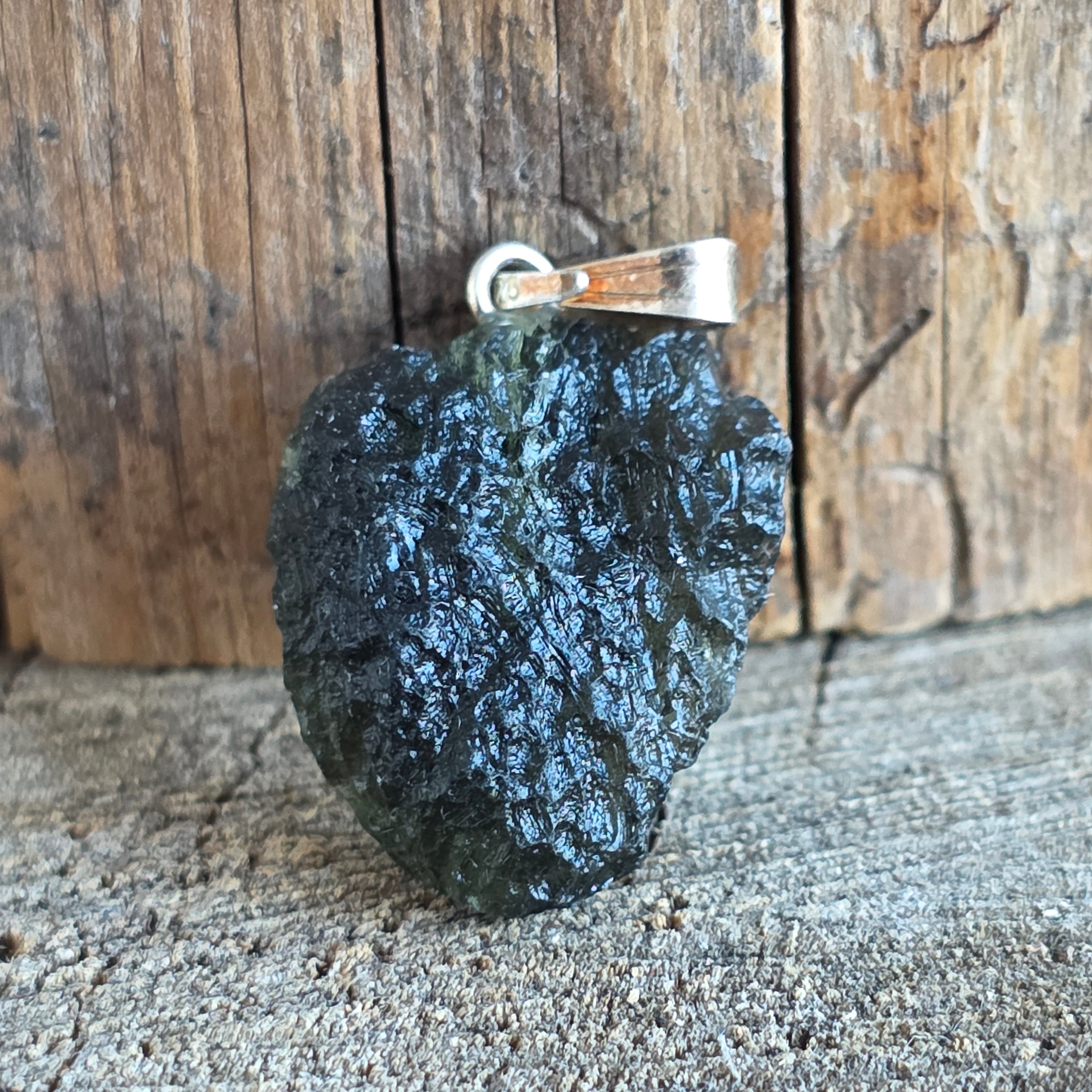 Ritka és hiteles medál nyers moldavit, minimalista beépítve 925 ezüst hogy kiemelje természetes formáját.