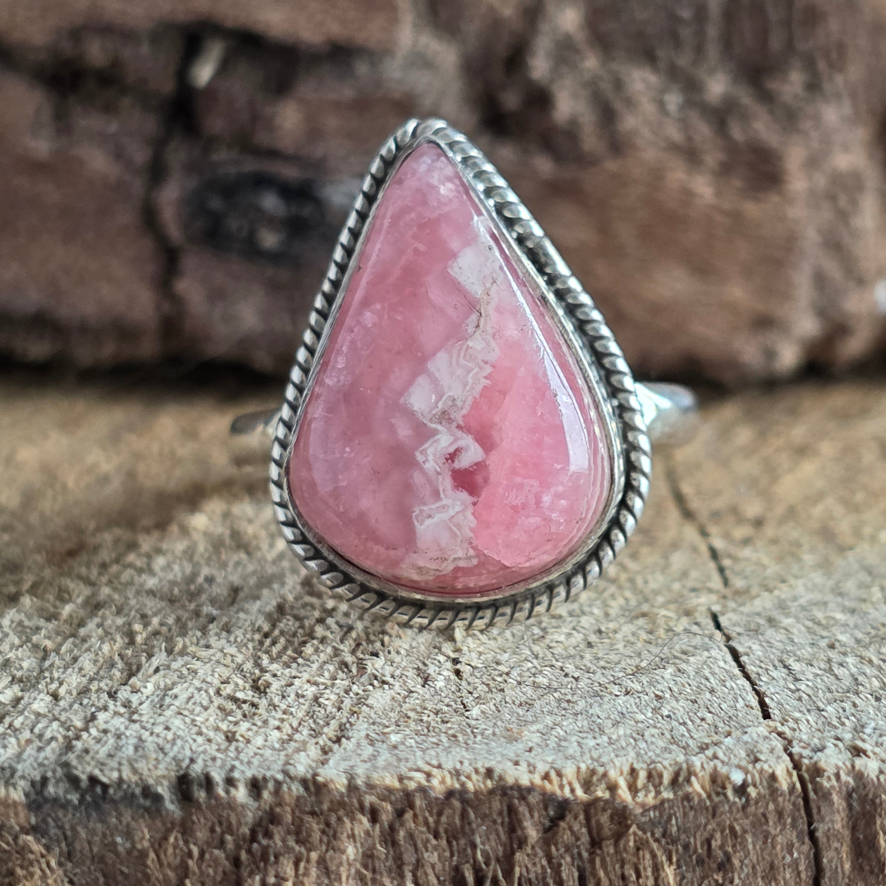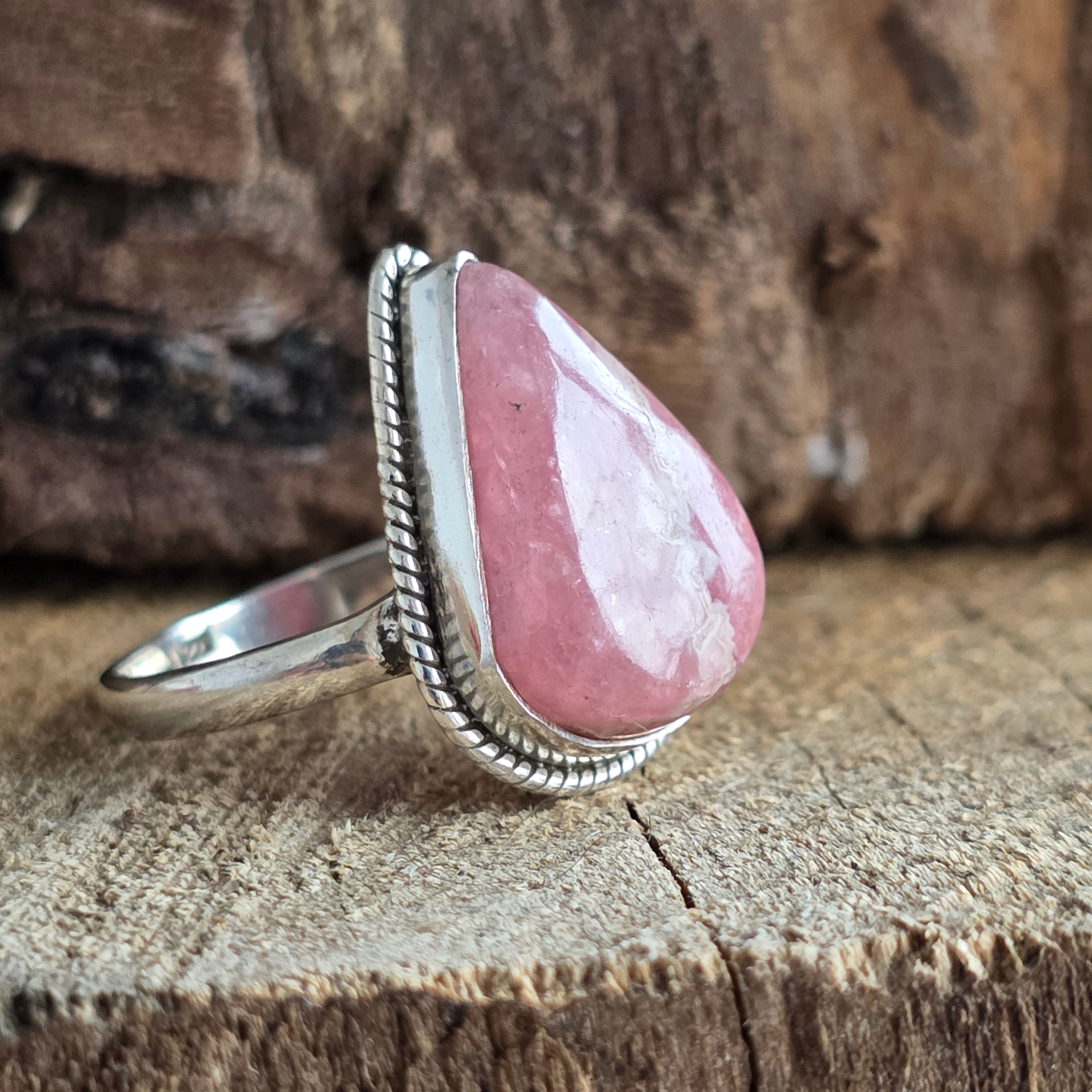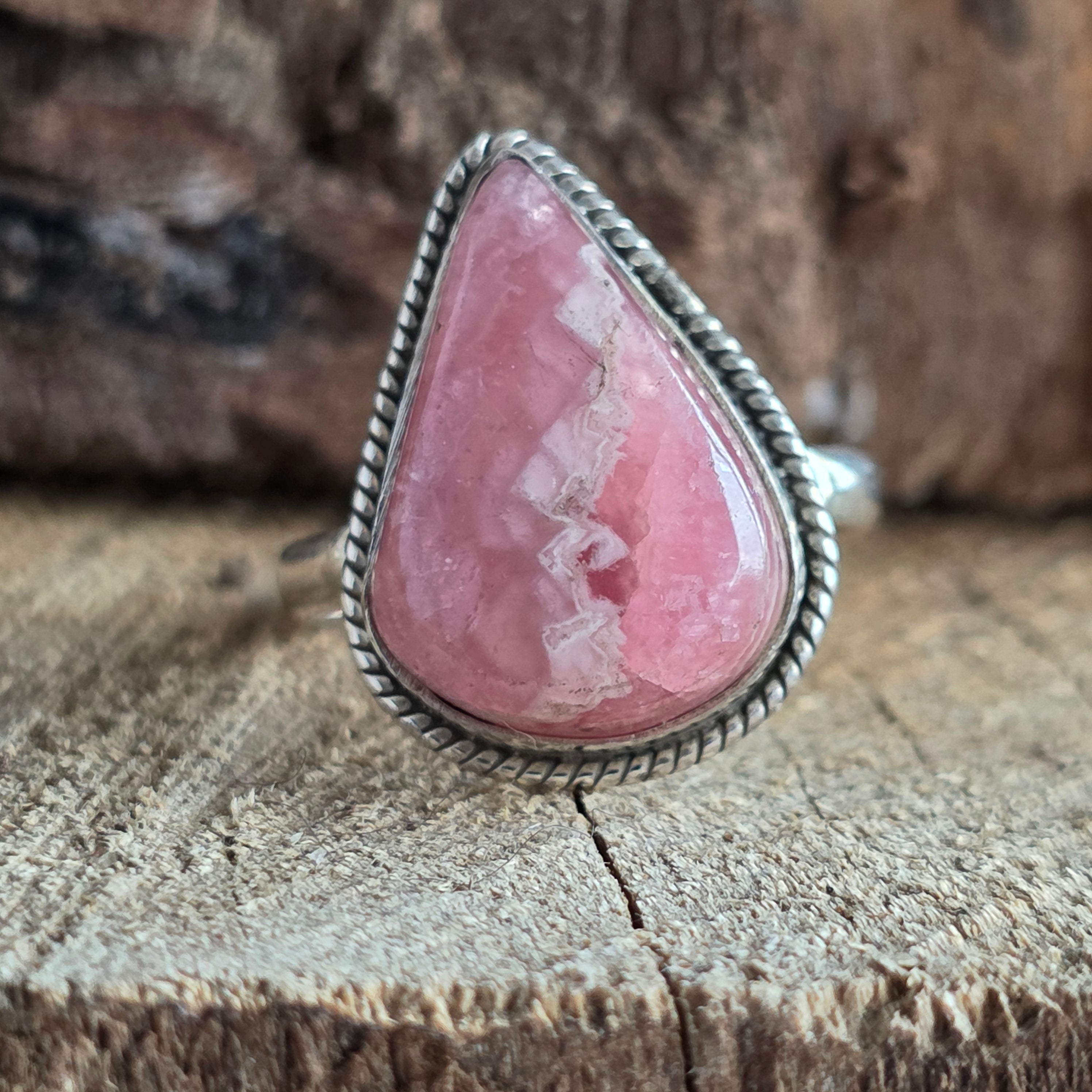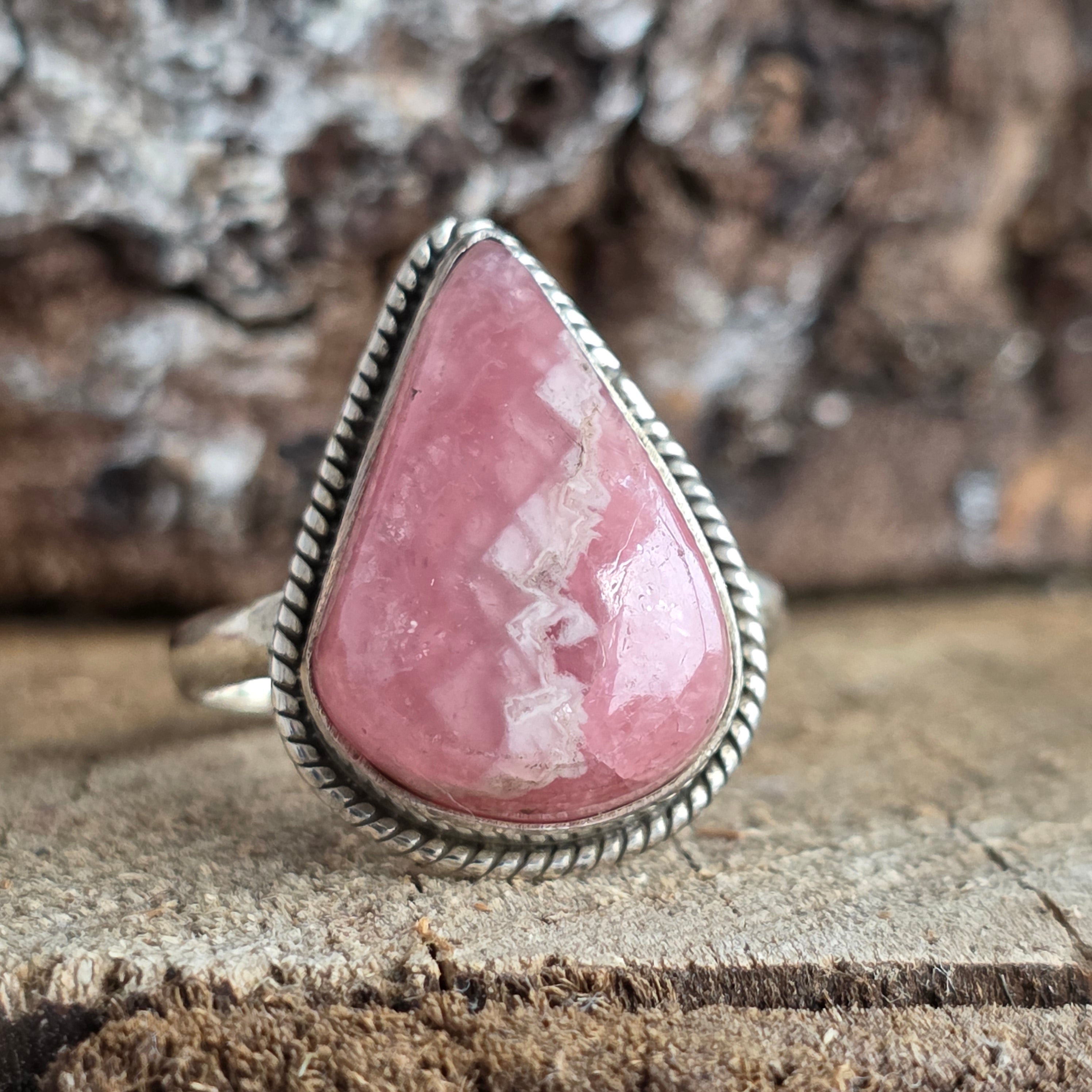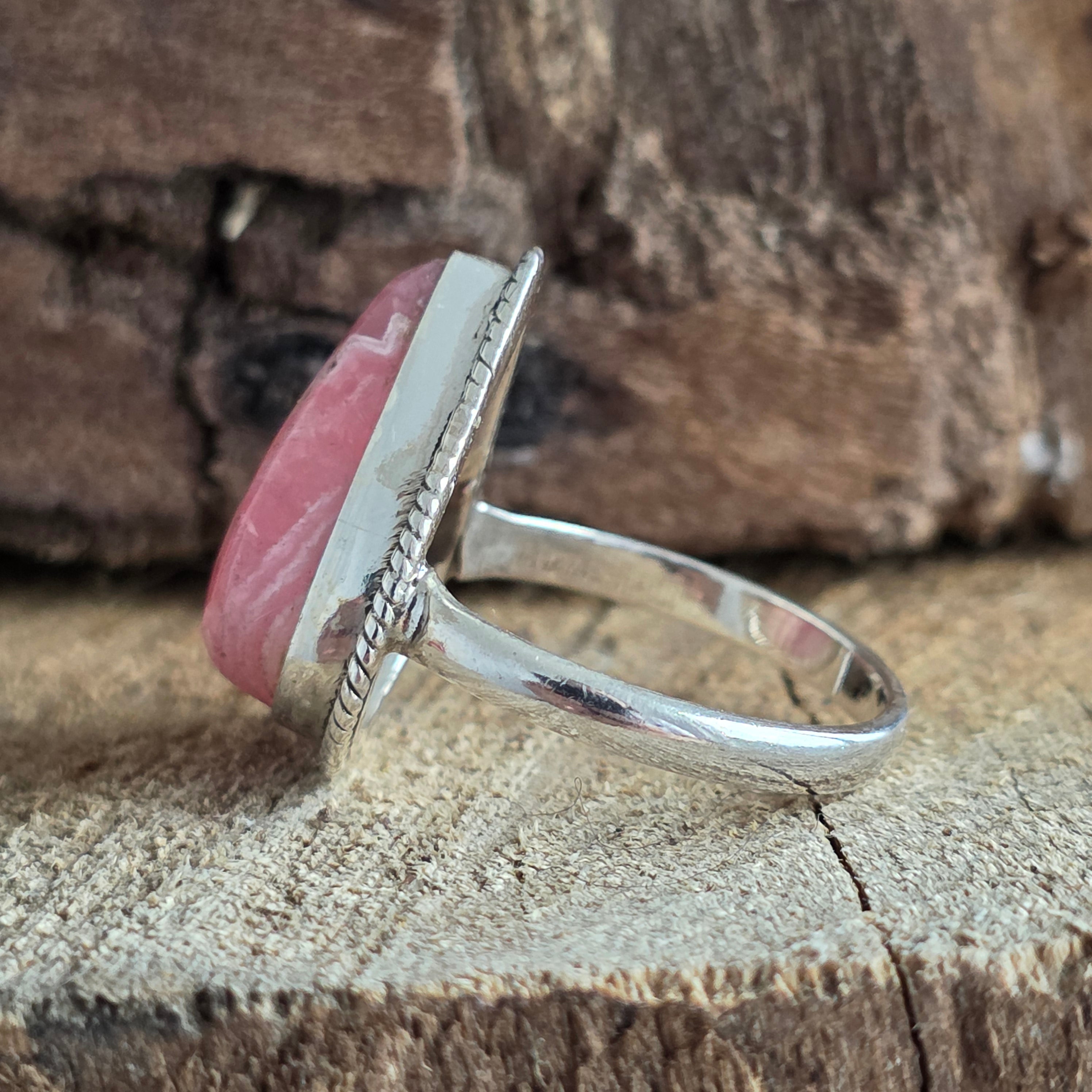 Látványos 925-ös ezüst gyűrű természetes rodokrozittal, meleg rózsaszín és gyöngyházfehér tónusokban. Kézzel készített tartó sodrott drót munka kiemeli a kő természetes báját, alakítva az ékszert egy elegáns és személyiséggel teli darabbá.