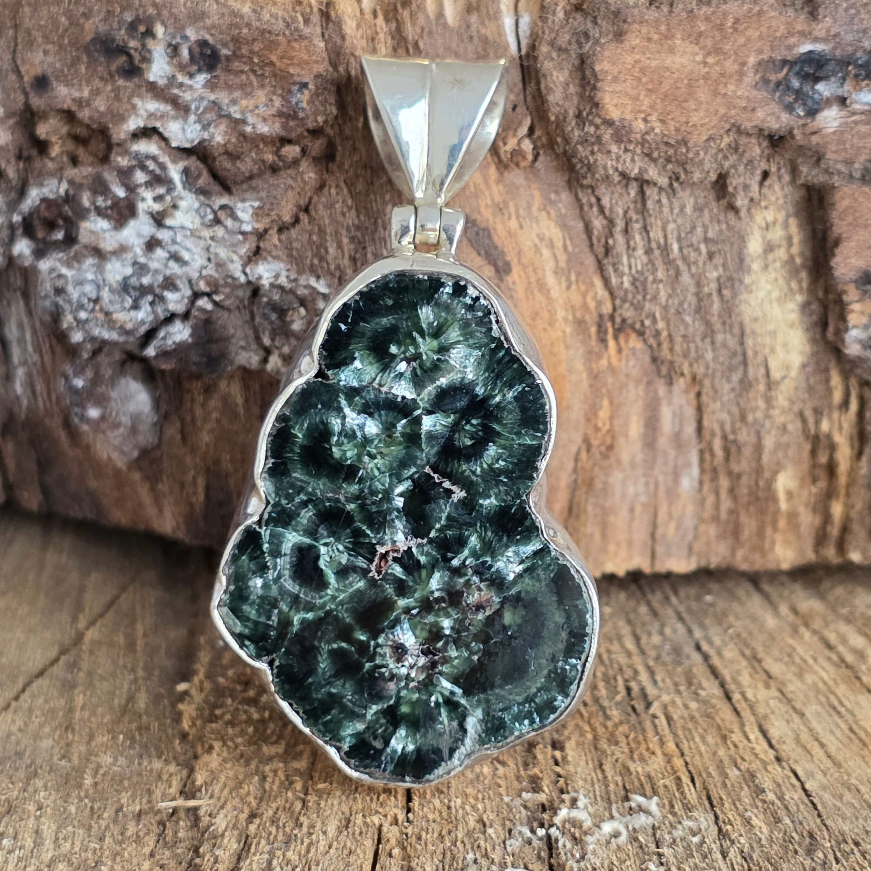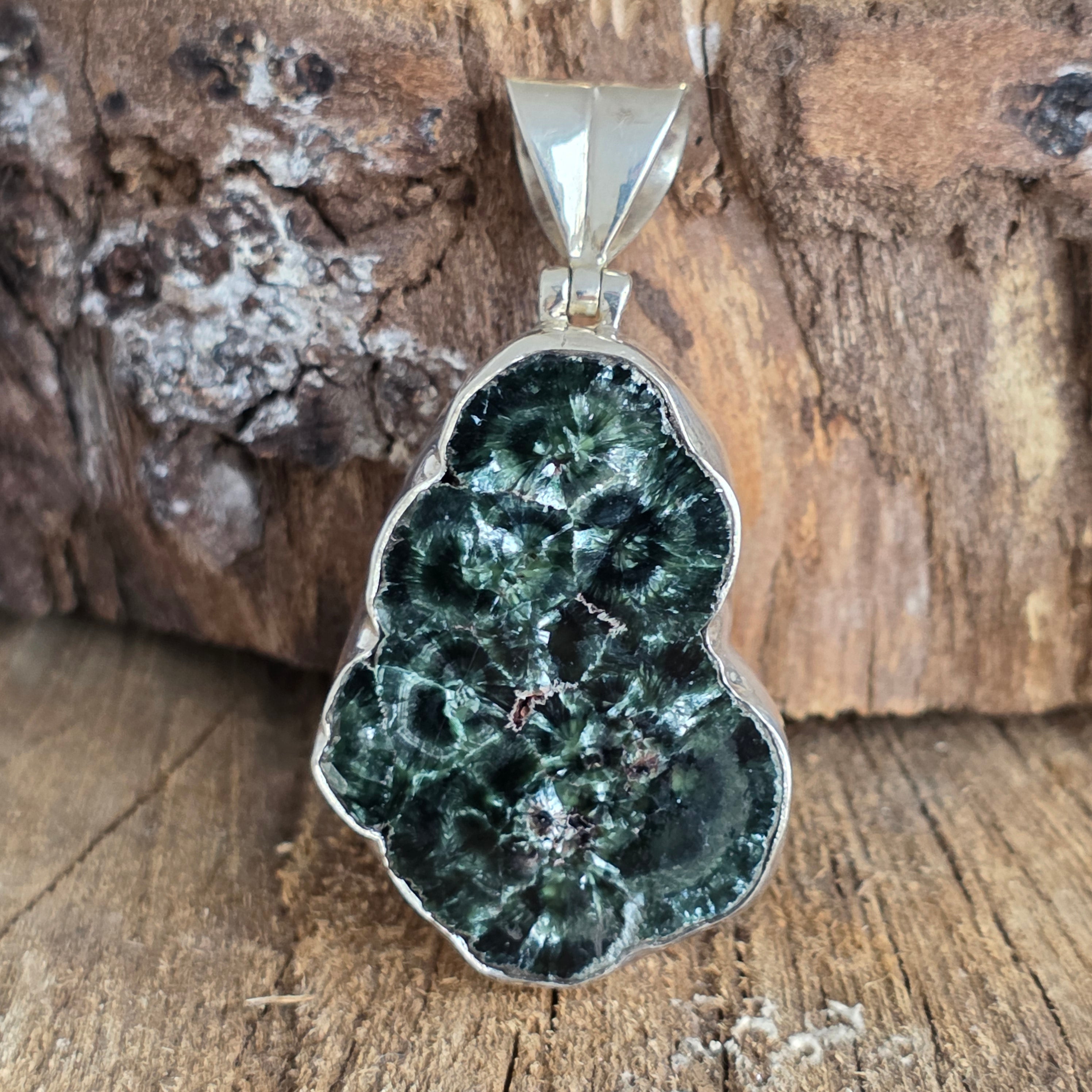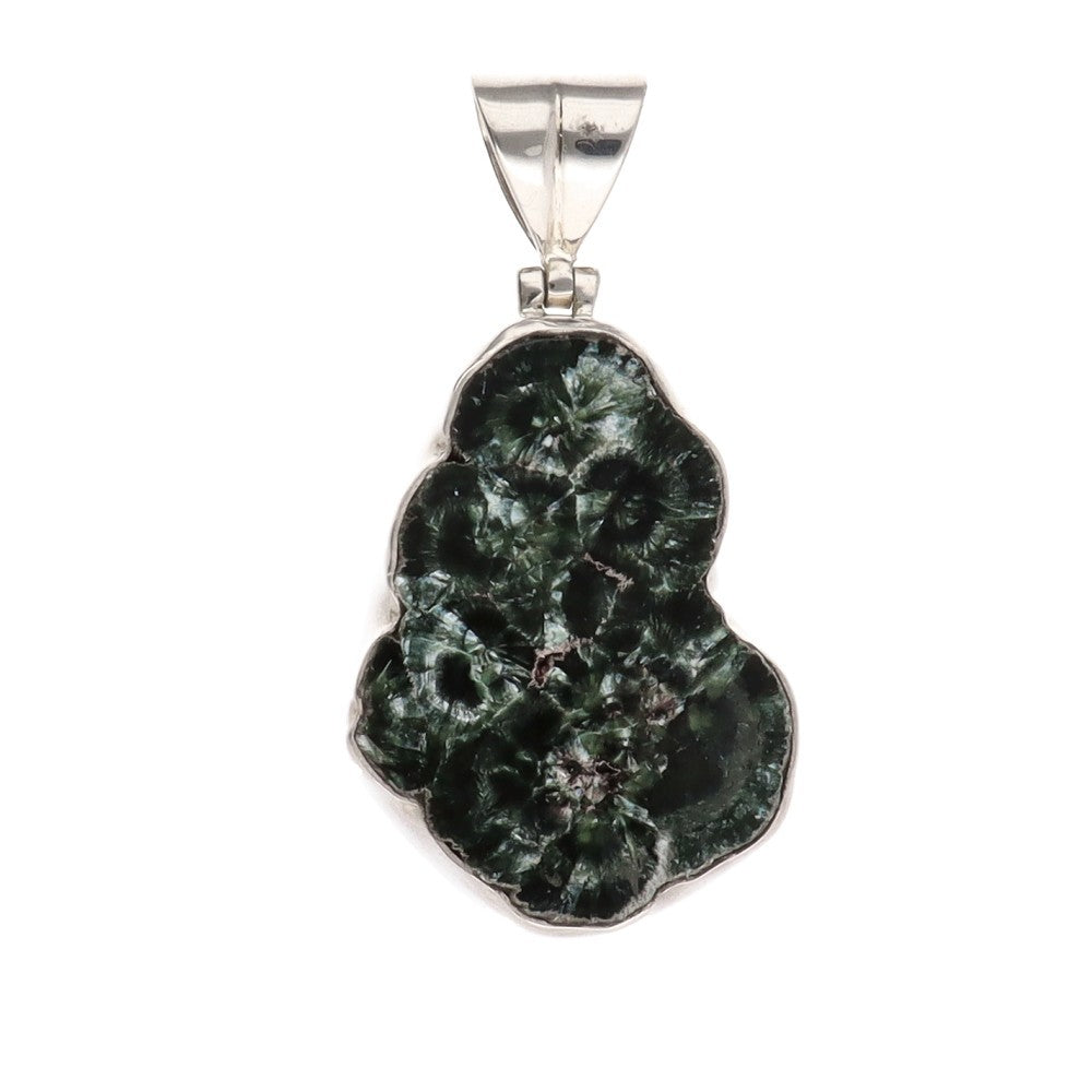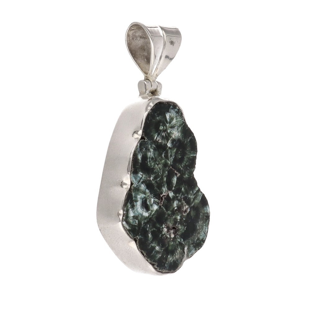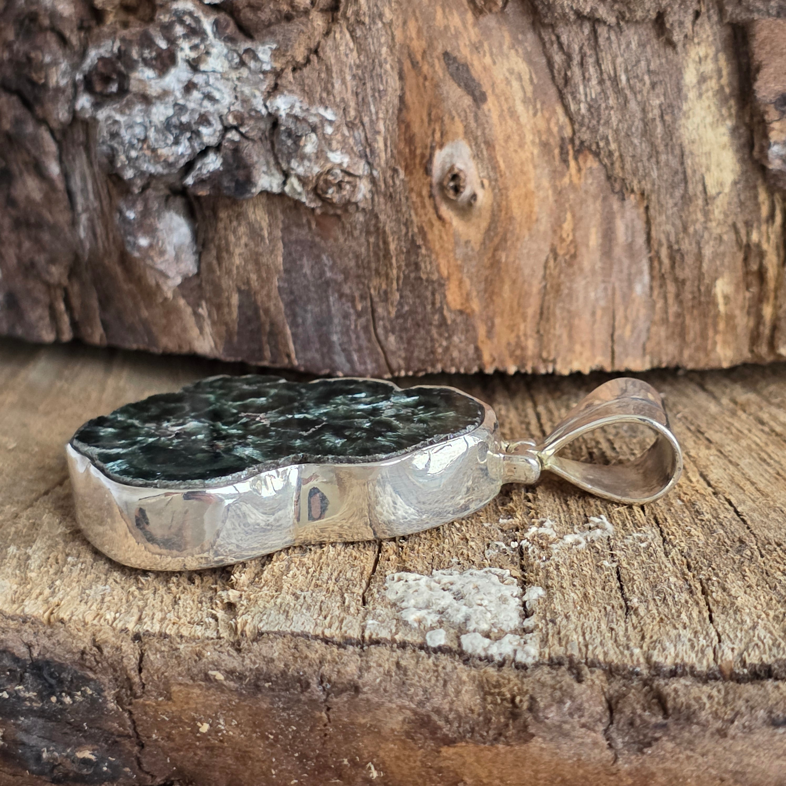 Ez a természetes szerafinit 925-ös ezüst medál egyedülálló ékszer, amely tükrözi ennek a ritka kőnek az angyali szépségét. Mély zöld árnyalatai, melyeket a szárnyak finom tollaira emlékeztető ezüstös fények szövik át, igazán különlegessé teszik ezt a kristályt.