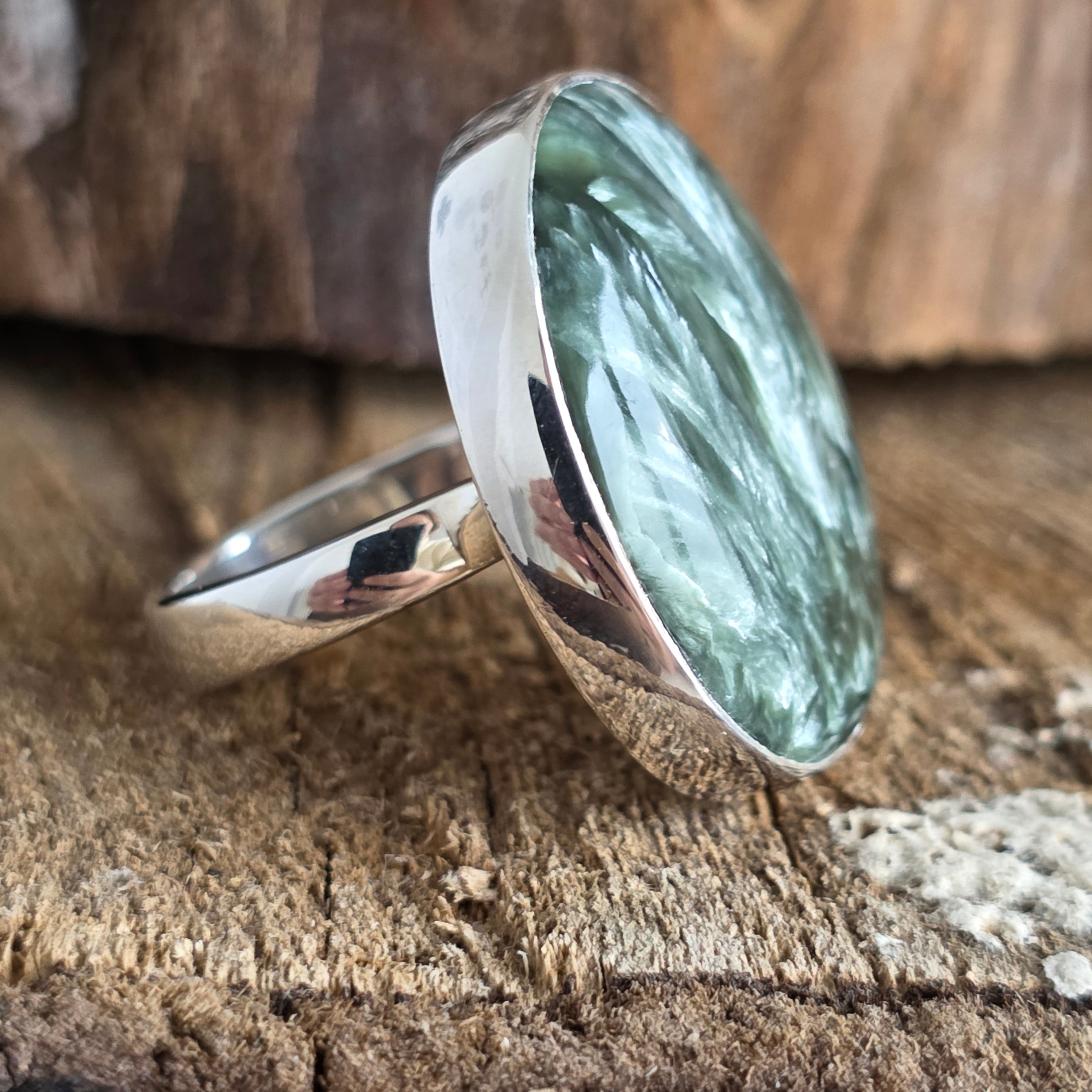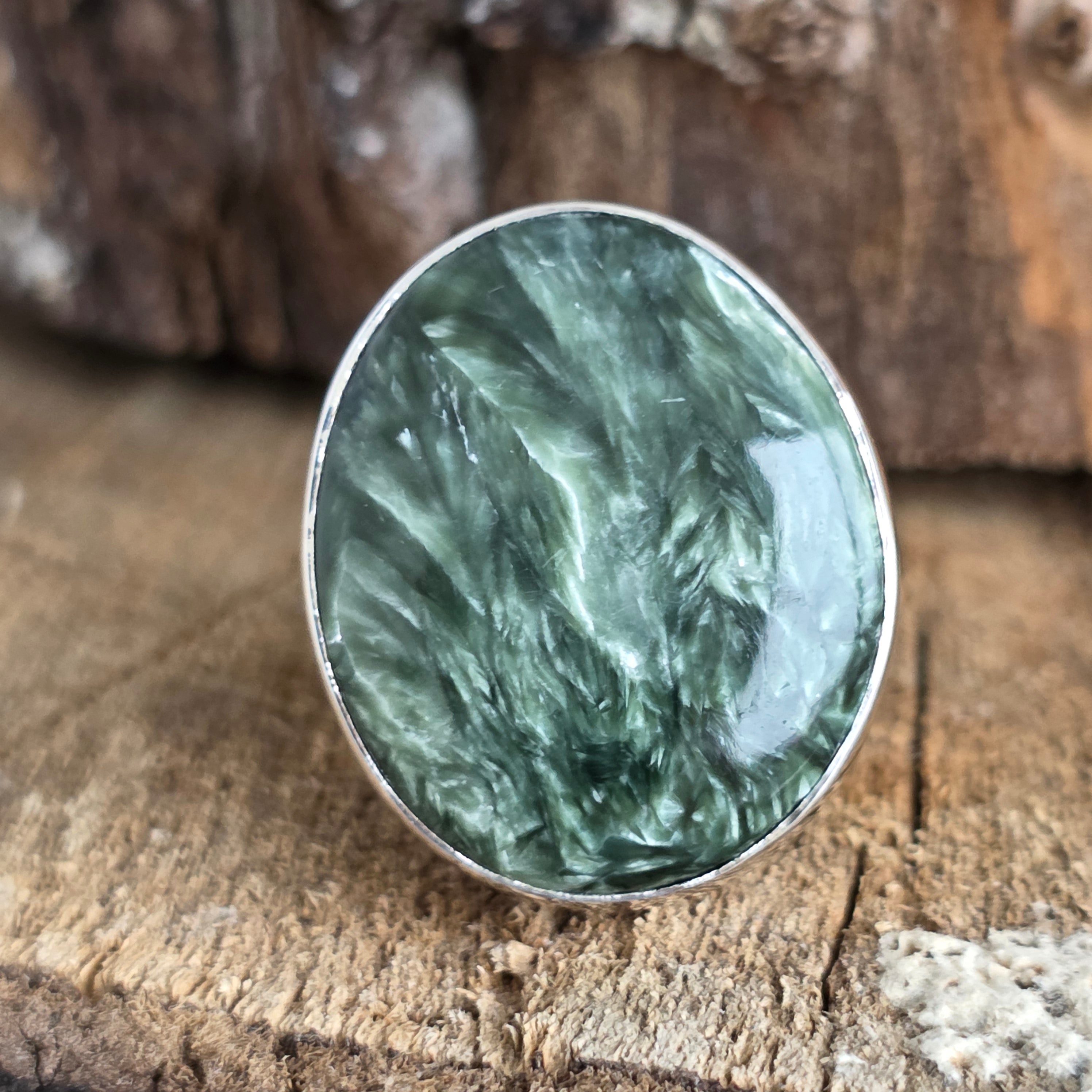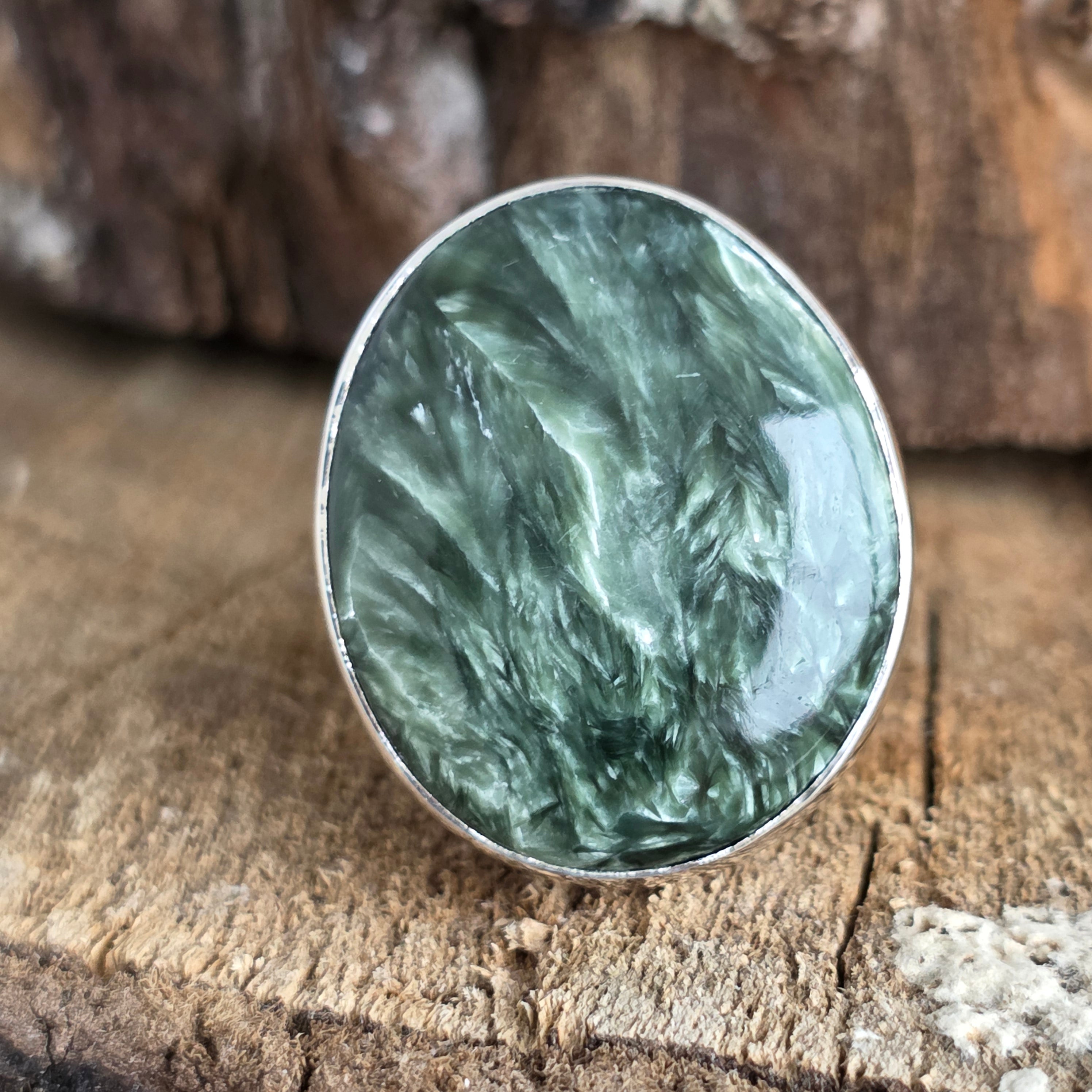- Egy ékszer, amelyet úgy tűnik, megérintett az angyalok szárnya – ez a gyűrű természetes szerafinit különleges fényt bocsát ki, zöld-ezüst visszaverődésekkel, amelyek a szeráfok, a tiszta fényszellemek tollaira emlékeztetnek.