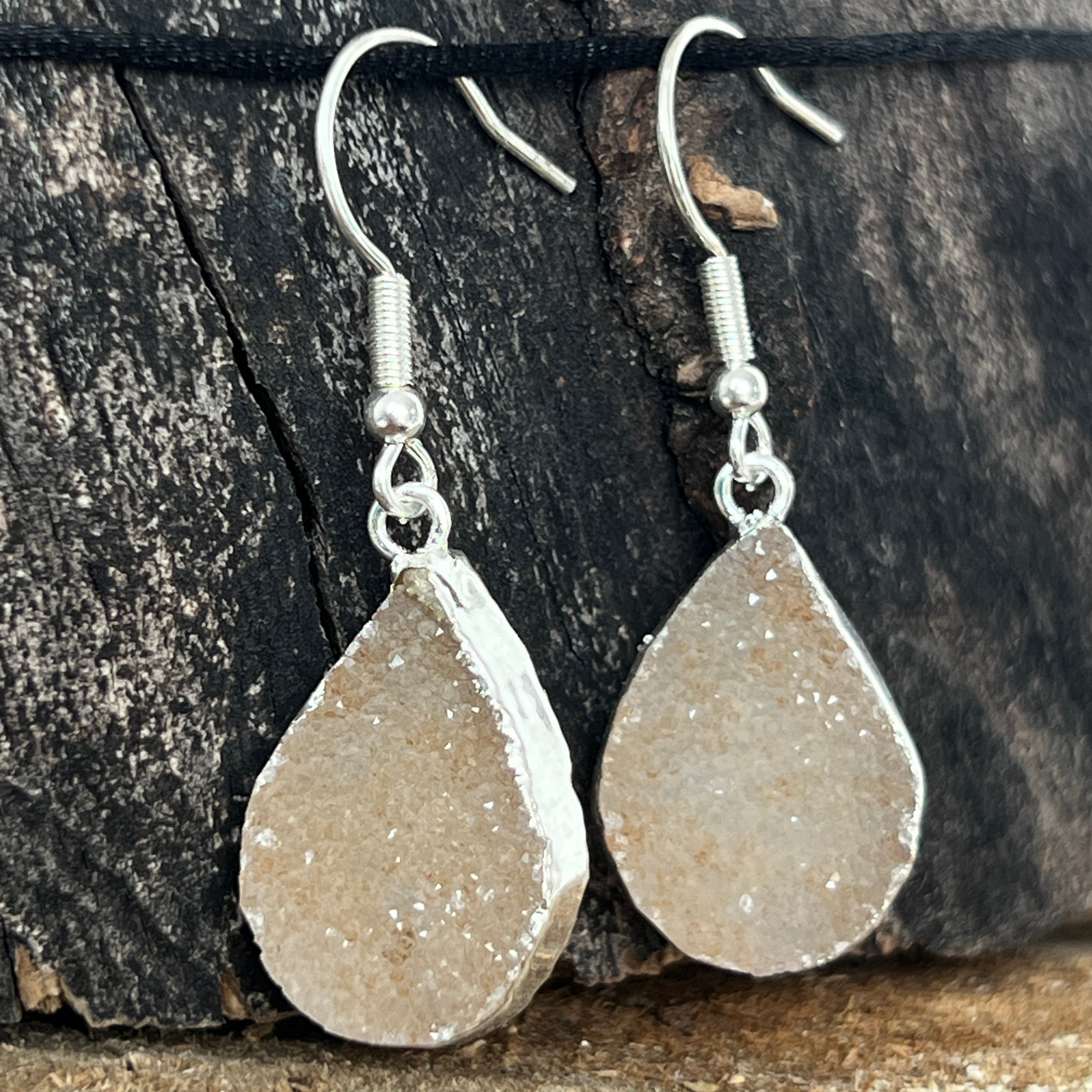 Ezek a természetes drúz jáspis fülbevalók lenyűgöznek kristályos textúrájuk és csillogó fényjátékaik révén, minden pár egyedi a kövek fényében megjelenő játék miatt. Az elegáns design, amelyet az ezüstbevonatos foglalat kiegészít, alkalmassá teszi őket mindennapi viseletre, mind pedig különleges alkalmakra.