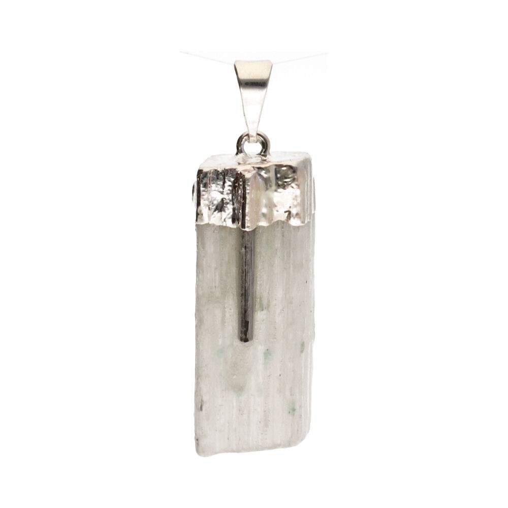 Az ezüstözött turmalinos szelenit medál összekapcsolja a szelenit tiszta fényét a fekete turmalin védelmező energiájával, amelyet az ezüst csillogása felerősít.