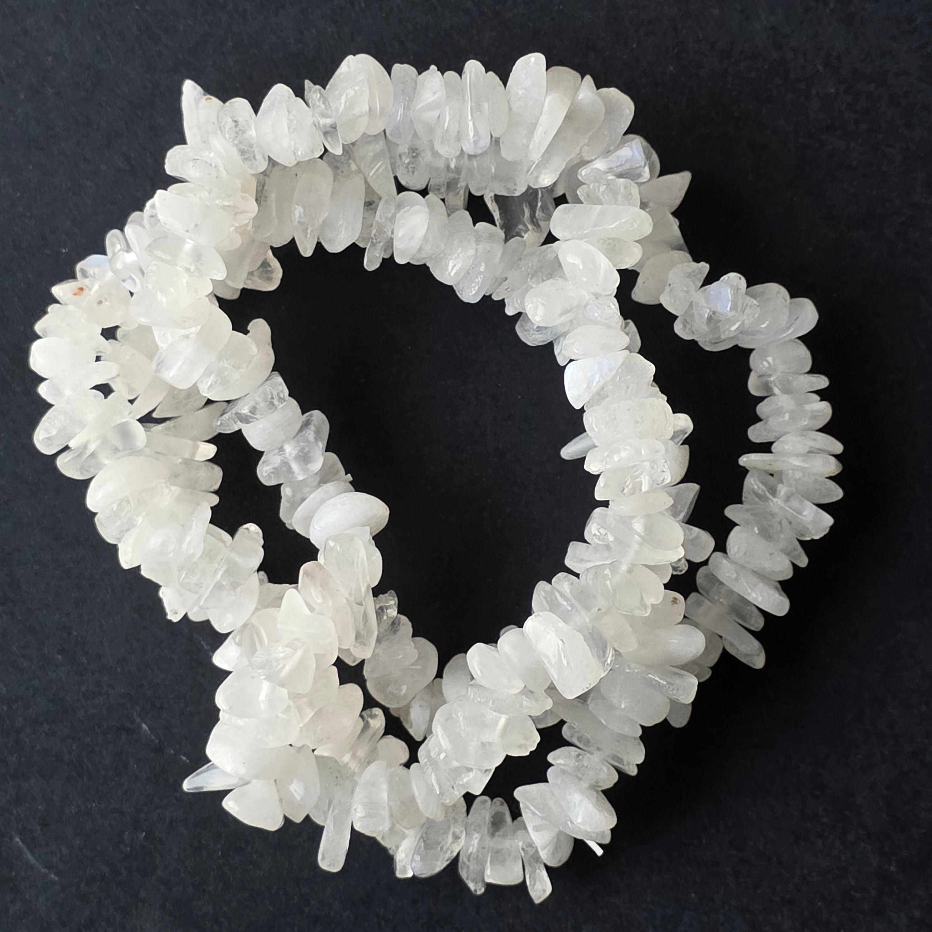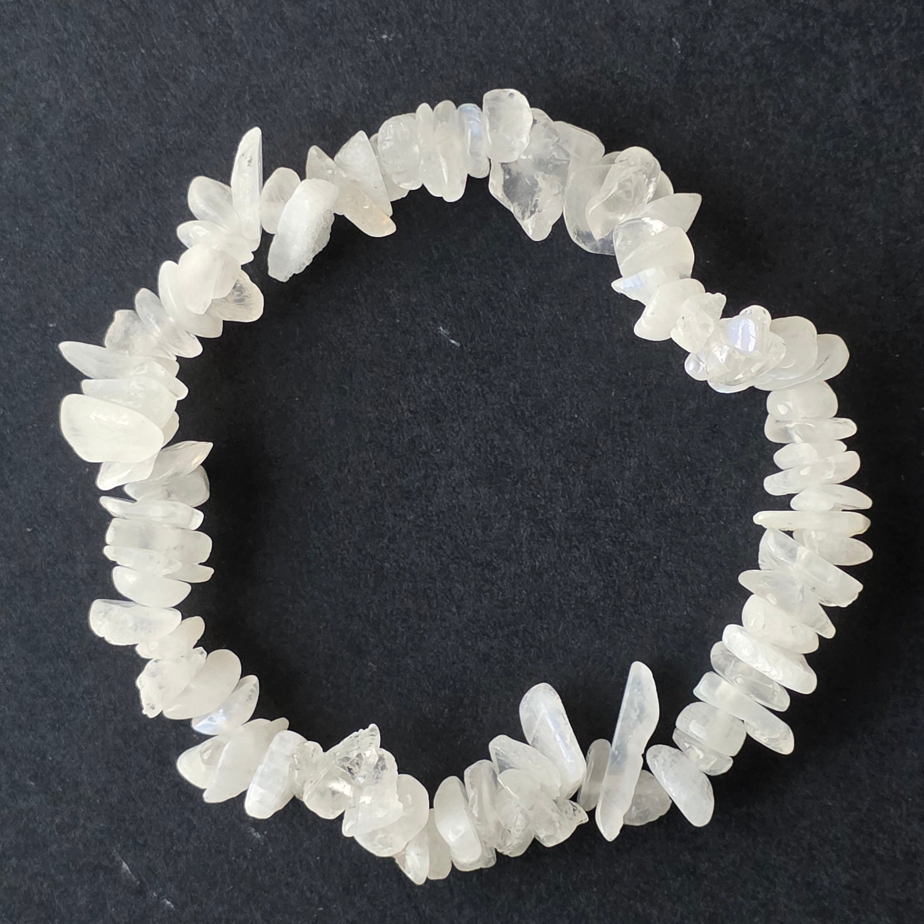 Egy karkötő, amely úgy tűnik, mintha egy nyugodt reggel fényéből vágták volna ki, ahol a fehér nemcsak a szín, hanem kezdet, tisztaság és ígéret. A fehér holdkő chips, finom és szándékosan tökéletlen, harmonikus körbe áll, mint az egymáshoz érő fények sora egy csendes táncban.