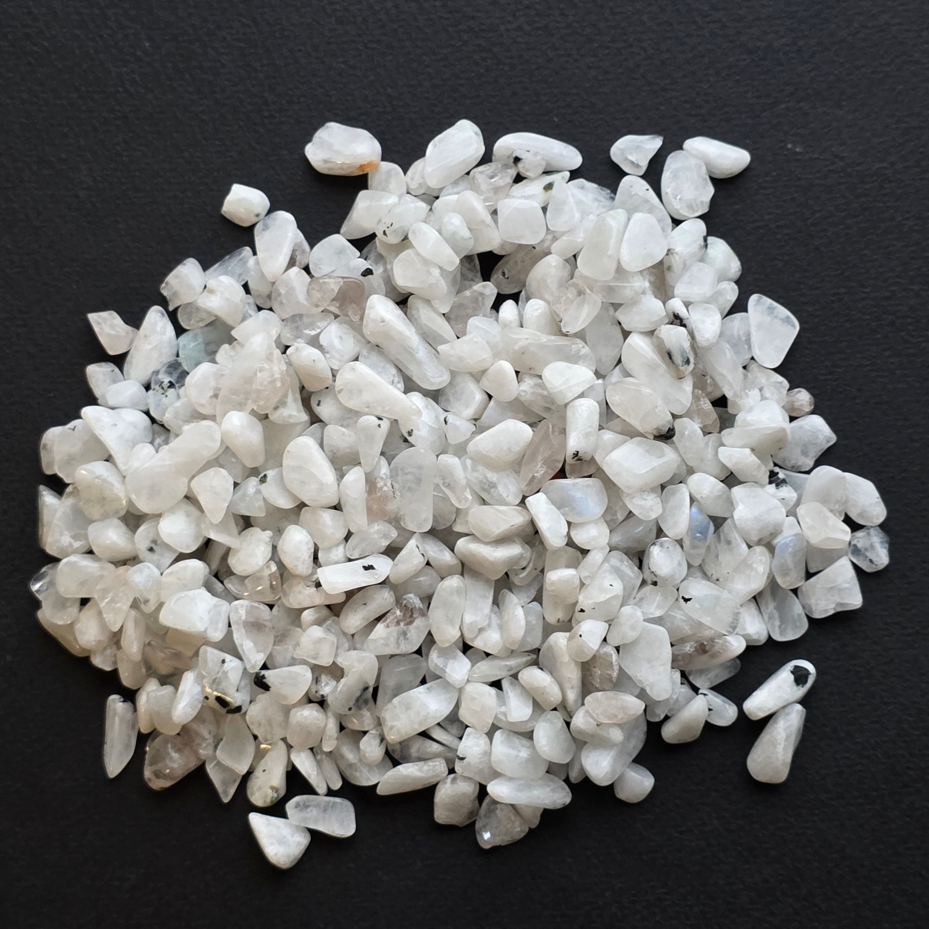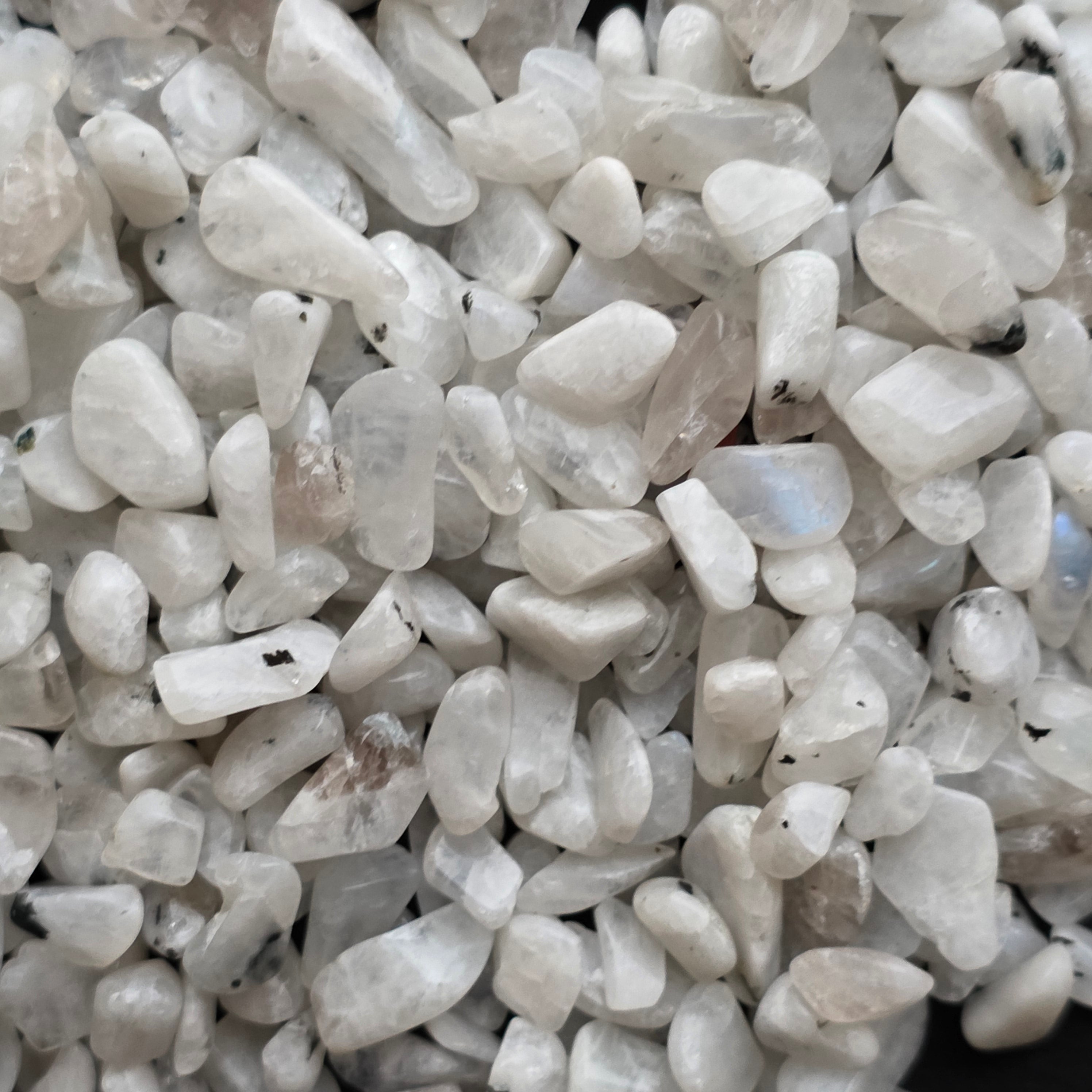 A fehér holdkő híres diszkrét, átlátszó visszatükröződéseiről, amelyek mintha finom belső fényt rejtenének. A darabok formájában ezek a kis és finom töredékek megőrzik a kő természetes báját, fehér, tejes és áttetsző tónusokkal, néha finom irizálóval, amely a hold fényére emlékeztet a tiszta égbolton.