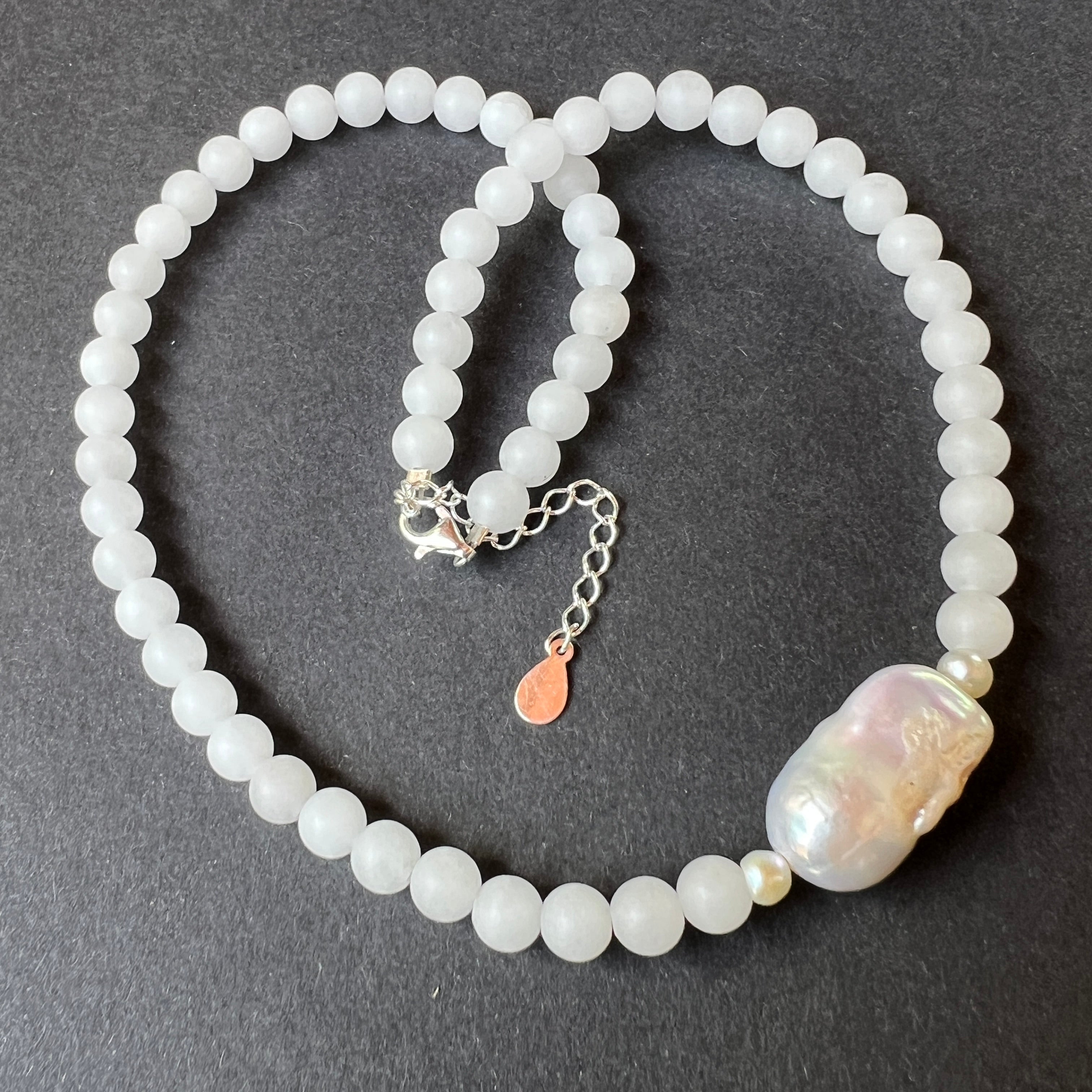 Anyagok: fehér jade 6 mm, barokk gyöngy 2 cm, 925 ezüst