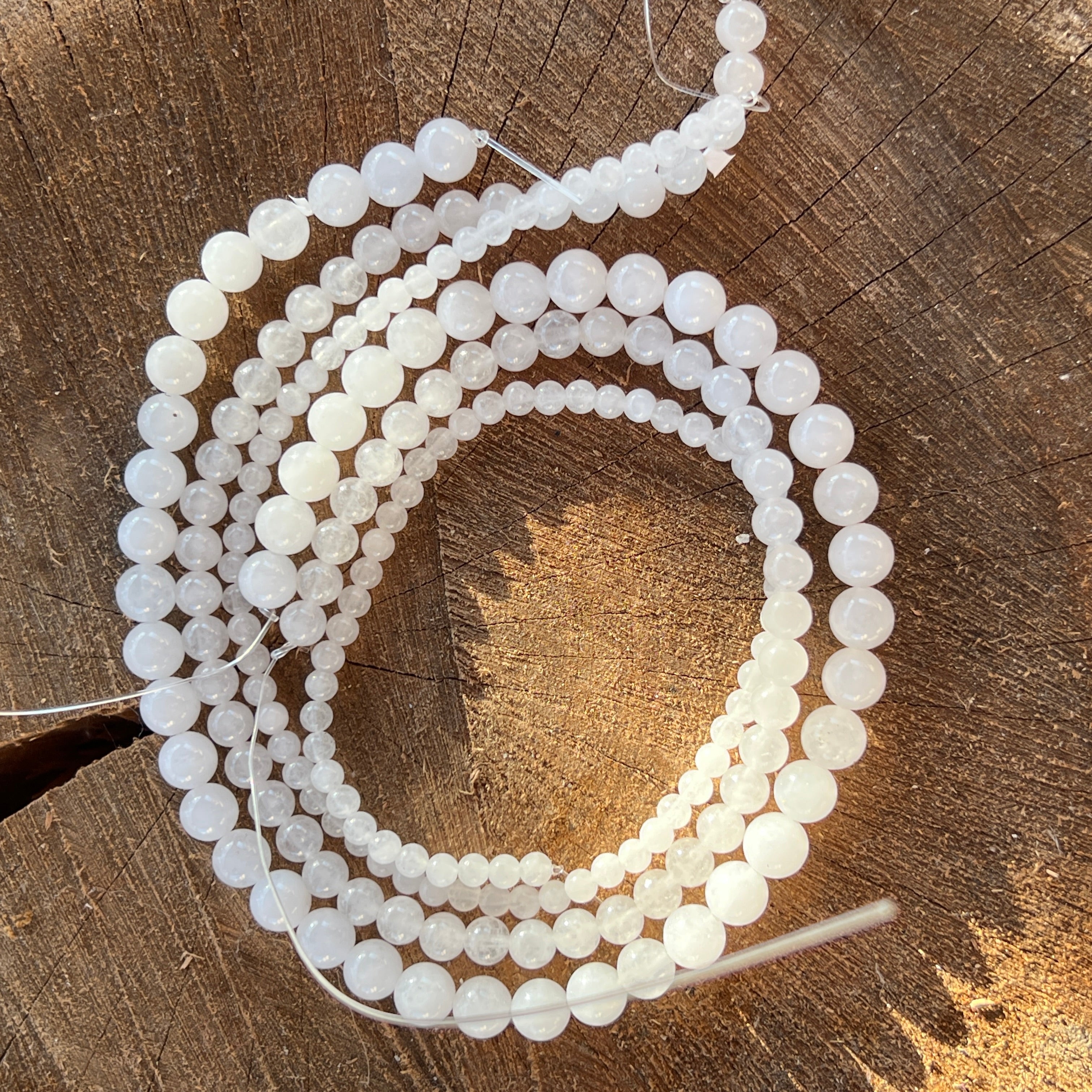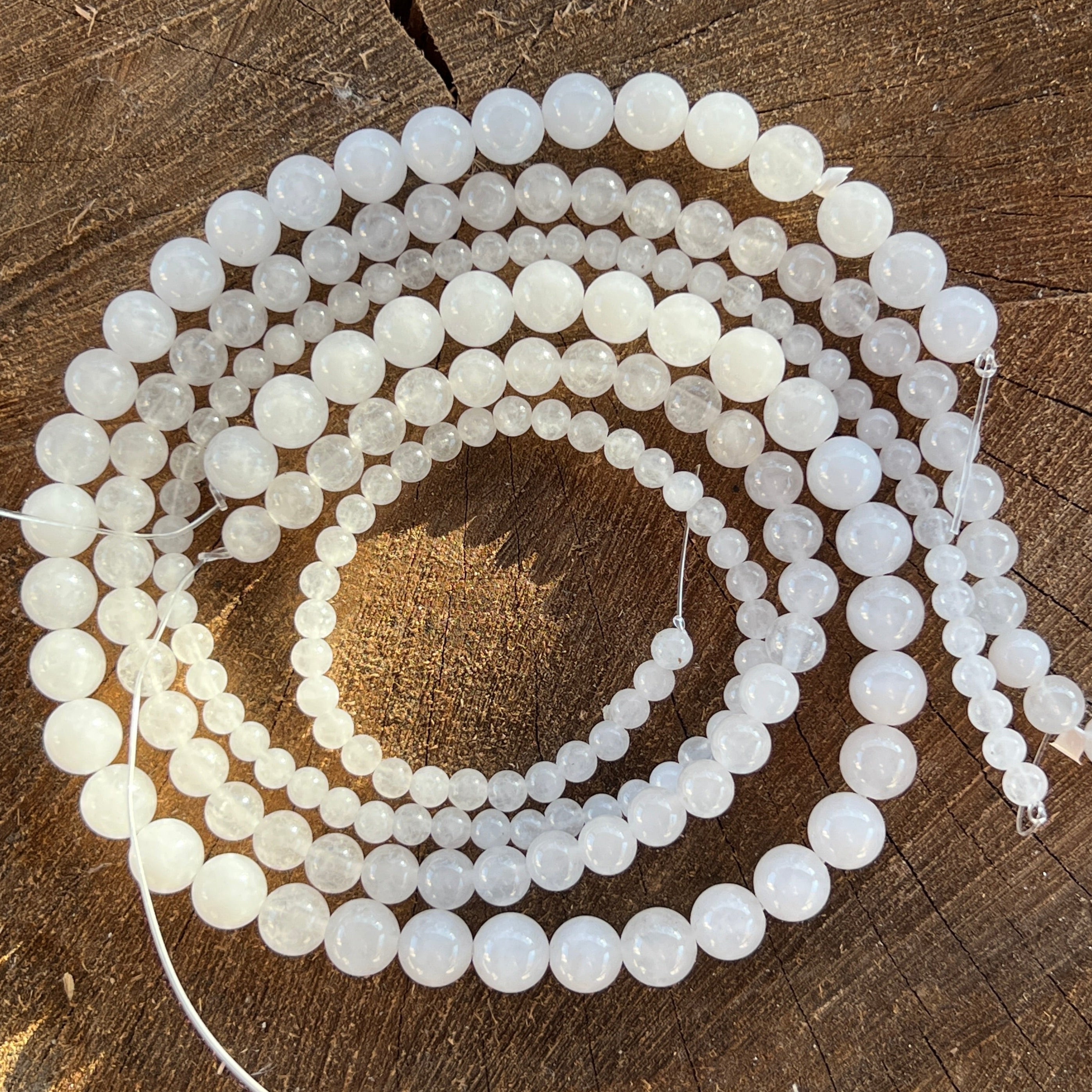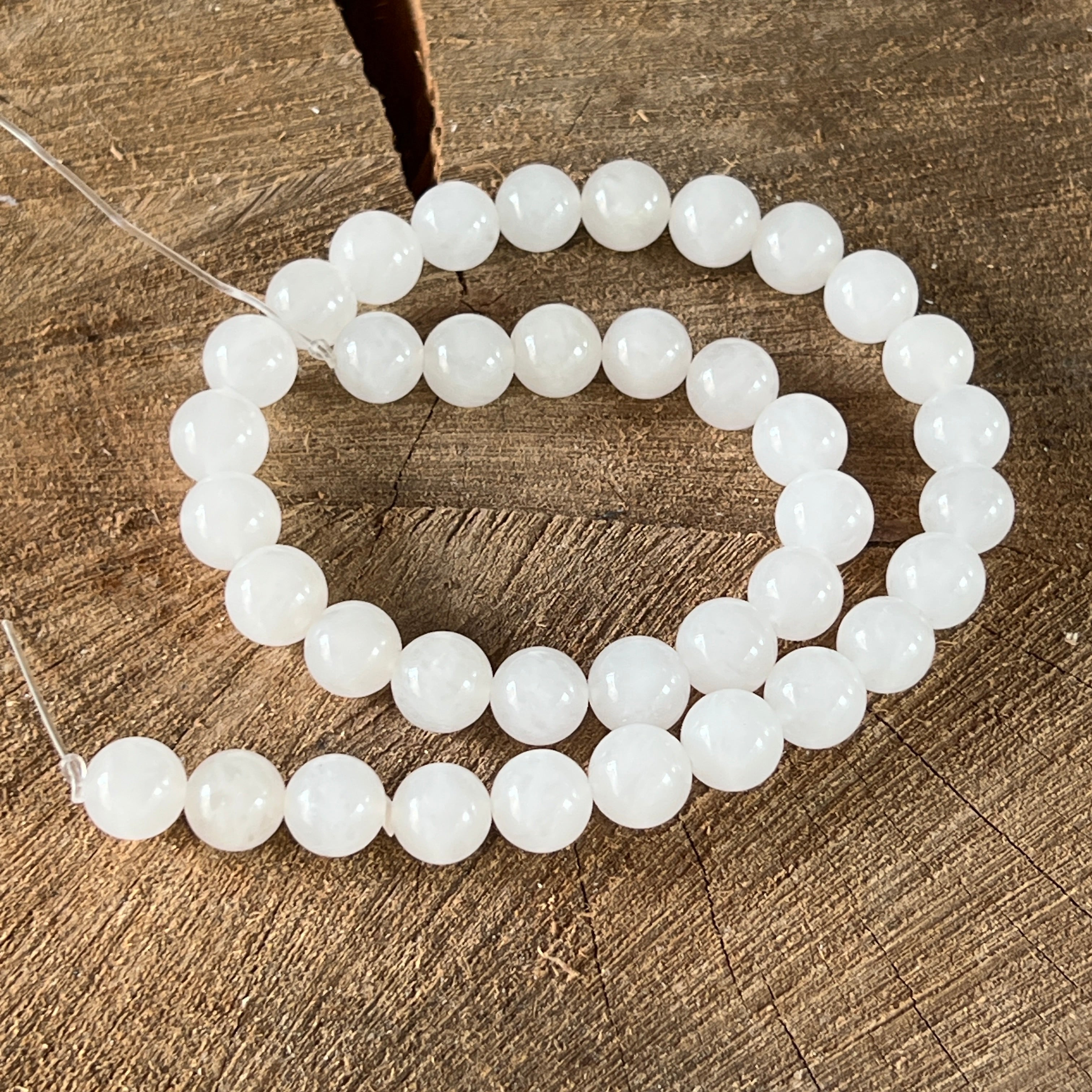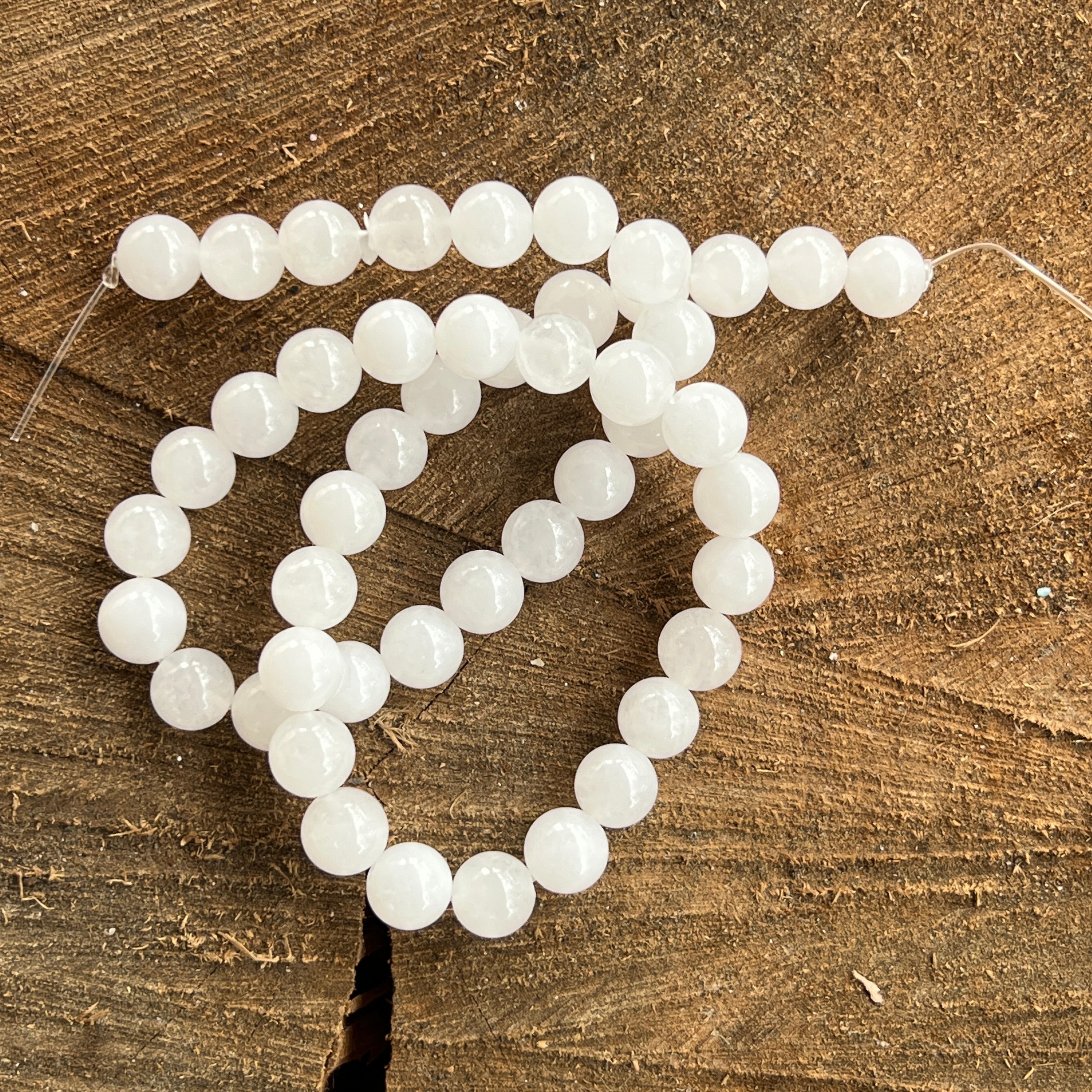 Fehér JÁDE gyöngysor, amely természetes gömb alakú gyöngyökből áll, tökéletes nyakláncokhoz, karkötőkhöz vagy más kézműves ékszerekhez.