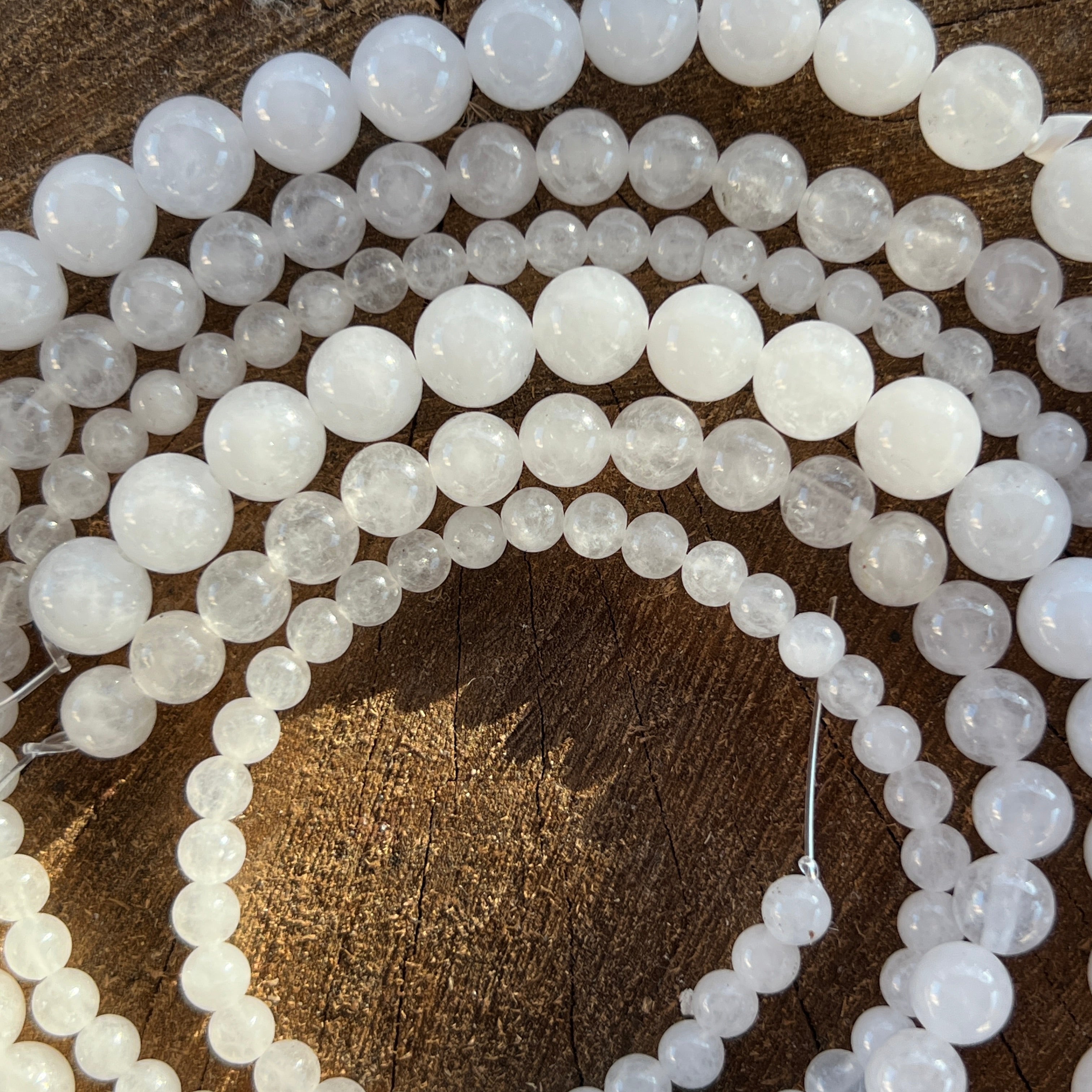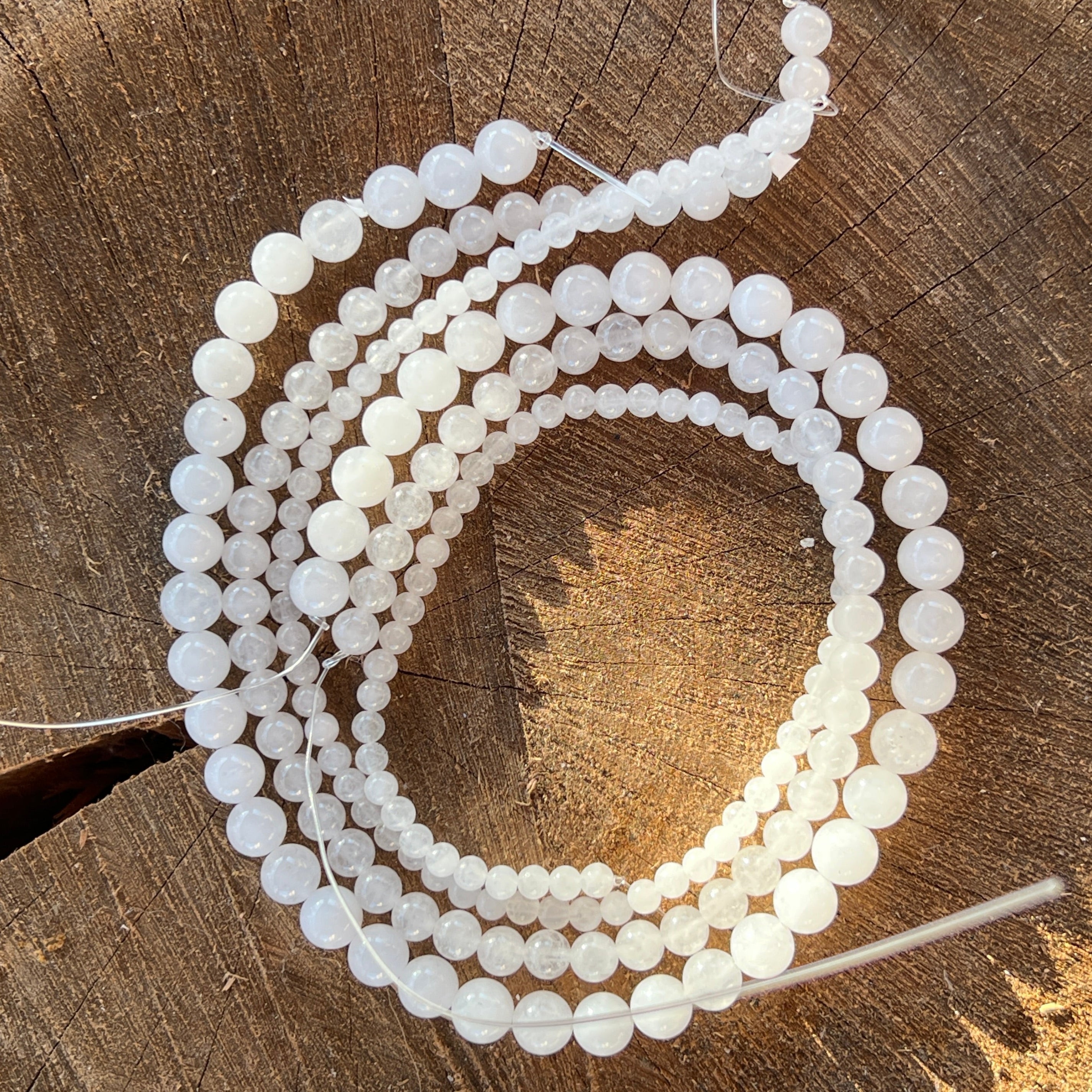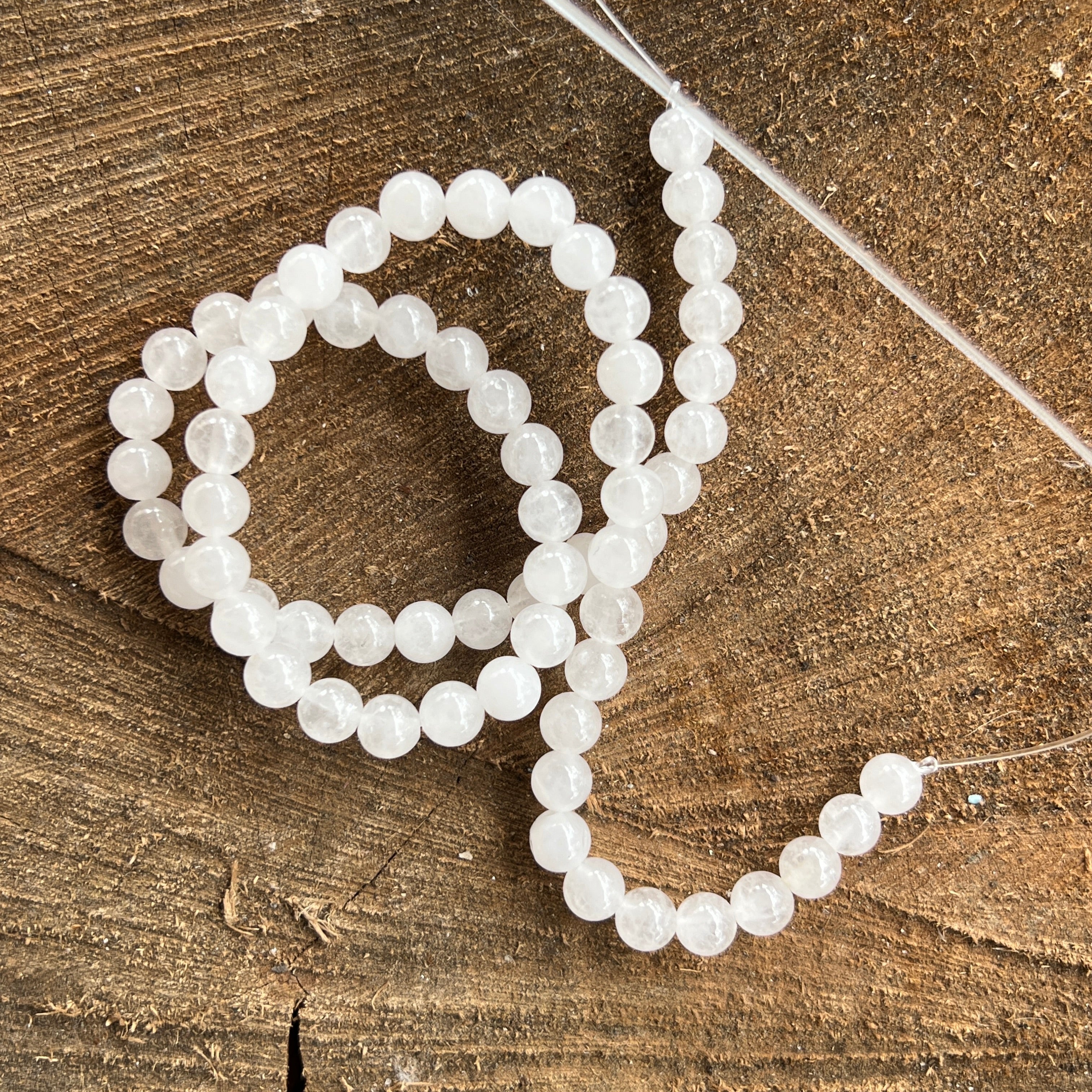 Fehér JÁDE gyöngysor, amely természetes gömb alakú gyöngyökből áll, tökéletes nyakláncokhoz, karkötőkhöz vagy más kézműves ékszerekhez.