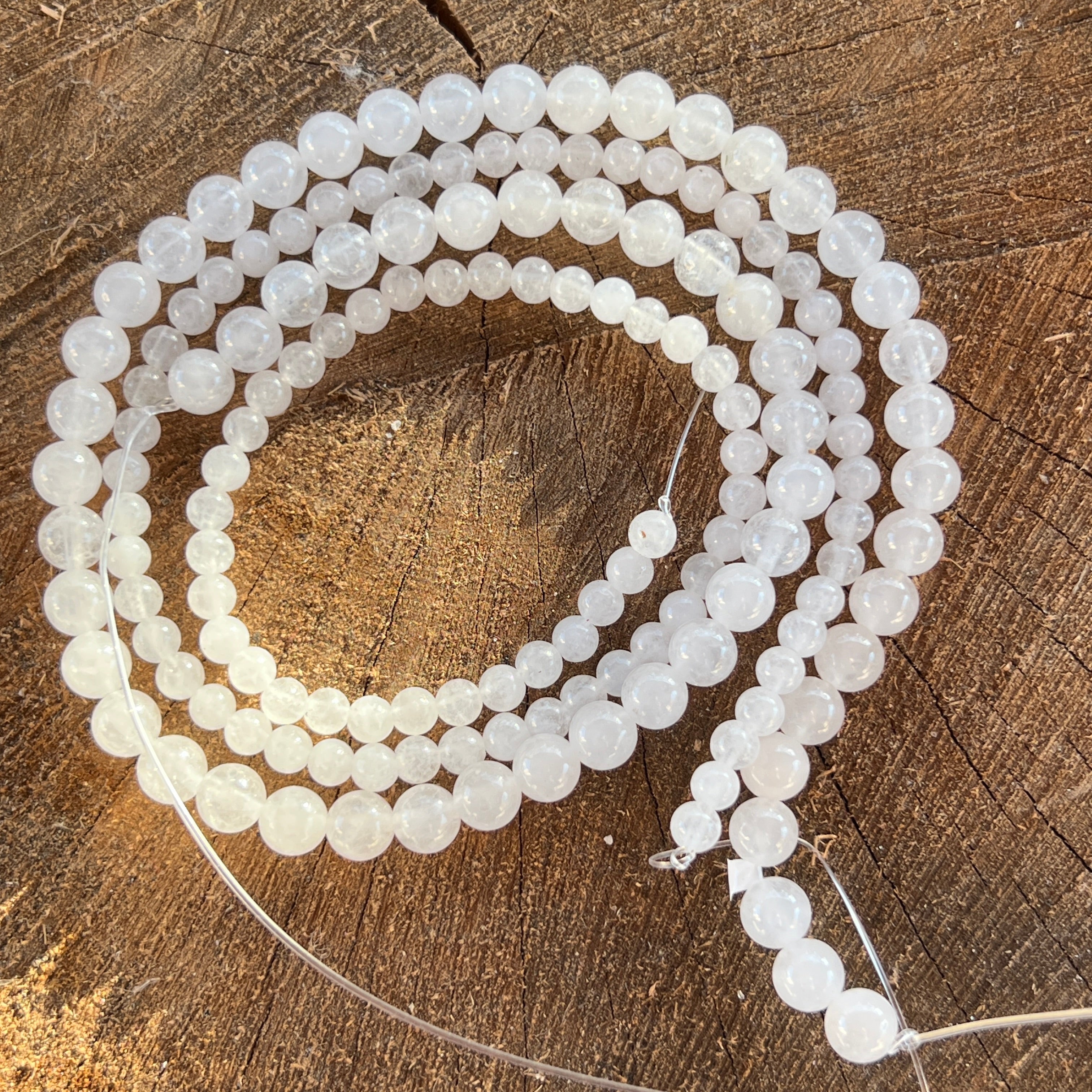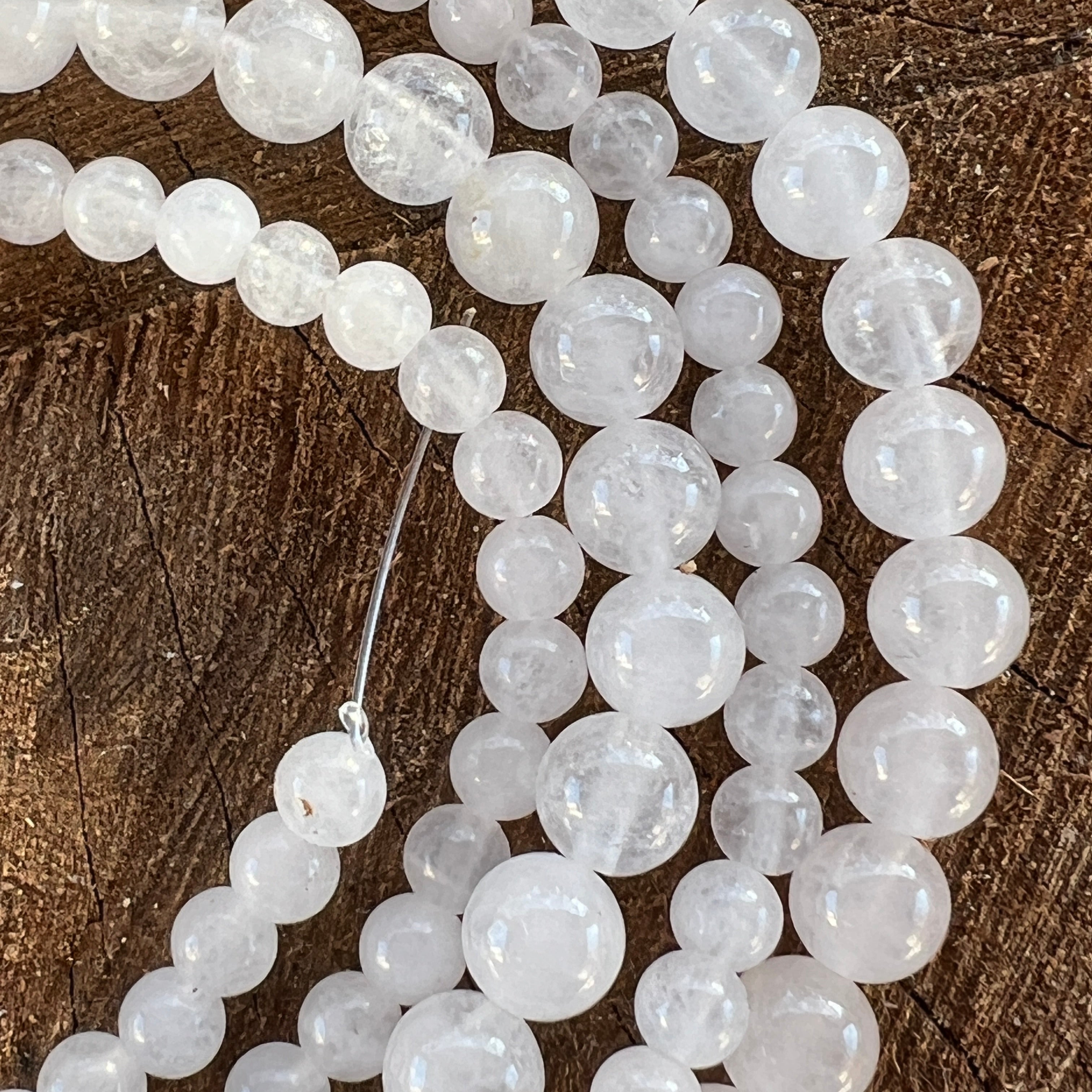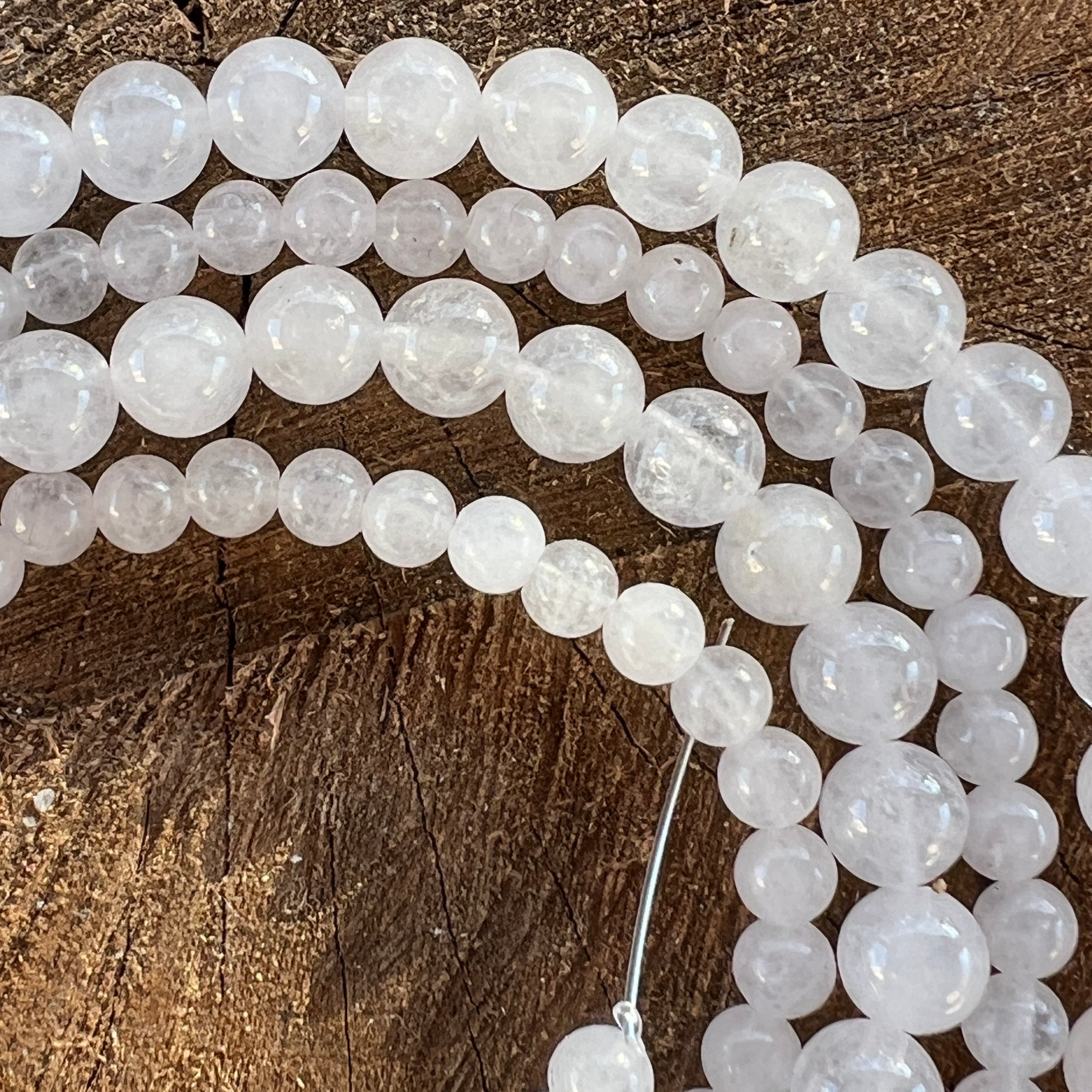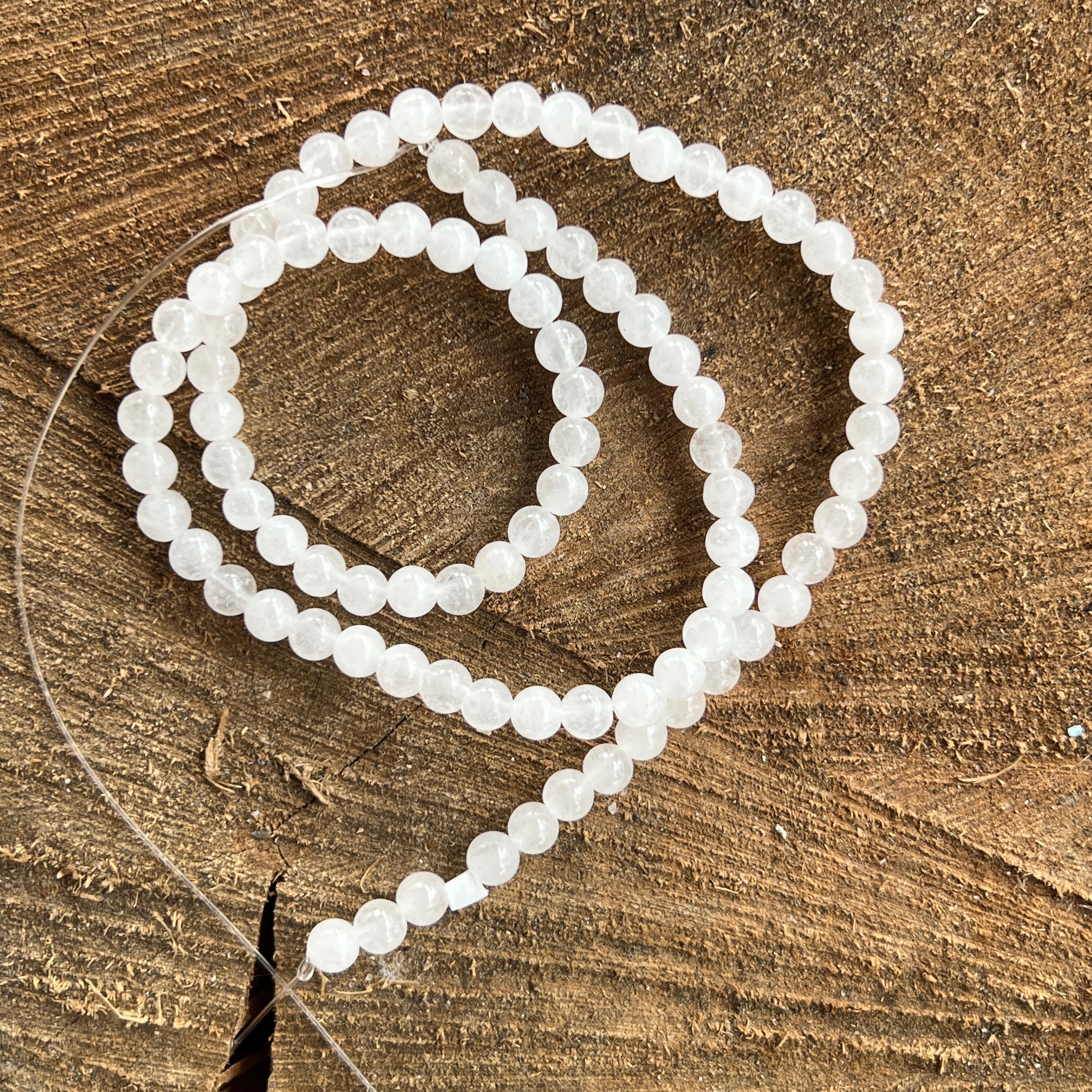 Fehér JÁDE gyöngysor, amely természetes gömb alakú gyöngyökből áll, tökéletes nyakláncokhoz, karkötőkhöz vagy más kézműves ékszerekhez.