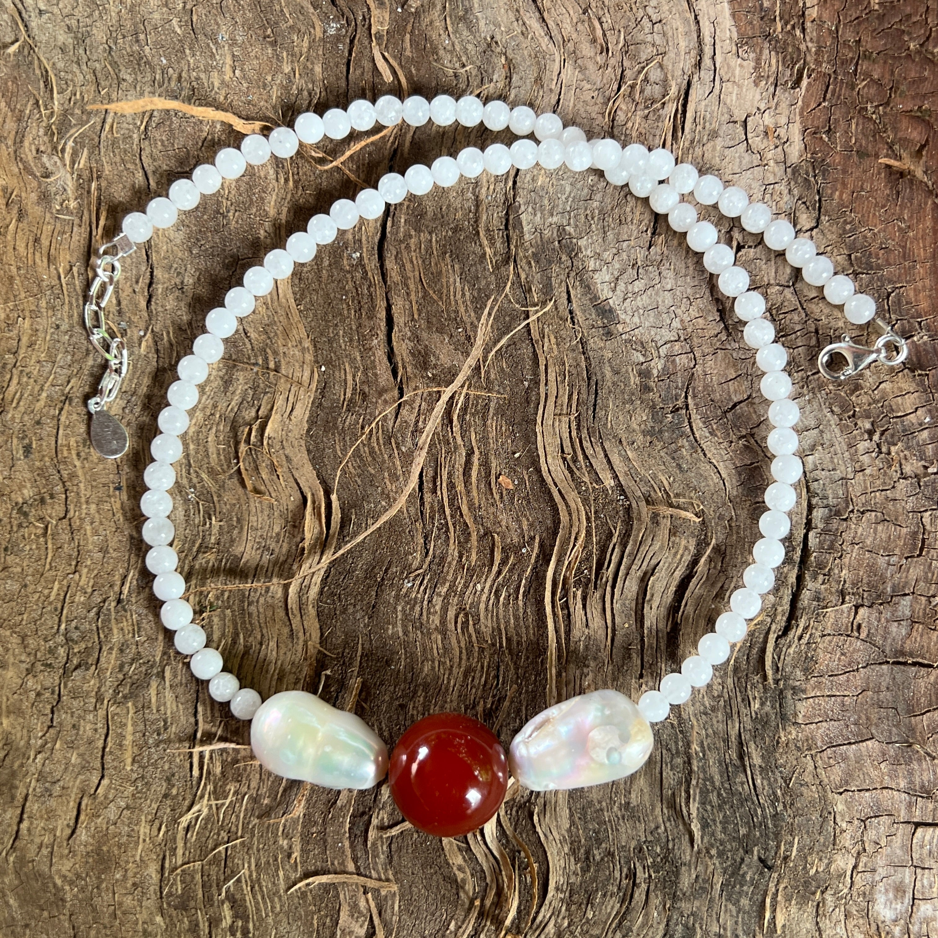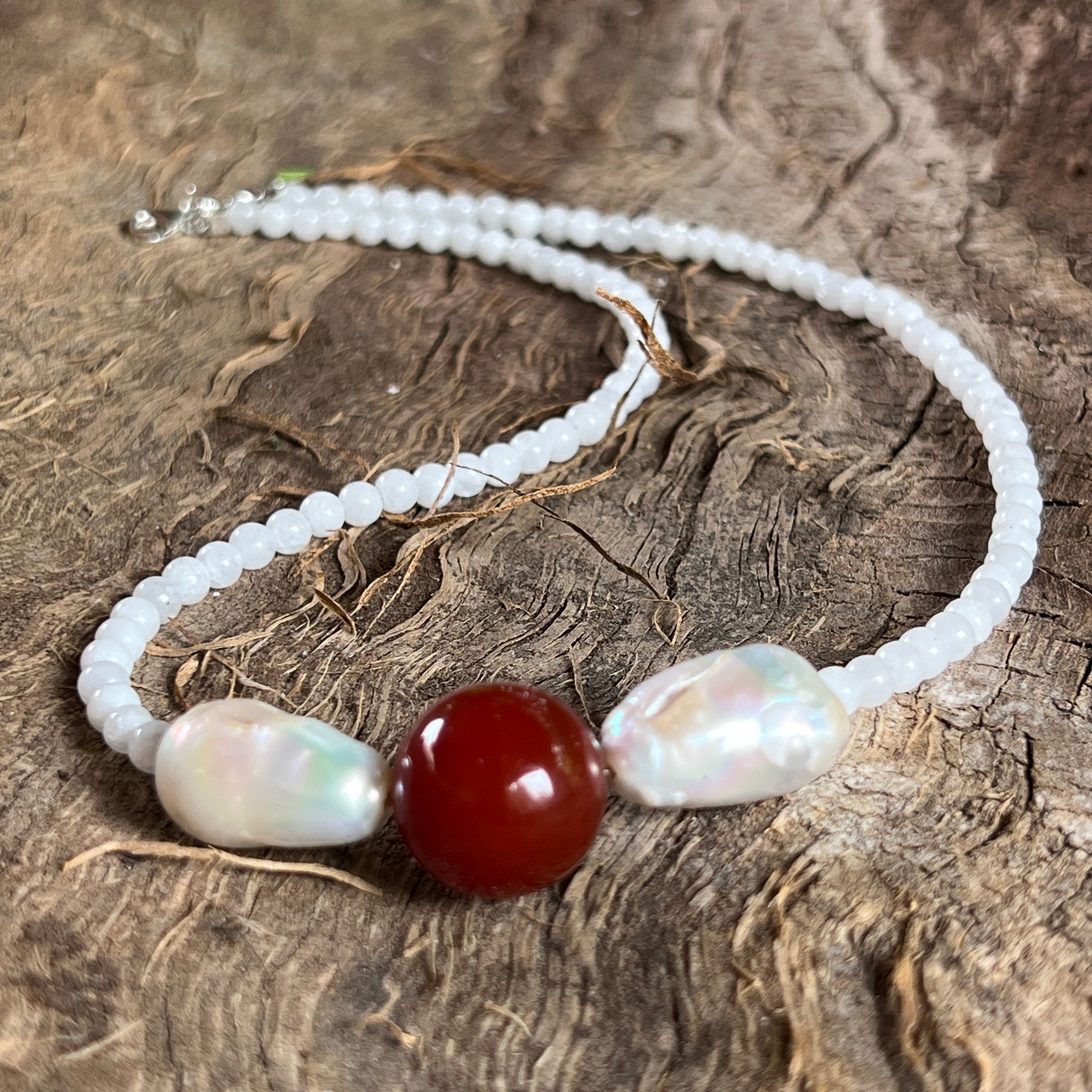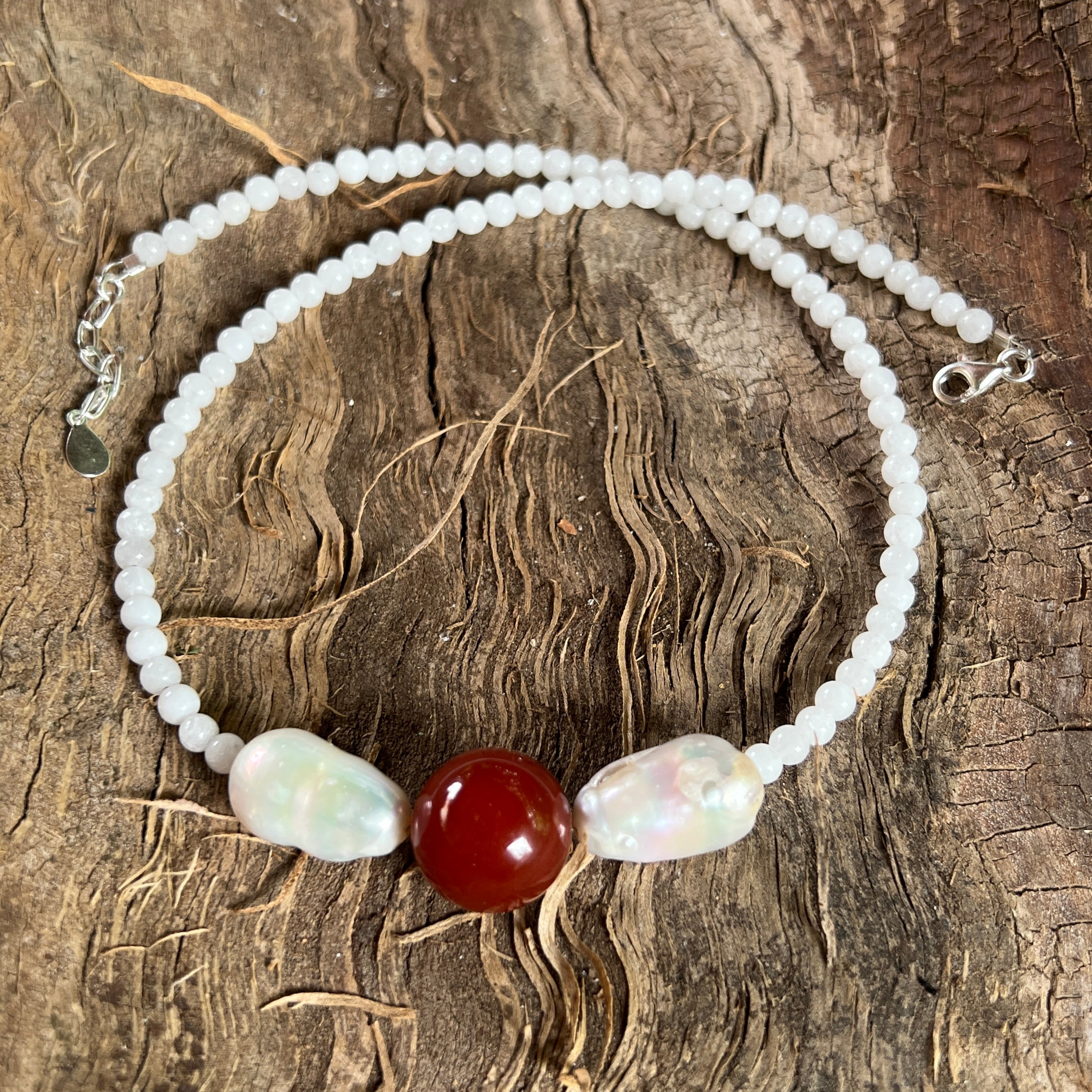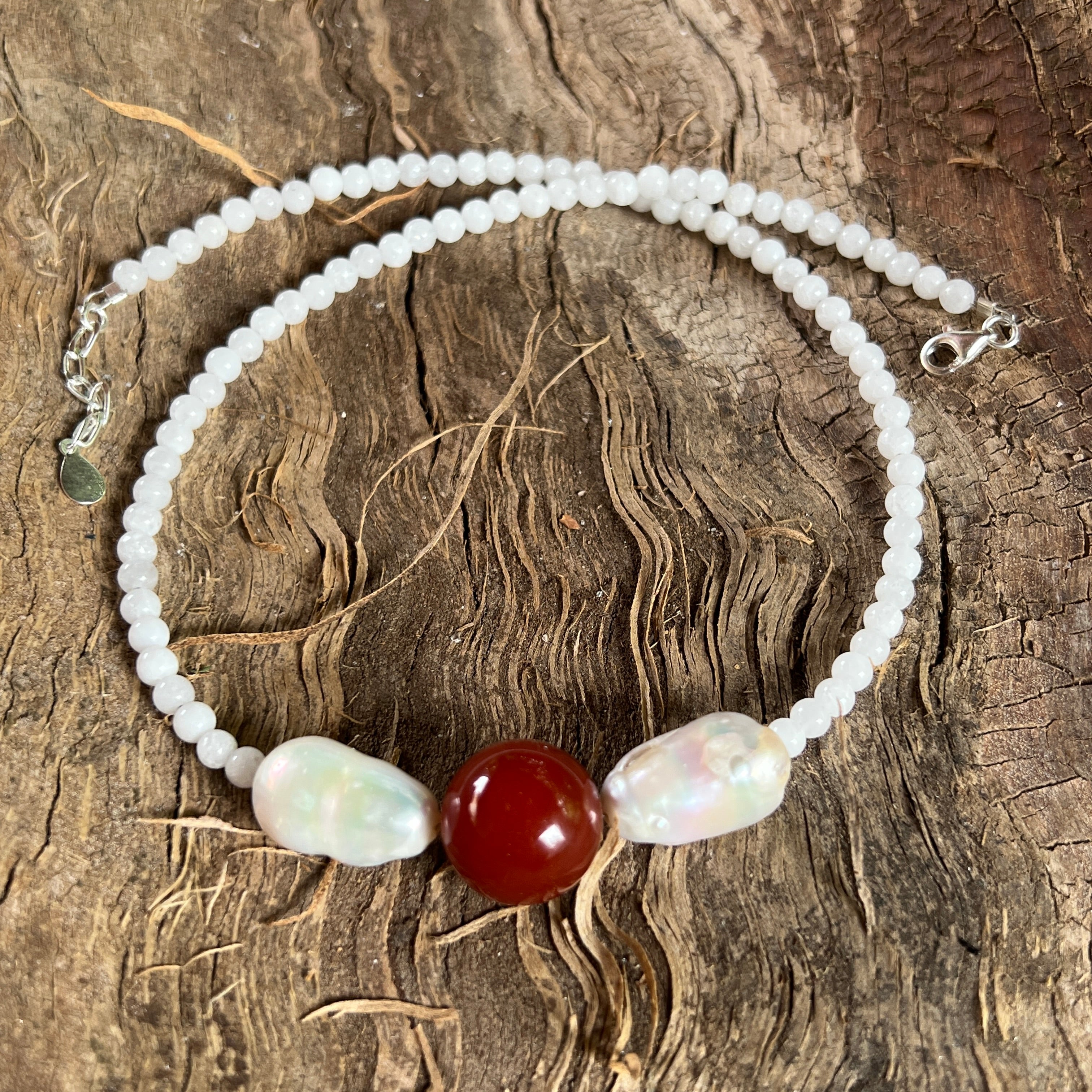 Fehér jáde, gyöngy és karneol nyaklánc, Rooted Glow#15