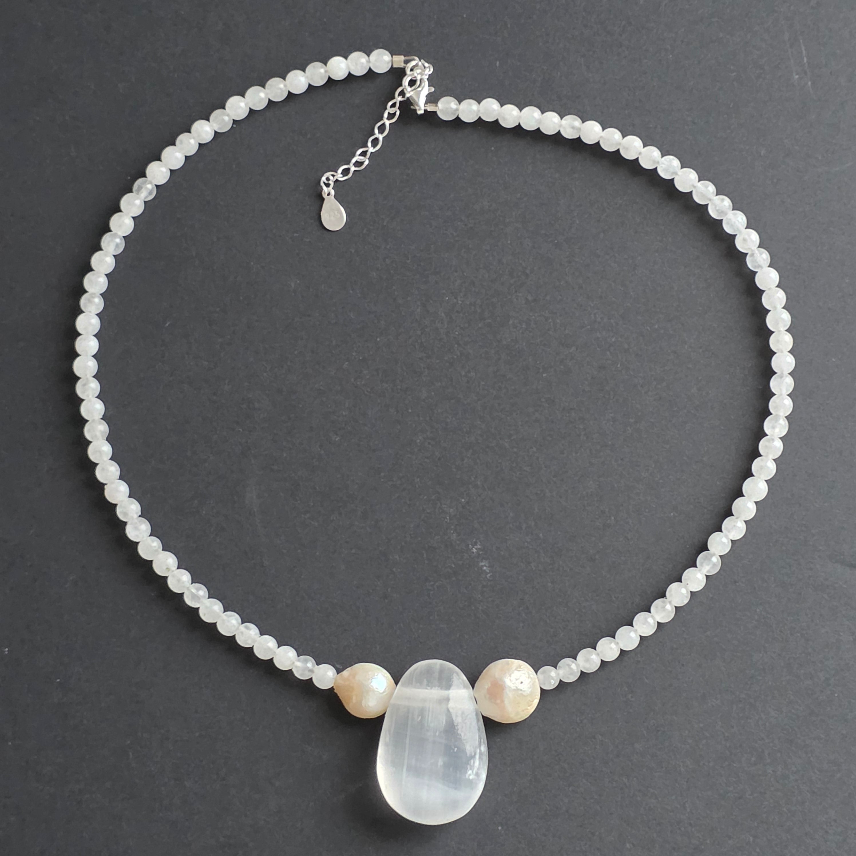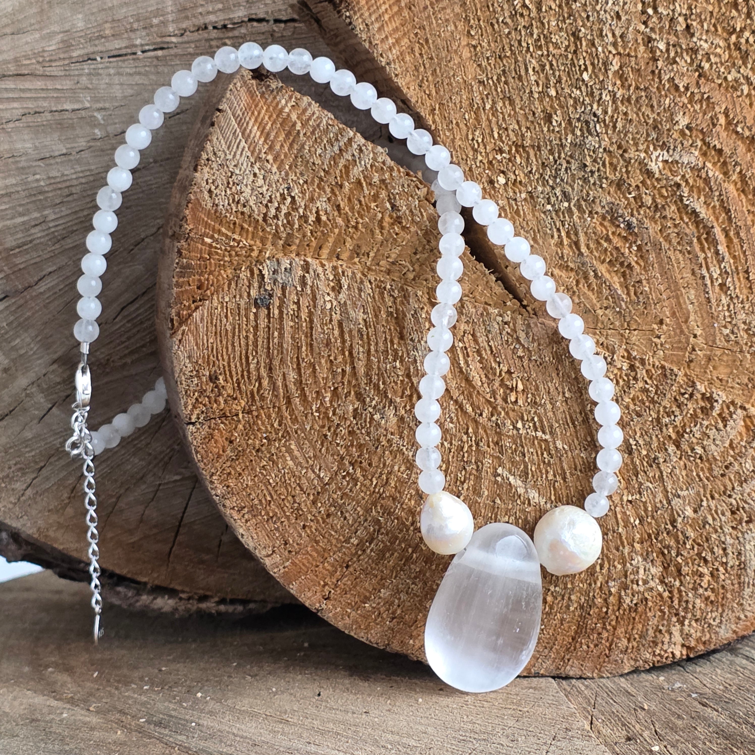 Fehér jáde, gyöngy és szelenit nyaklánc Moonlight#29