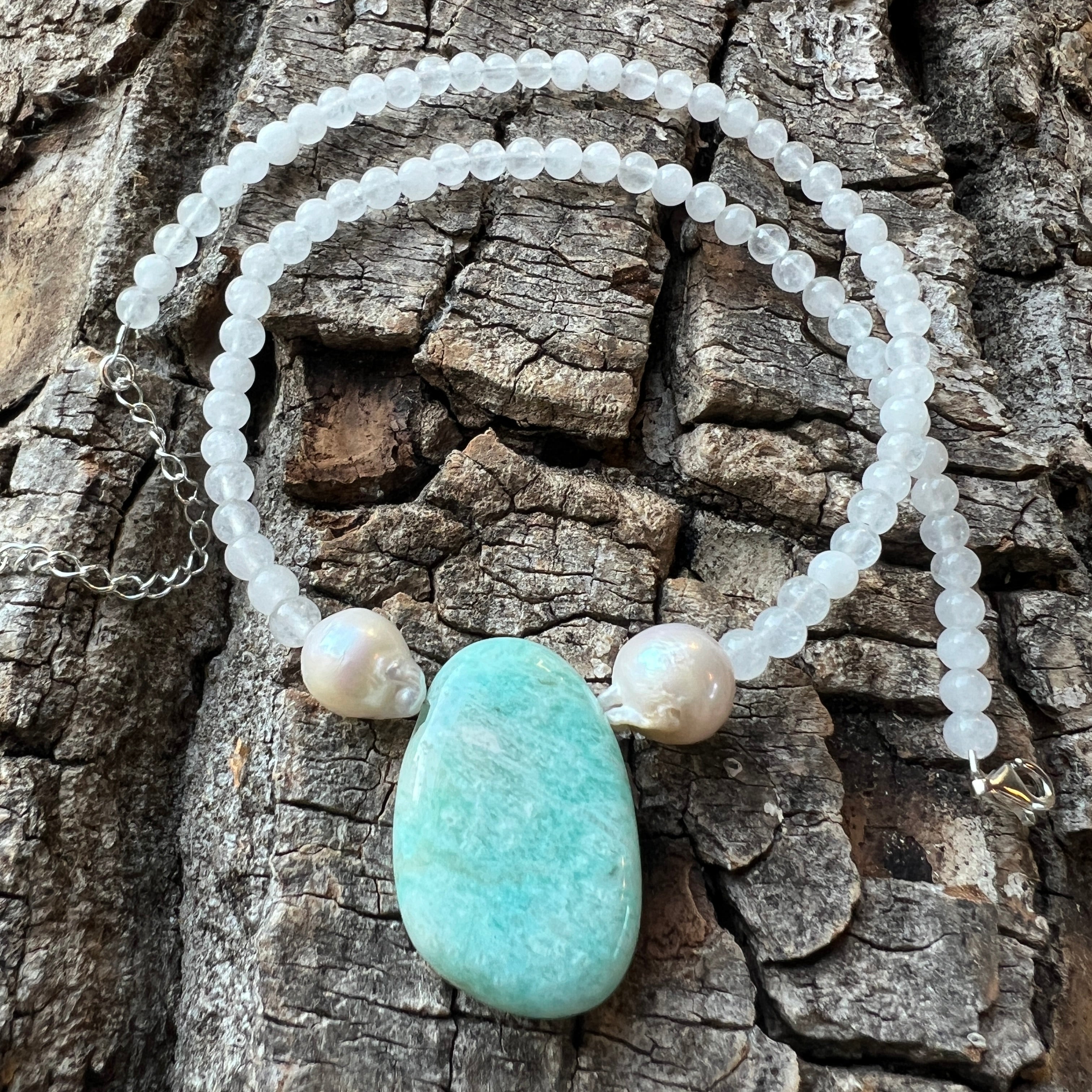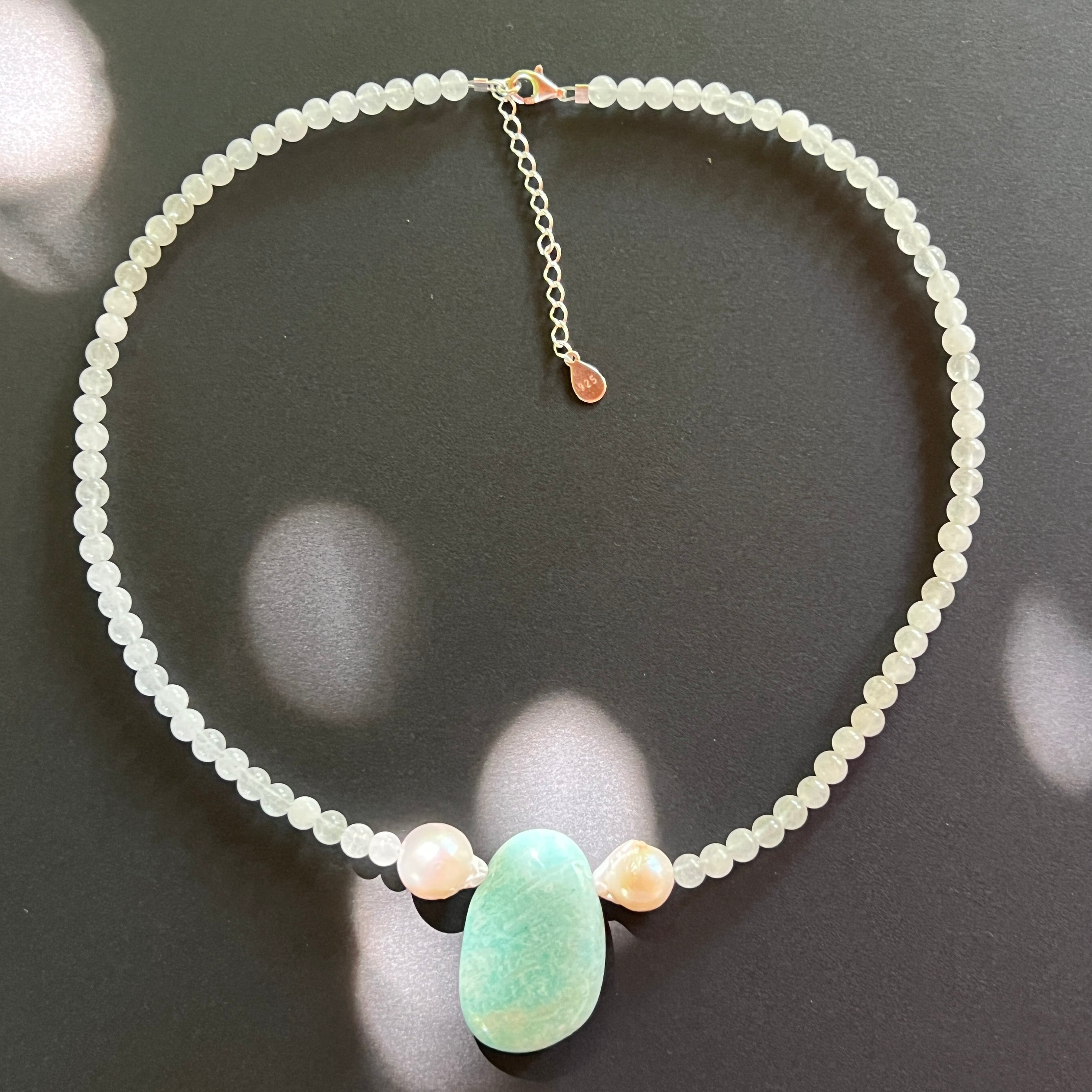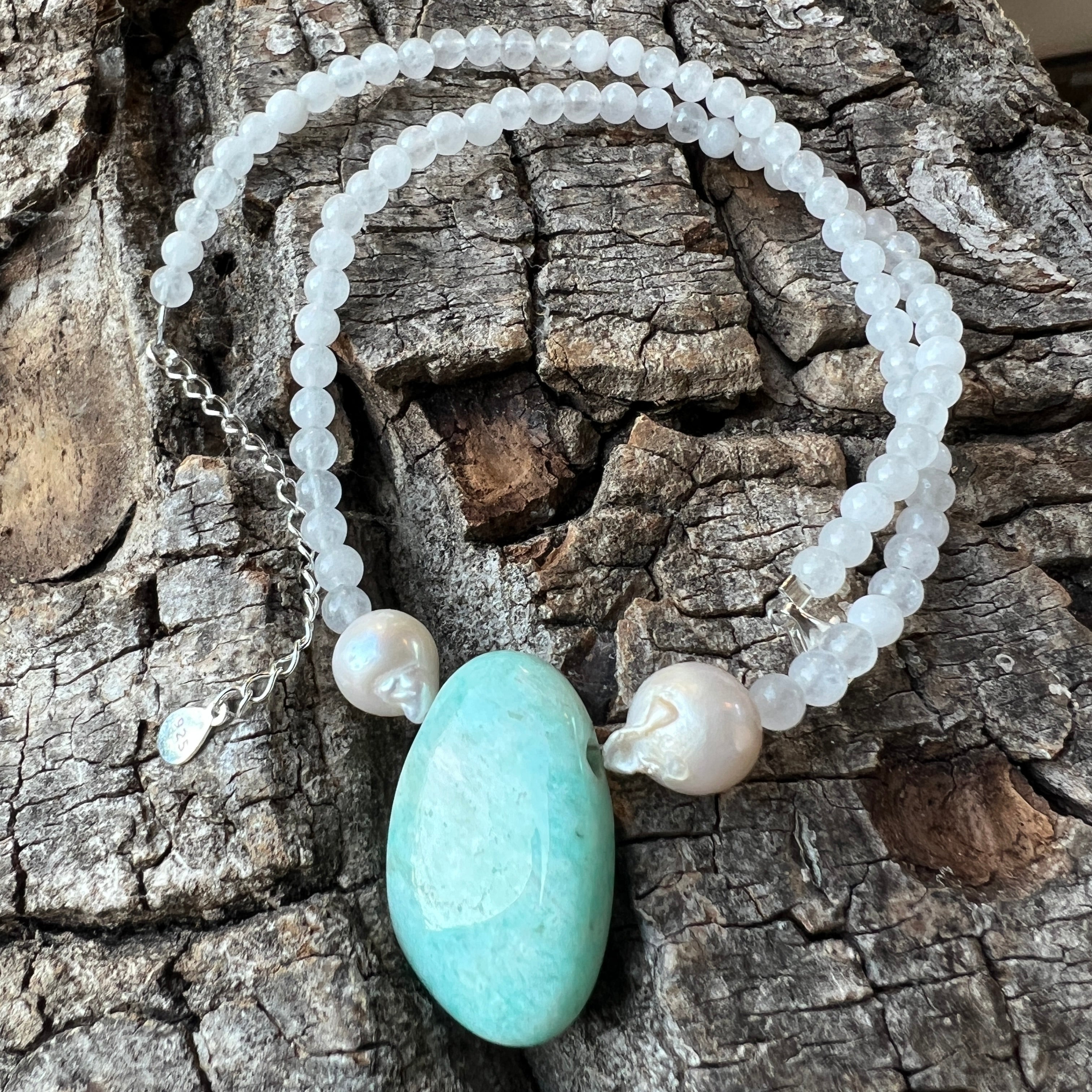 Az ékszer közepén körülbelül 3 cm hosszú „csepp” alakú medál található, természetes kék amazonitból – árnyalatai a tiszta égboltra vagy a mély vizek nyugalmára emlékeztetnek. A medált két körülbelül 1 cm-es, szabálytalan gyöngy foglalja keretbe, amelyek textúrát és hitelességet adnak – organikus formák, amelyek a természetességre és a tökéletlenség szépségére utalnak.