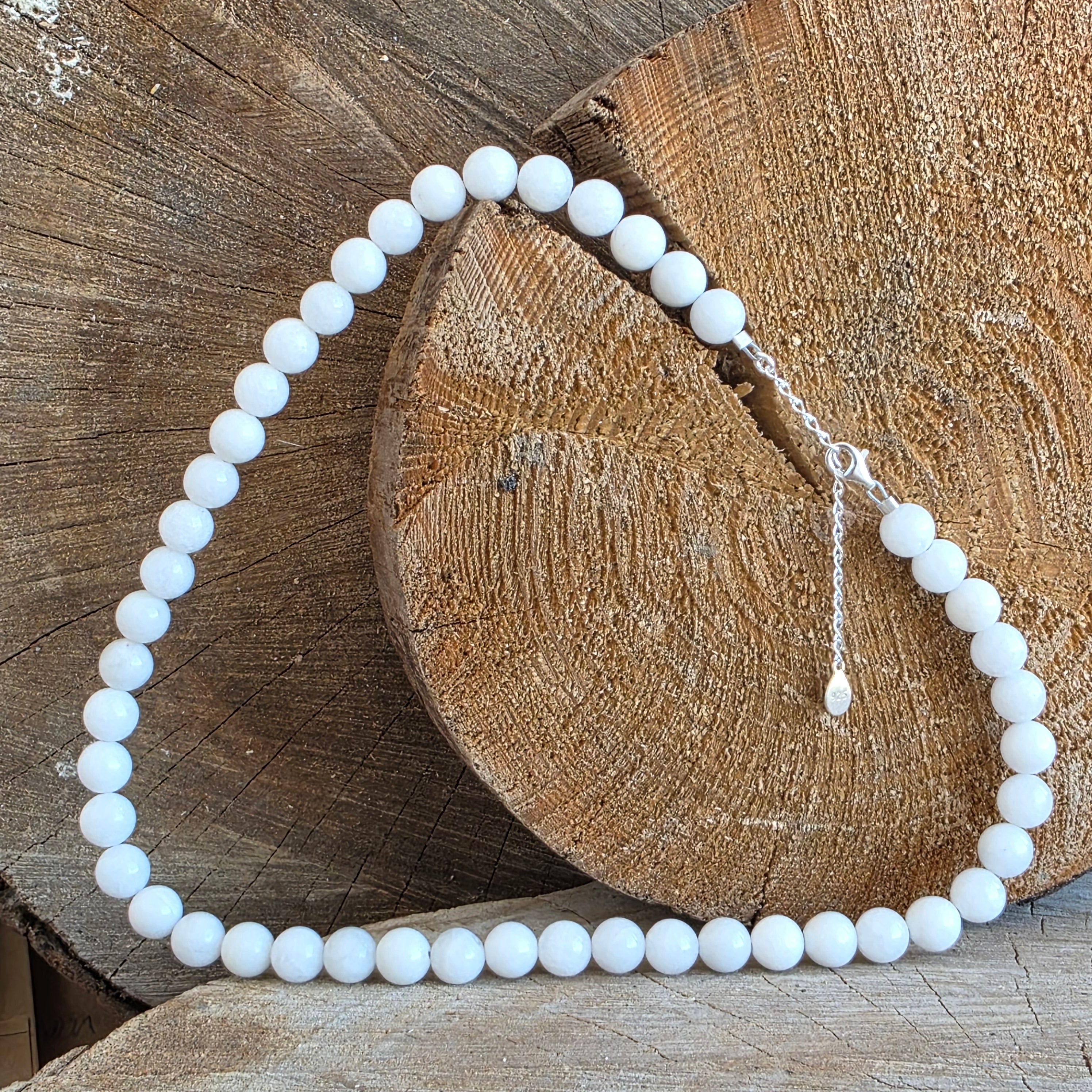 Anyagok: természetes fehér jáde, 6 mm-es csiszolt gyöngyök, 925 ezüst