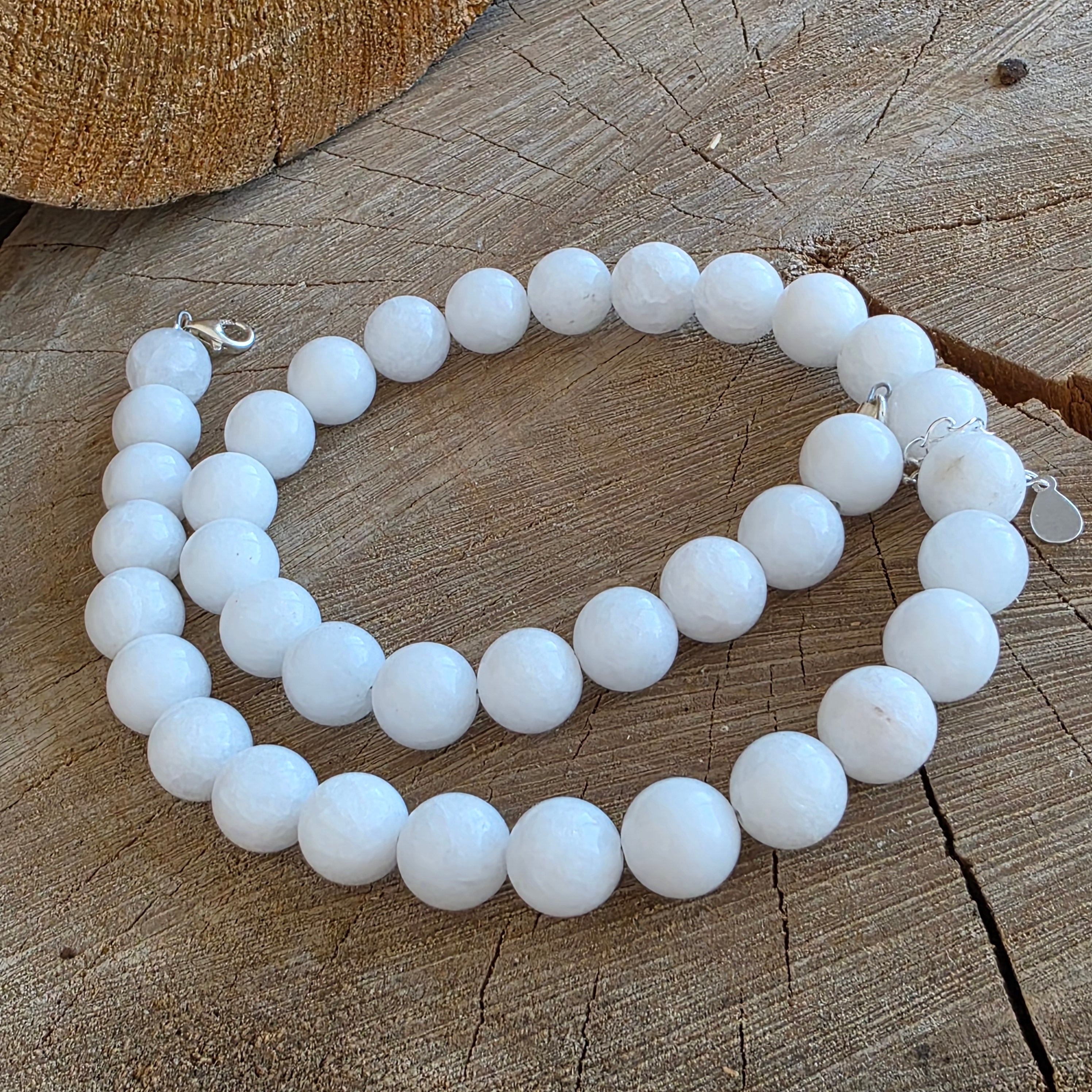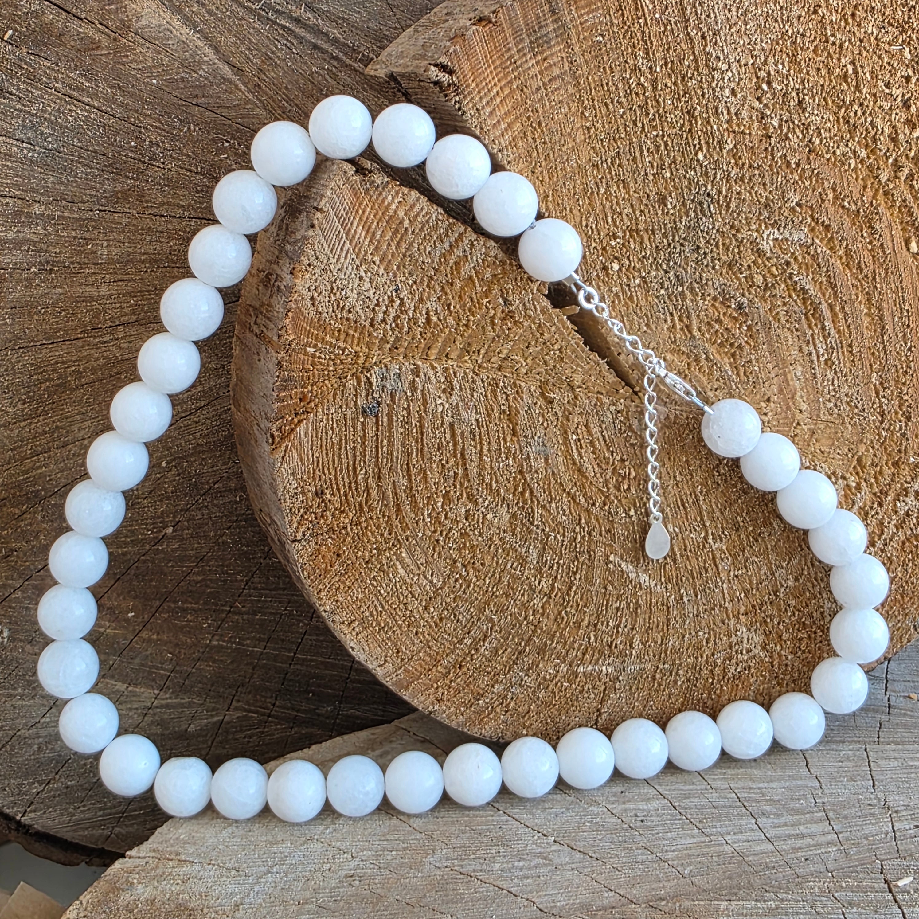 Egy nyugodt és kifinomult megjelenésű nyaklánc, 6 mm-es fehér jáde golyókból készítve, amelyek harmonikusan illeszkednek a nyak köré, kiegyensúlyozott és fényes vonalat alkotva. A tejfehér, néha enyhén áttetsző kő tiszta és rendezett kifejezést kölcsönöz, a finom csiszolás pedig diszkrét fényeket ad, kiemelve a természetes textúrát anélkül, hogy vizuálisan terhelné az ékszert. A design letisztult és időtlen, alkalmas mindennapi viselésre vagy elegáns kiegészítőként.