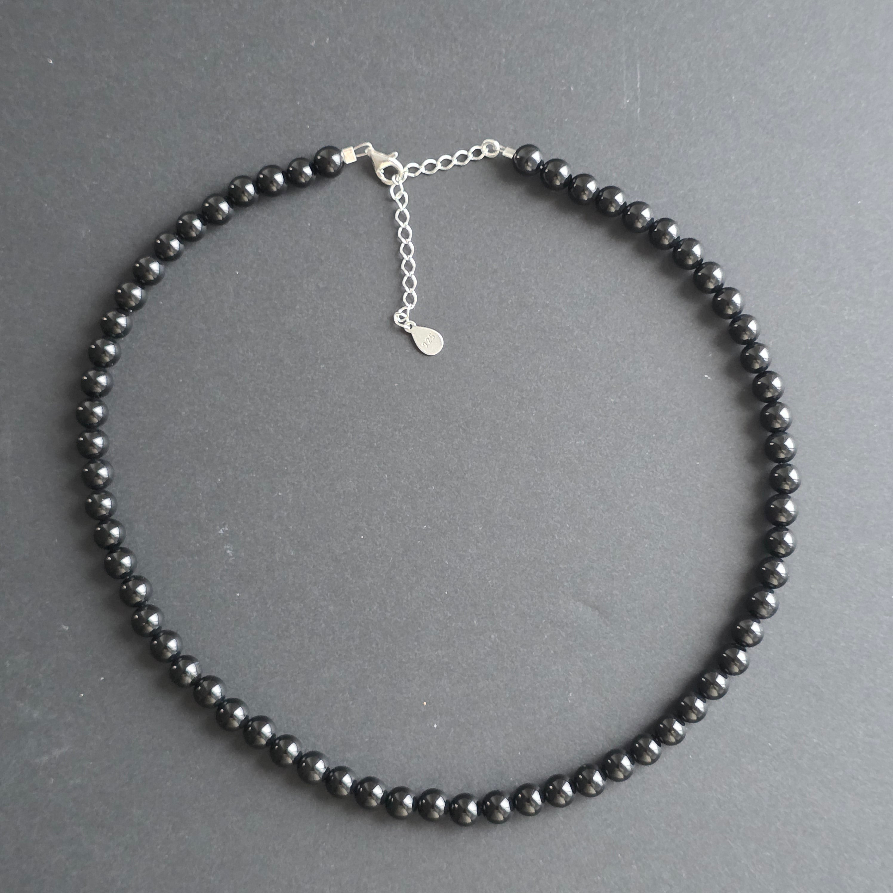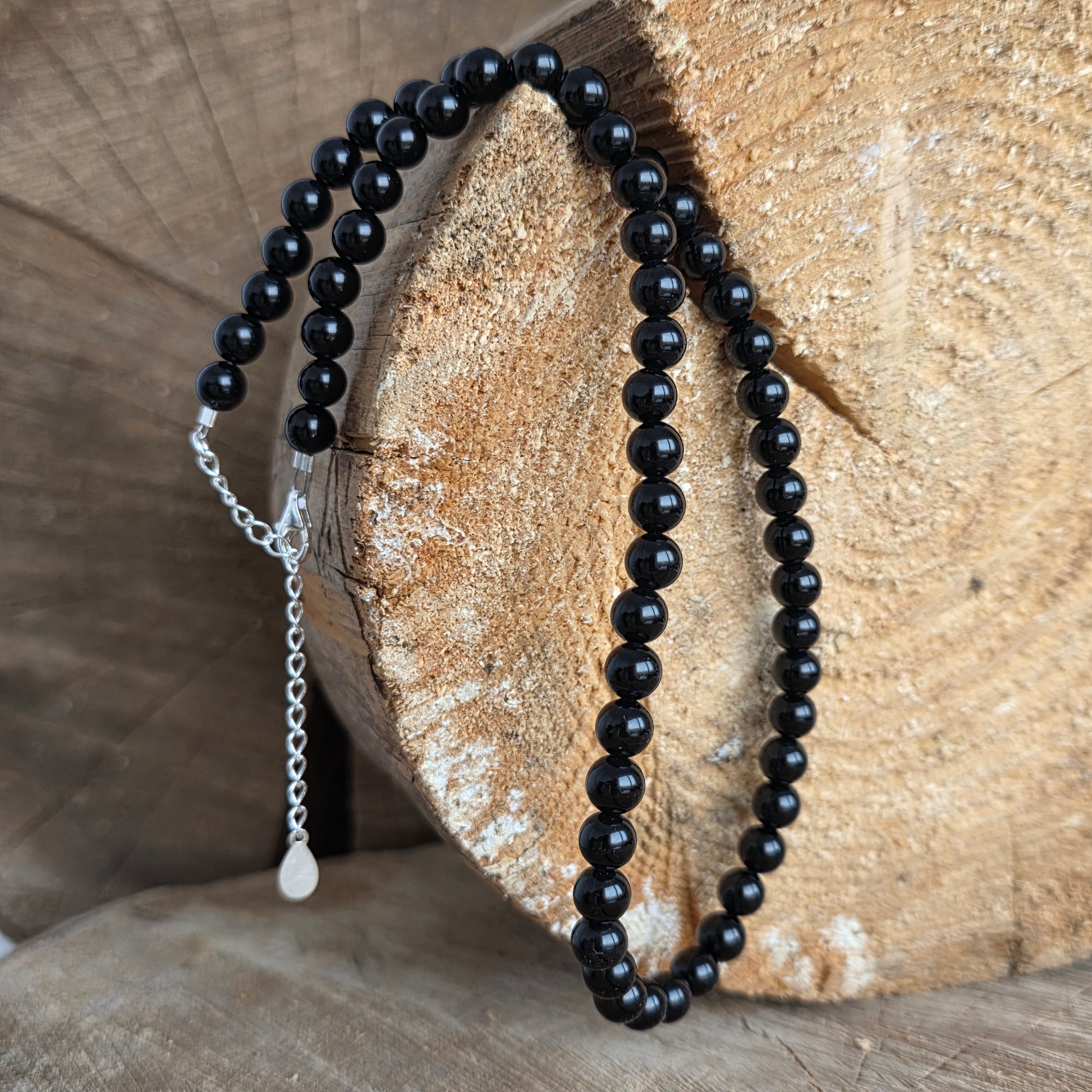 Egy nyaklánc, mint egy derült éjszaka, amikor a telihold ragyog a föld csendjén. A sima 6 mm-es fekete jáspis gyöngyök erővonalat és misztikumot rajzolnak, egy védő kört, amely elnyeli a világ zaját, és teret ad a jelenlétnek.