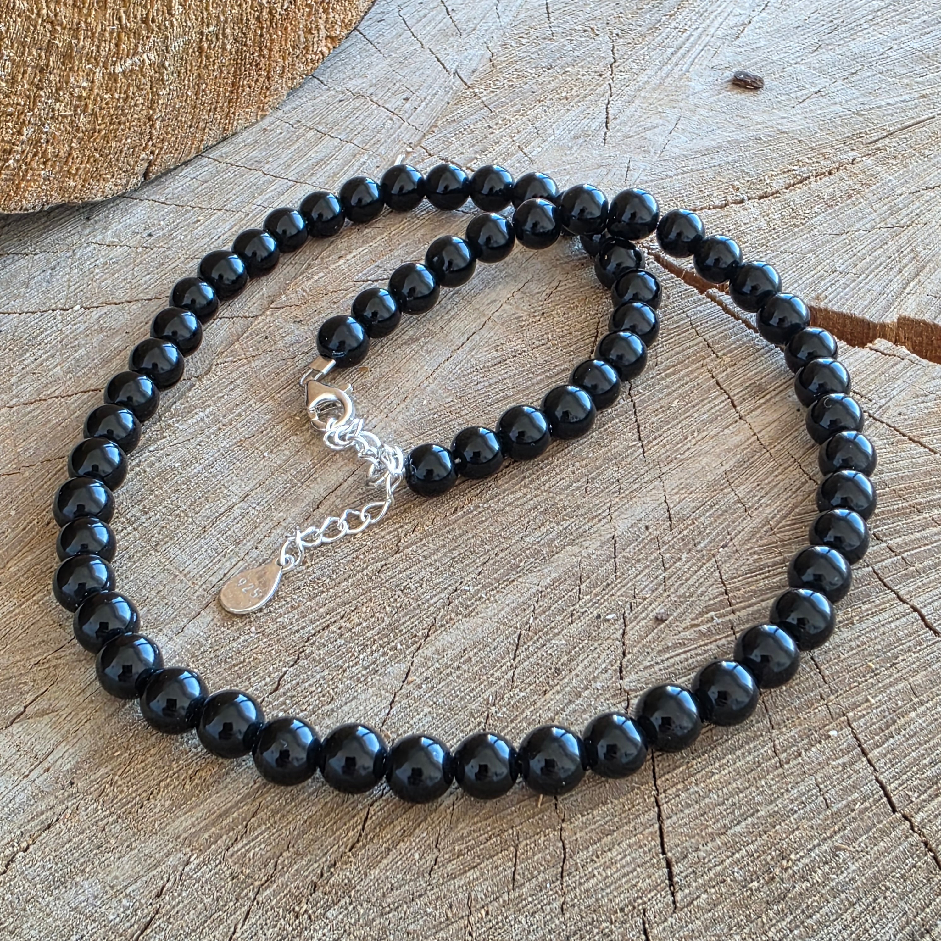 Egy finom és intenzív nyaklánc, amely 6 mm-es csiszolt fekete obszidián gyöngyökből készült, és egy finom, de jól definiált vonalat hoz létre a nyak körül. A mély fekete, diszkrét üvegfényű csillogással a fényt finom, majdnem grafikus visszfényekben ragadja meg, modern és kiegyensúlyozott hangulatot adva az ékszernek. A gyöngyök kismérete megőrzi a minimalista dizájnt, kiemelve a forma tisztaságát és a vizuális világosságot.