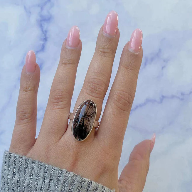 Válassza ezt a természetes fekete rutilkvarc ezüst gyűrűt, egy erős karakterű és lenyűgöző megjelenésű darabot, amelyet a finom, sötétzárványok emelnek ki, egyedi vonaljátékot hozva létre a kő belsejében. Minden darab eltérő, így ez az ékszer autentikus és különleges választás.