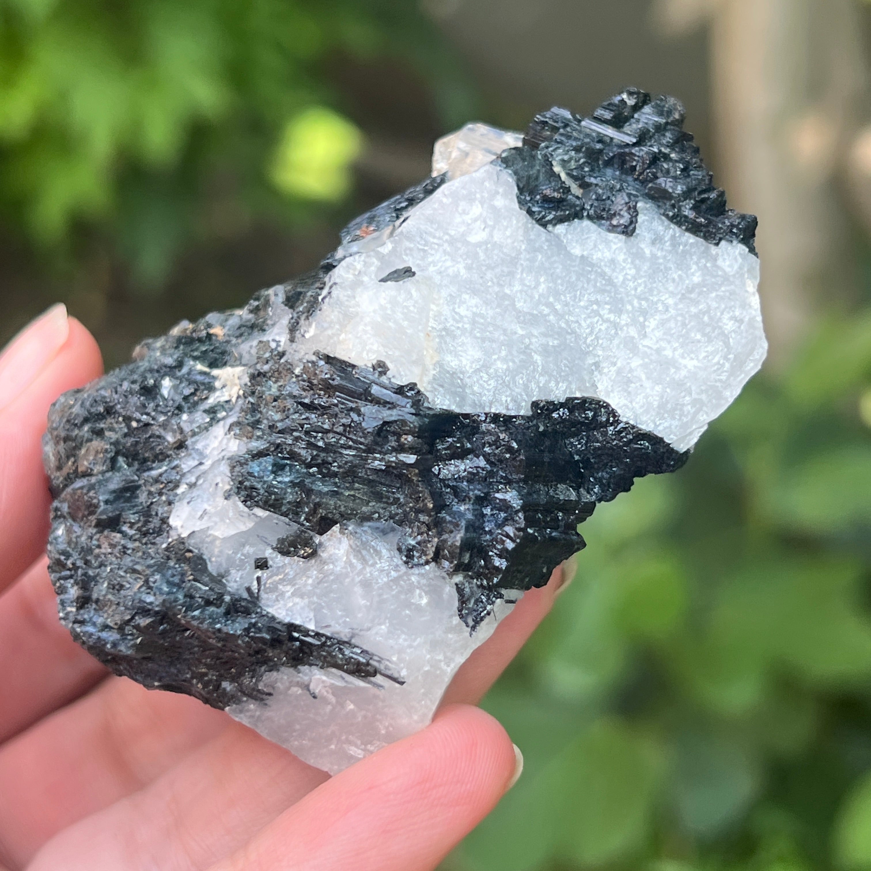 Ennek a ritka kőnek a szívében két ellentétes erő táncol tökéletes harmóniában – a fekete turmalin, mélyen a földbe gyökerező védelmező energiájával, és a holdkő, amely éteri rezgéseivel az élet ciklikusságához és a női misztériumokhoz kapcsolódik. Együtt egy teljesen különleges, majdnem alkimista kombinációt alkotnak, ahol a sötétség és a fény nem kizárja egymást, hanem átölelik egymást.