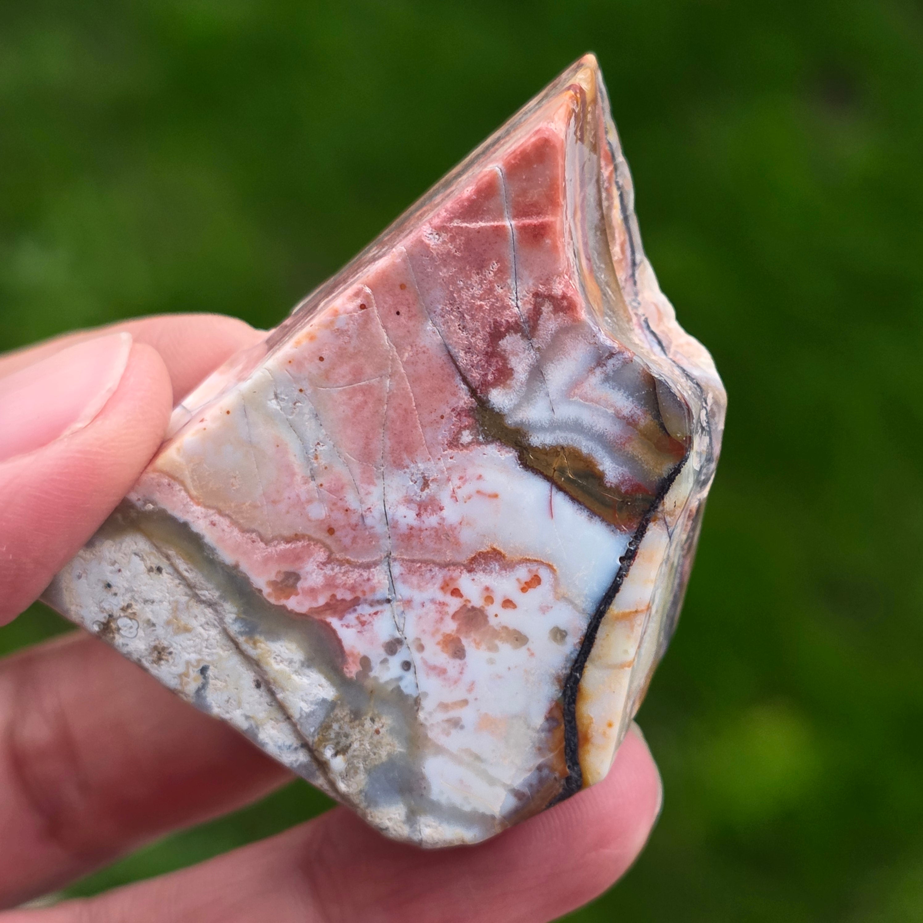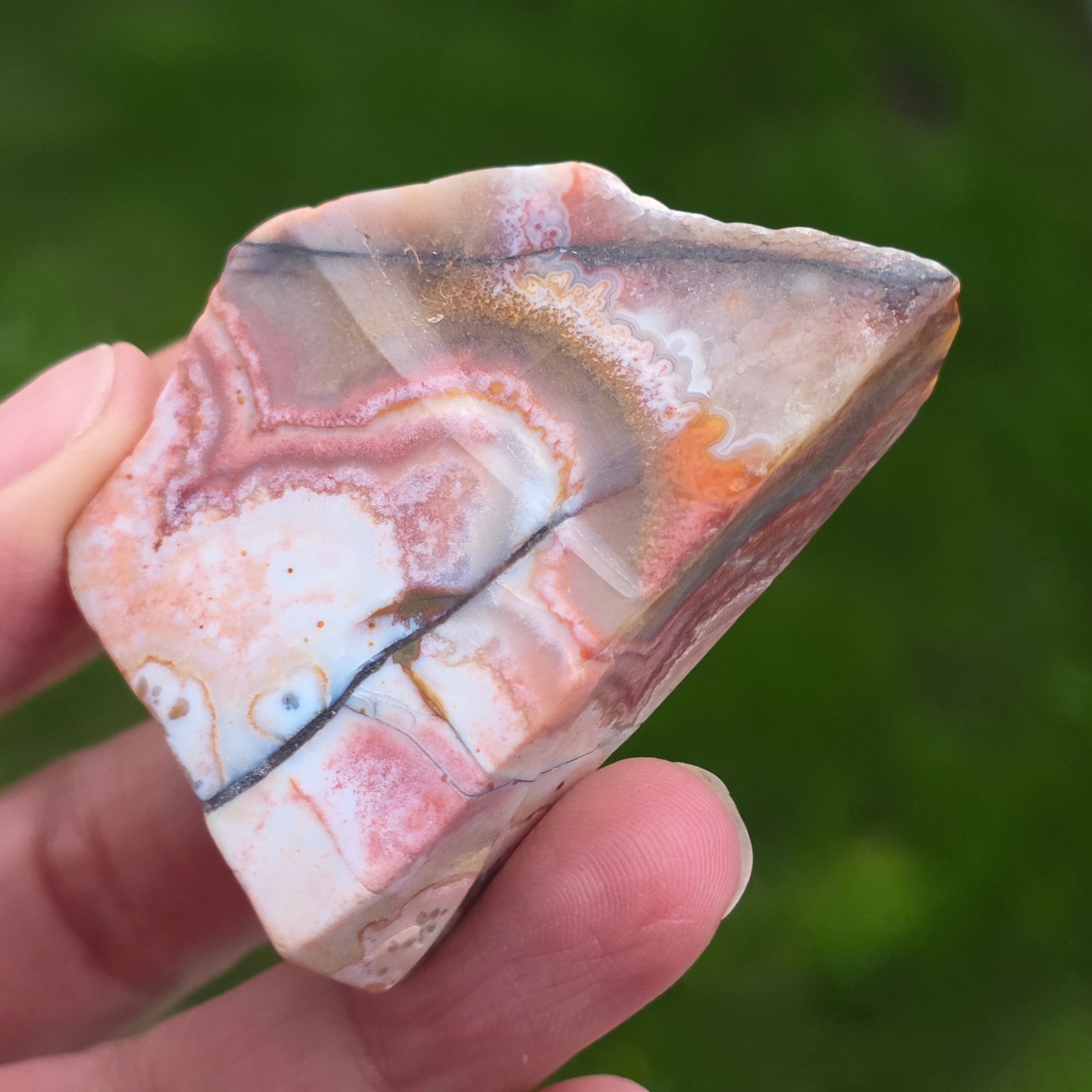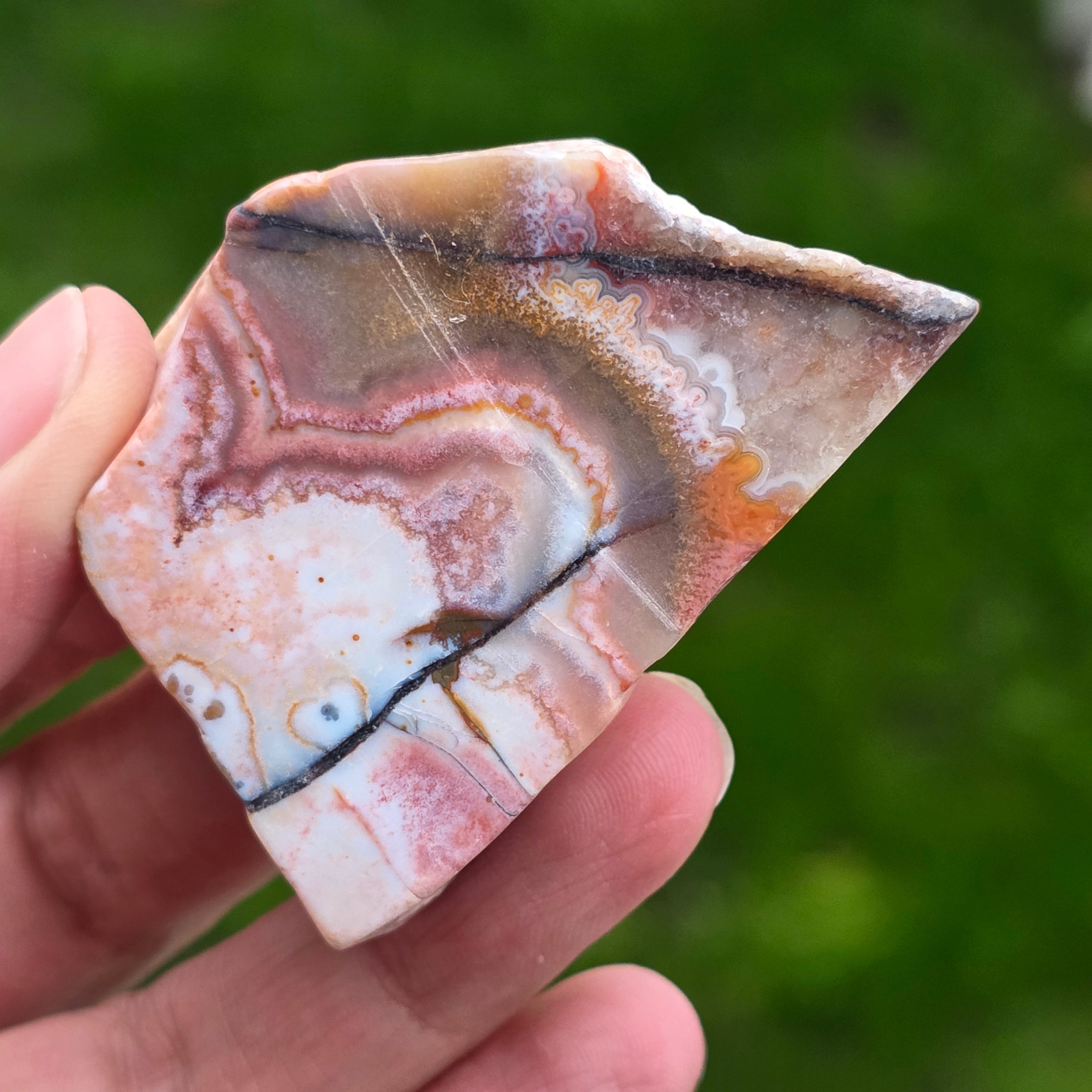 A mexikói Crazy Agát az egyik legélénkebb és leglátványosabb agátfajtának számít, híres hullámos vonalairól és a szabad kéz által, szabályok nélkül rajzolt színes játékairól. Ebben a természetes, kicsi, de rendkívül kifejező szeletben a kő teljes története kibontakozik: földszínek, meleg karamell, élénkpiros, narancs, szürke és krém árnyalatok keverednek spirális mintákban, amelyek mintha az élettel lüktetnének.