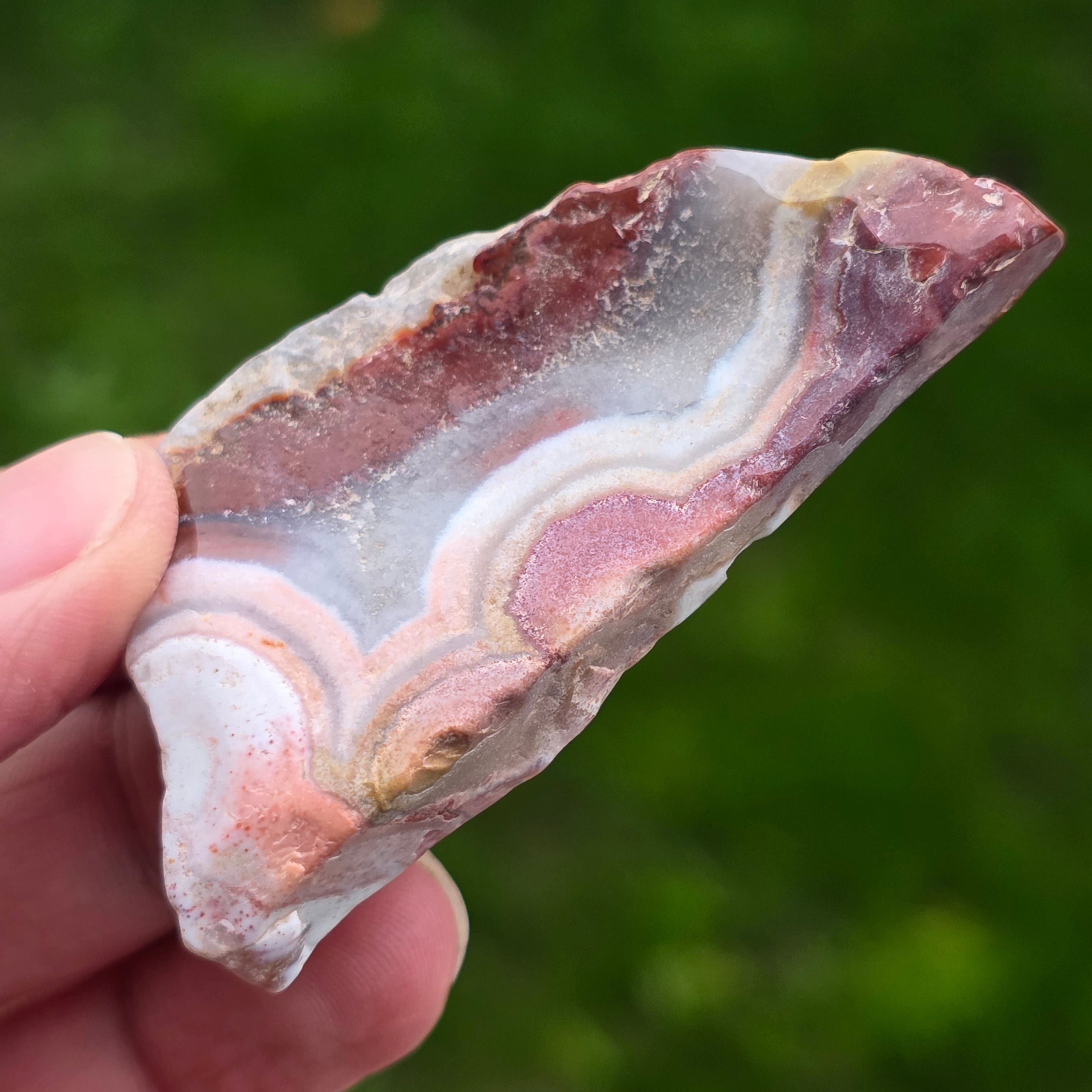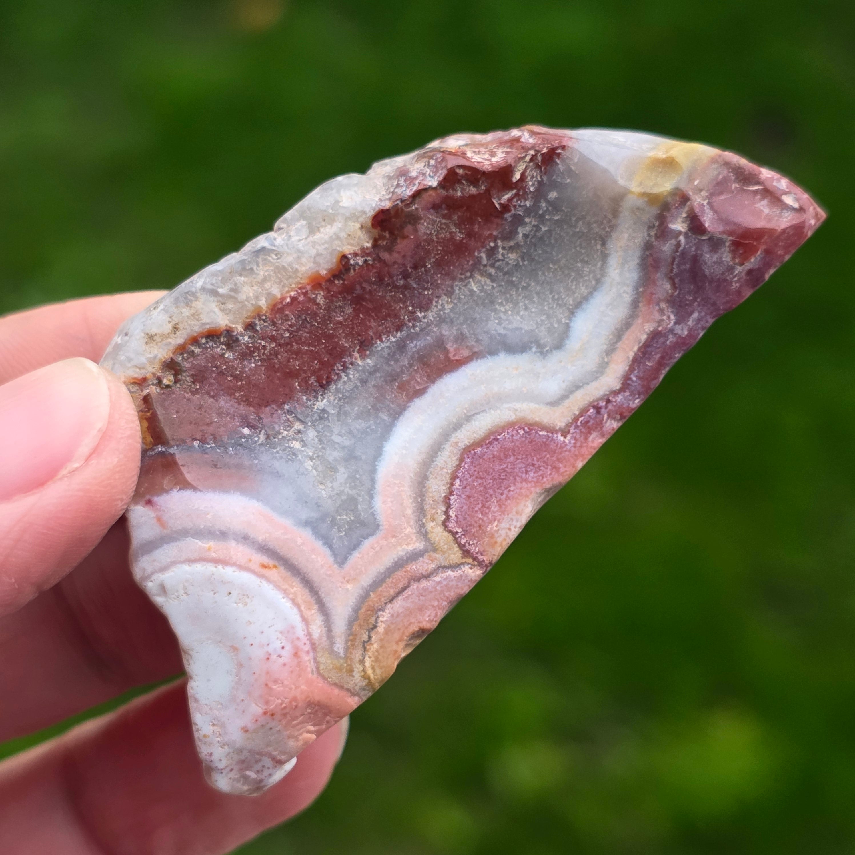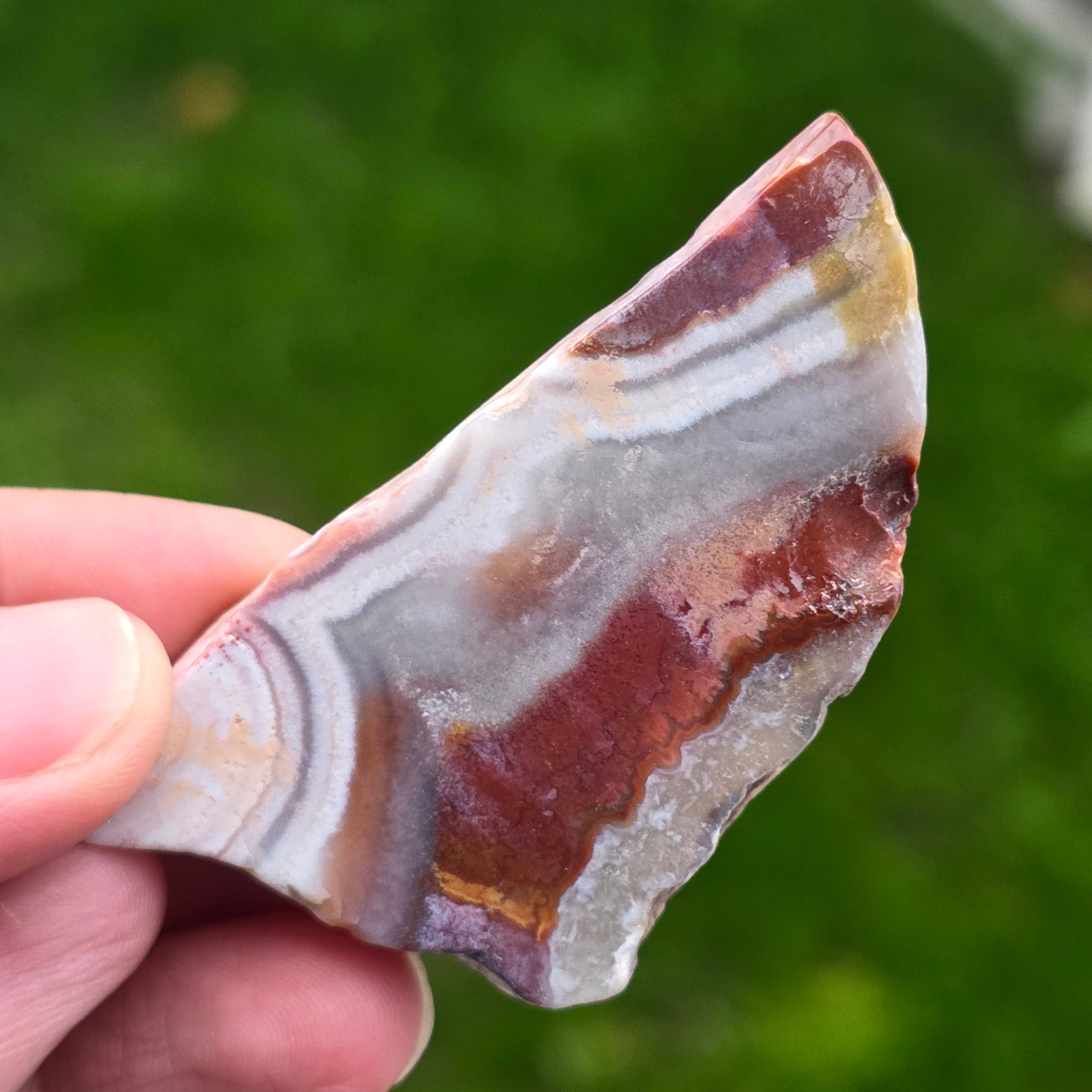 A mexikói Crazy achát az egyik legélénkebb és leglátványosabb achátfajta, híres hullámos vonalairól és őrült színjátékáról, amelyek úgy tűnik, mintha szabadkézzel, szabályok nélkül lennének rajzolva. Ebben a természetes szeletben, kicsi, de rendkívül kifejező darabban a kő teljes története felfedi magát: földszínek, a karamell meleg árnyalatai, élénk piros, narancs, szürke és krém színek keverednek spirálos mintákban, amelyek mintha élettel pulzálnának.