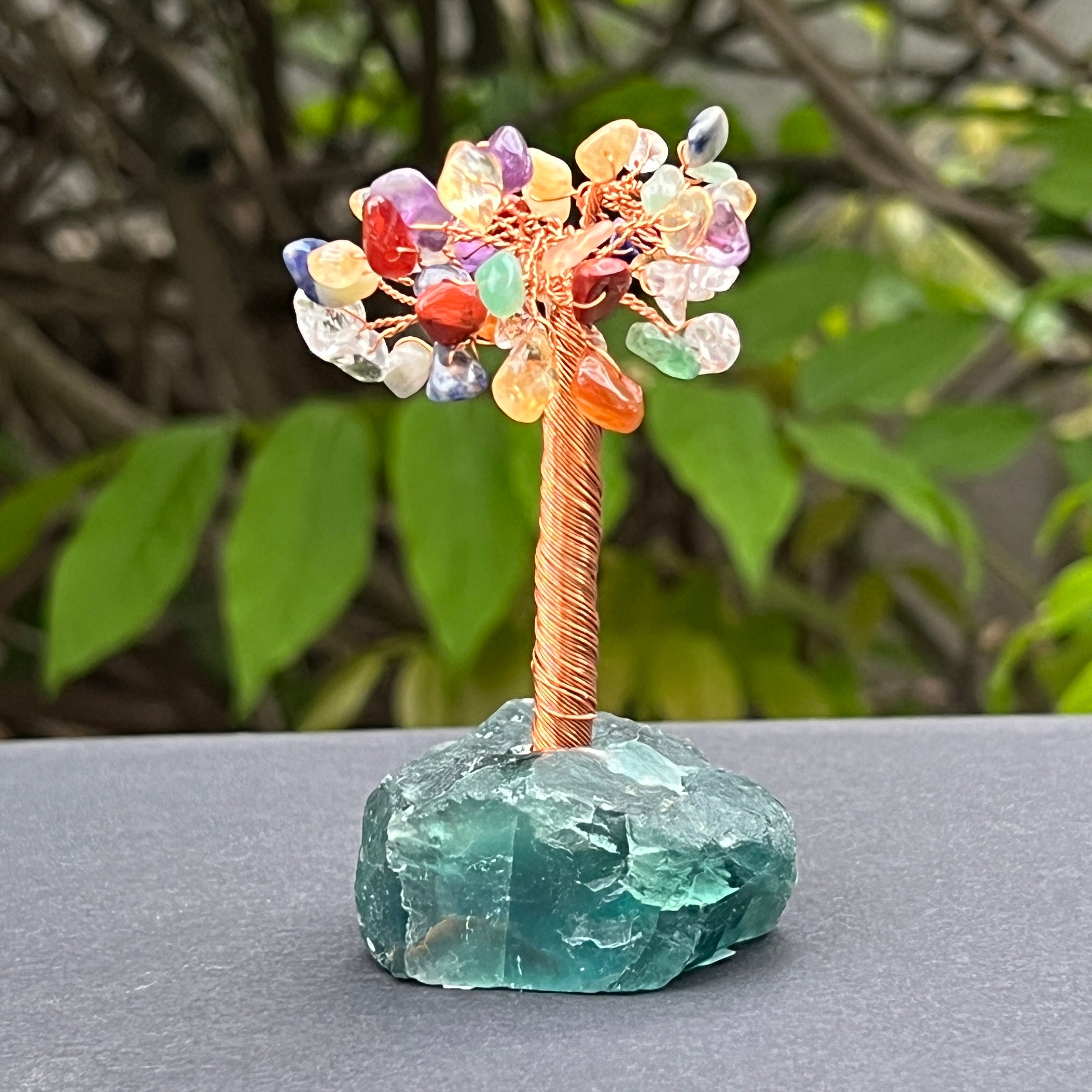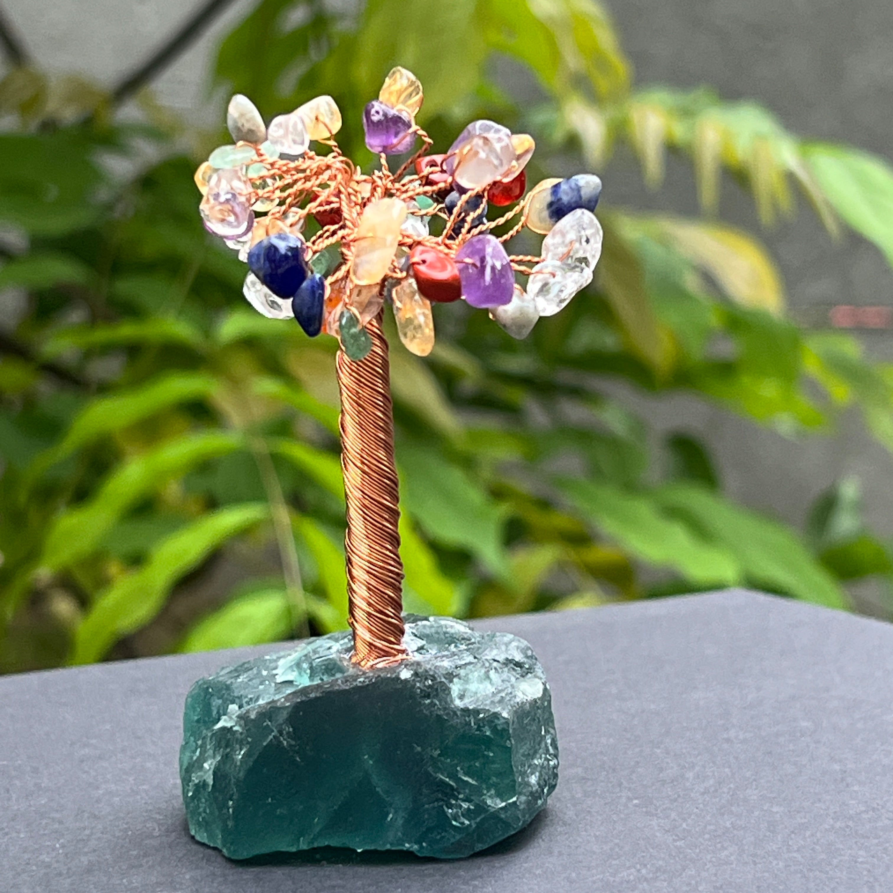 A fa alapja nyers fluorittalkészült, amely köztudottan támogatja a mentális tisztaságot és az energetikai védelmet. Mivel egy olyan kristályról van szó, amely segíti a csakrák összehangolását, a fluorit tökéletesen kiegészíti a kis fa szerkezetét, támogatva az életenergia harmonikus áramlását.