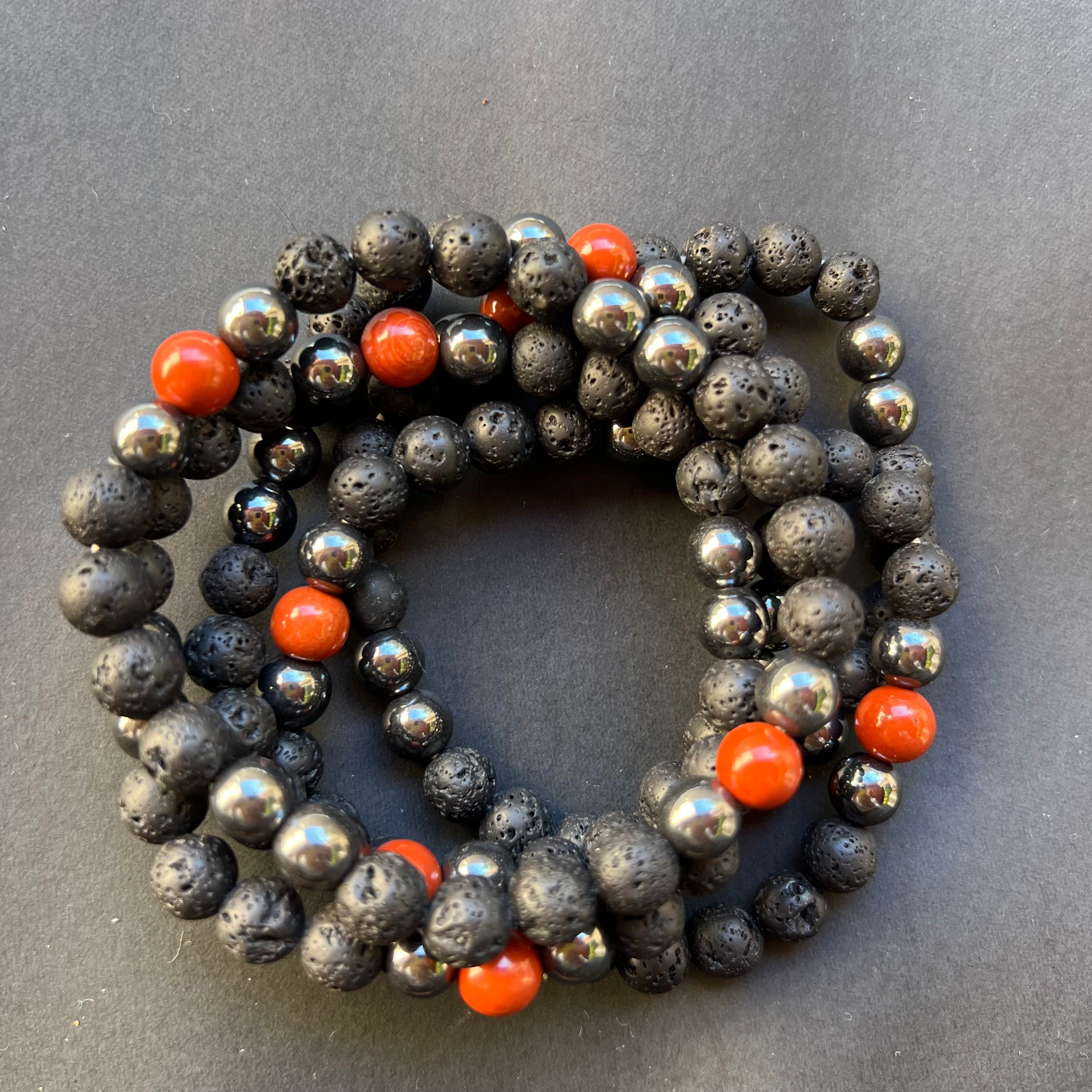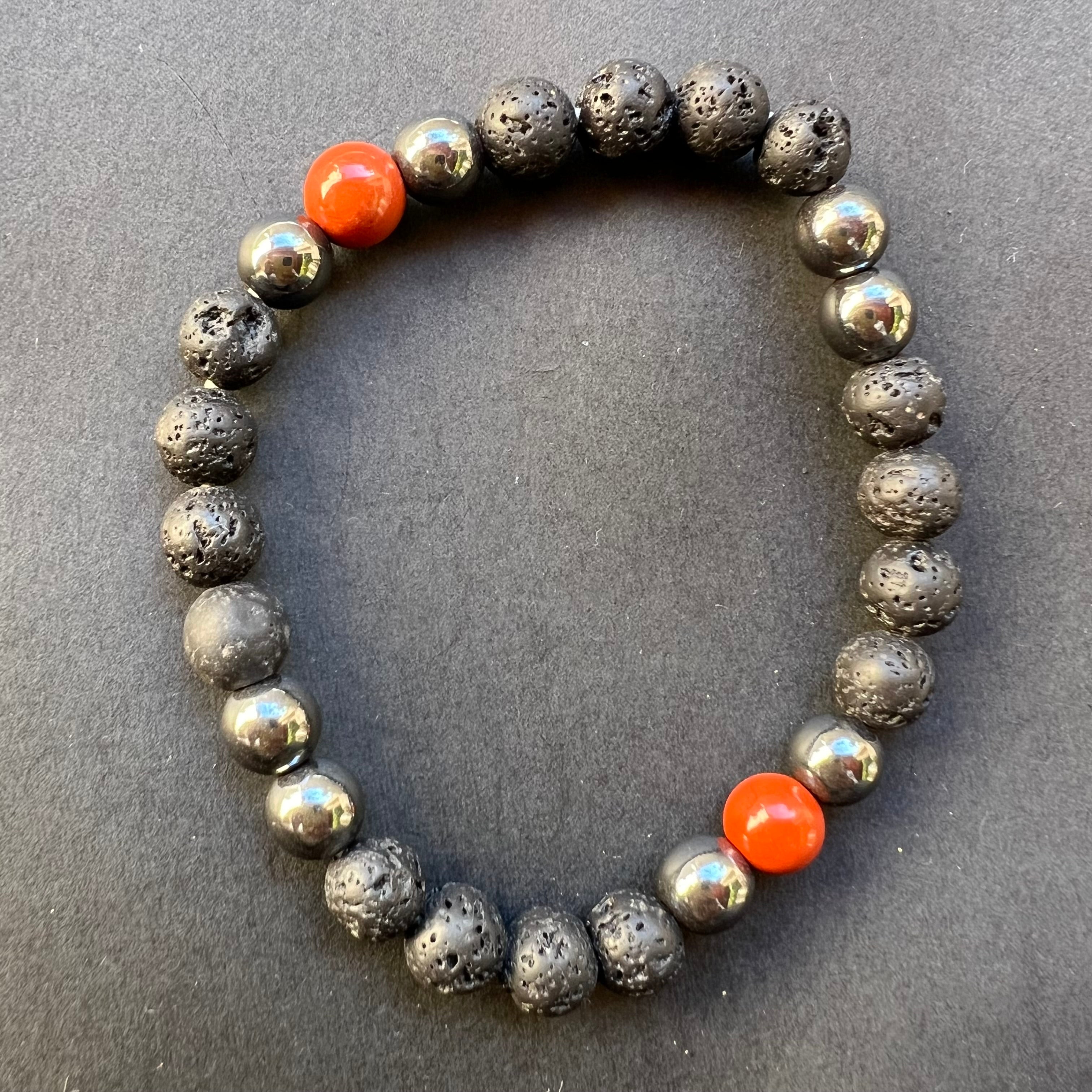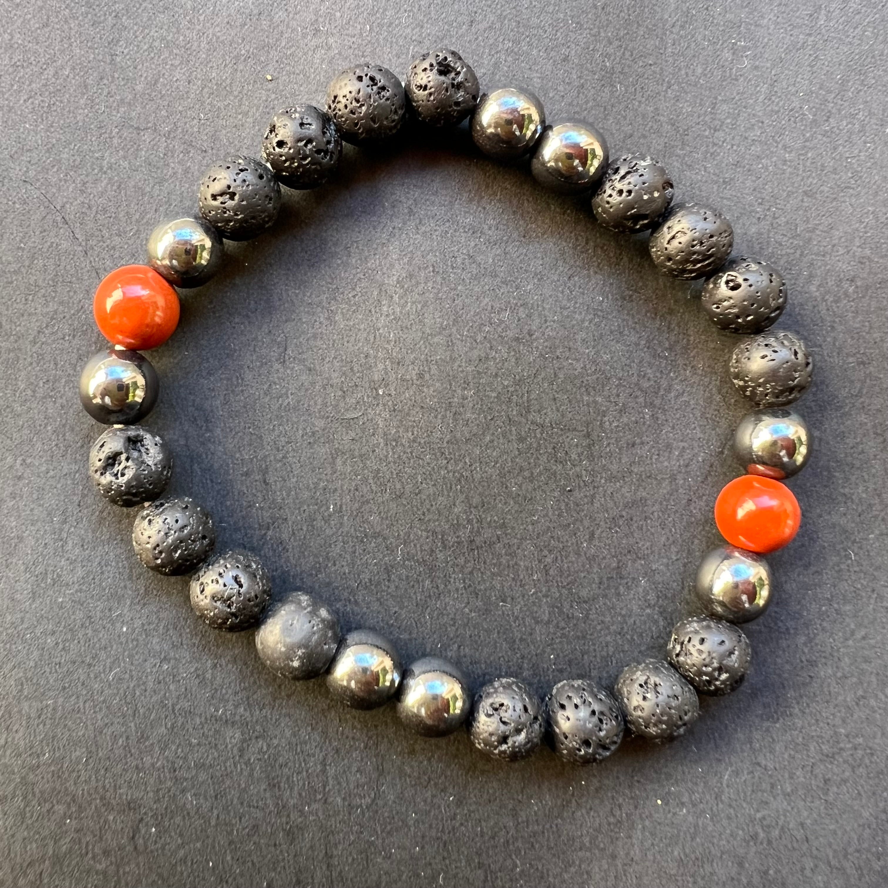 Descriere - Férfi karkötő lávakőből, vörös jáspissal, 8 mm