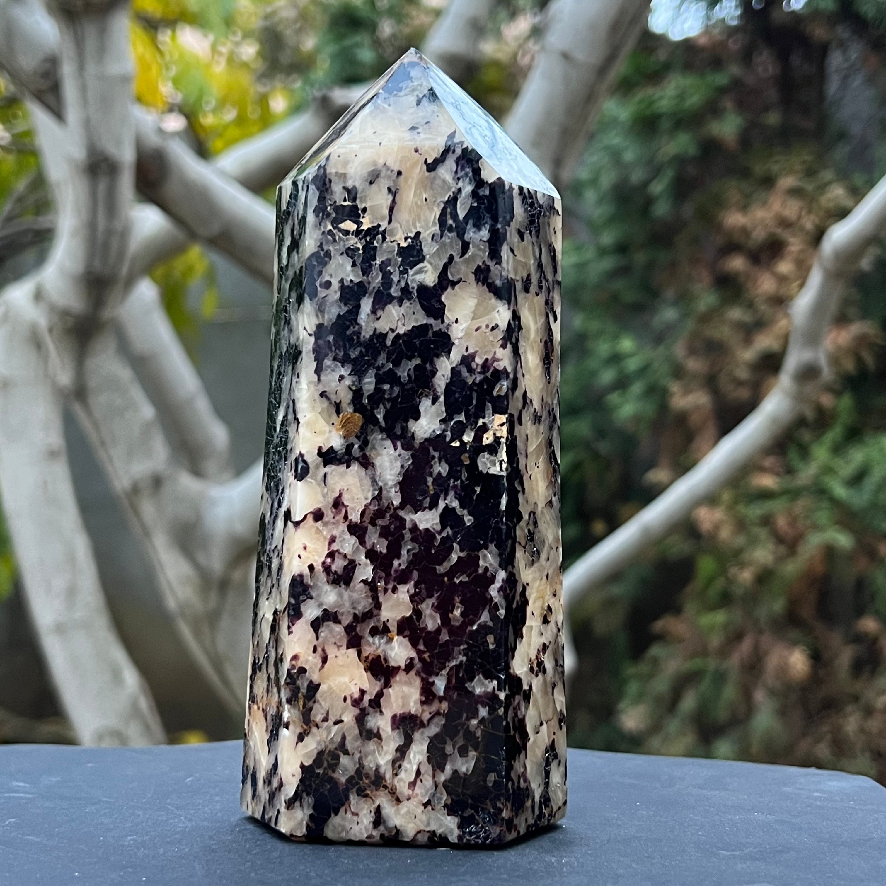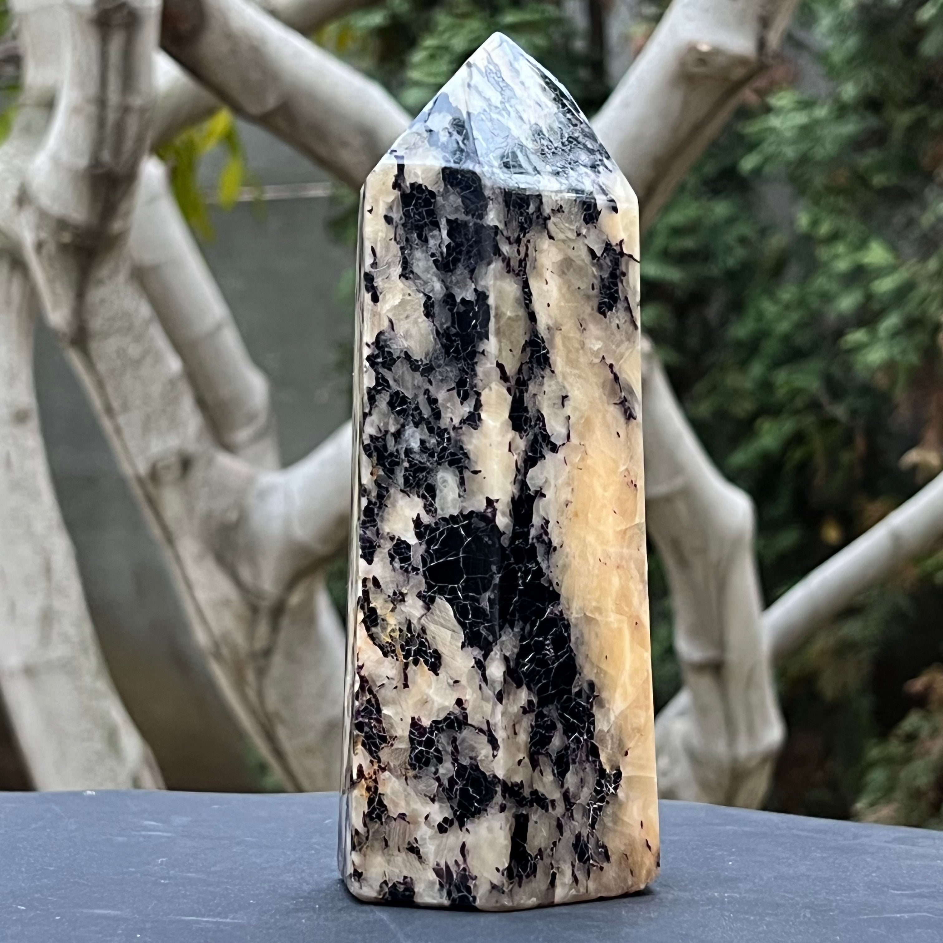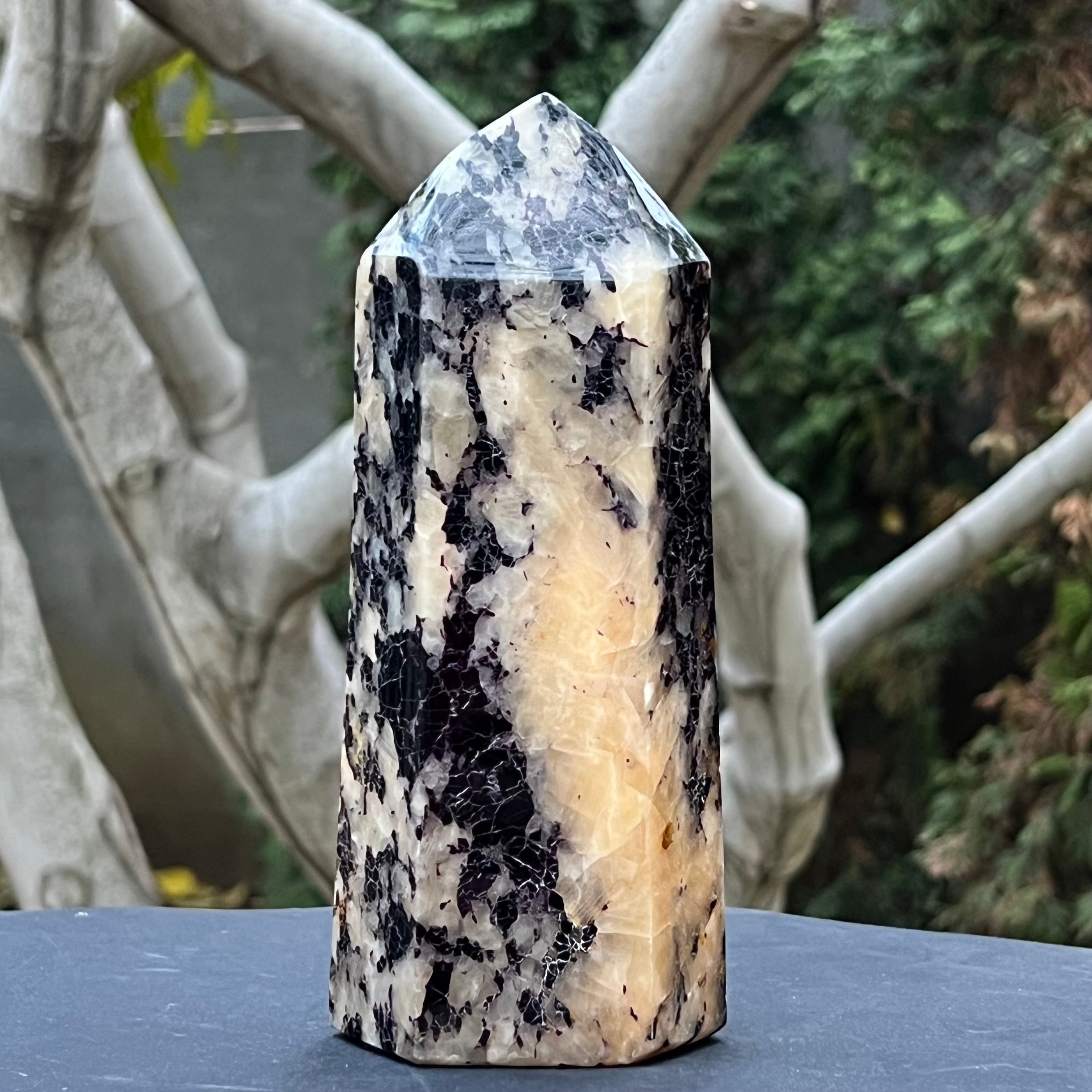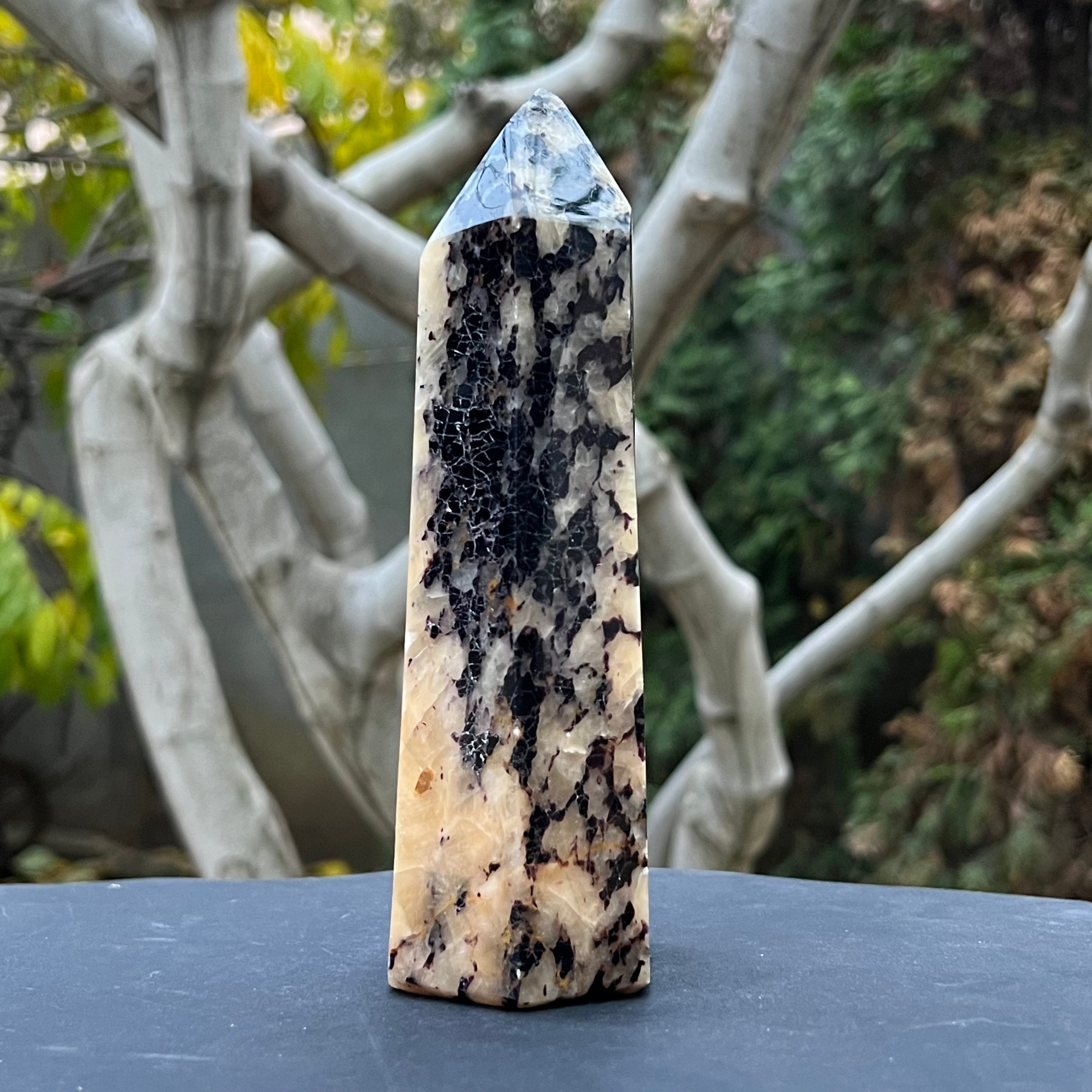 Fluorit kalcitban, XL generátor obeliszk Madagaszkárról, 1. modell