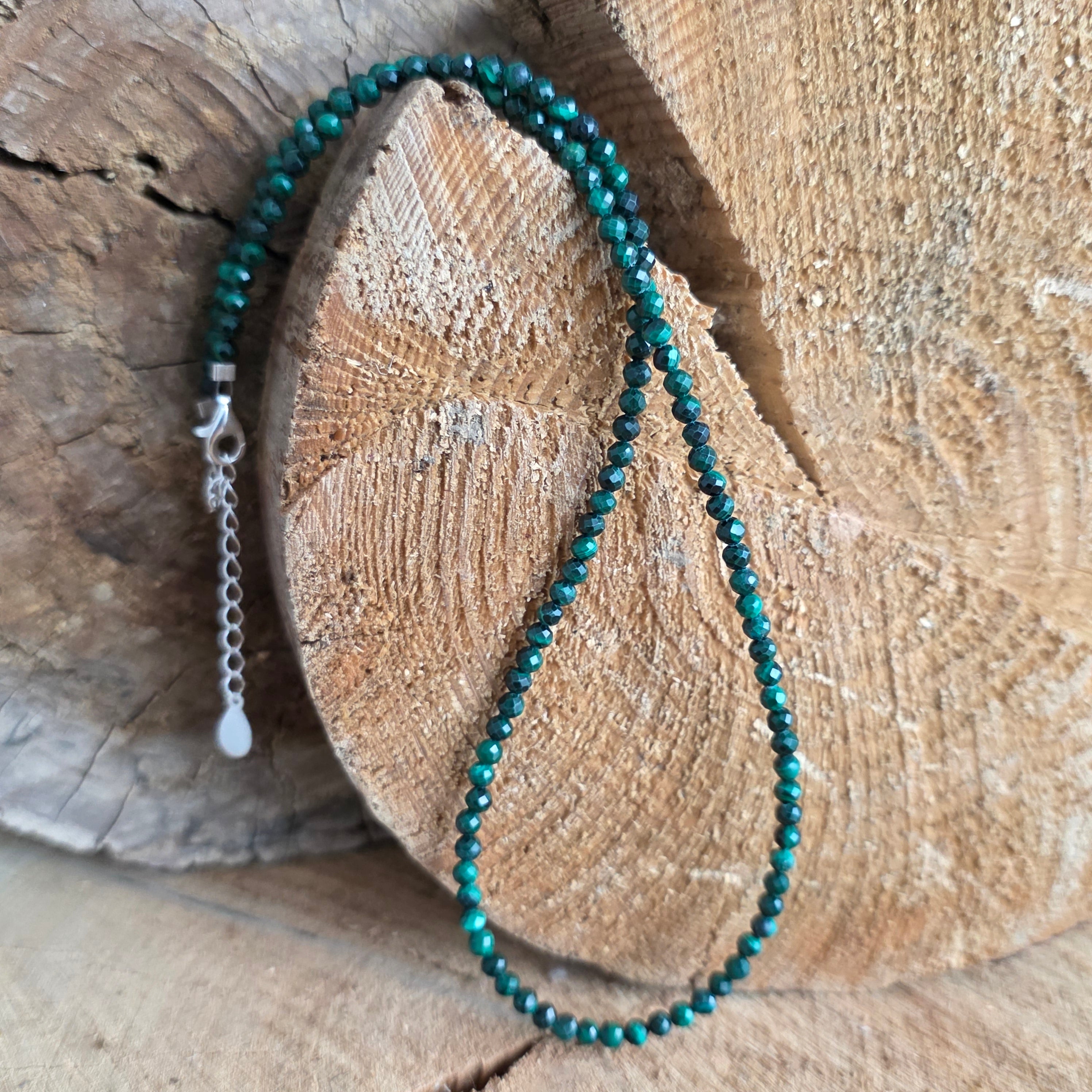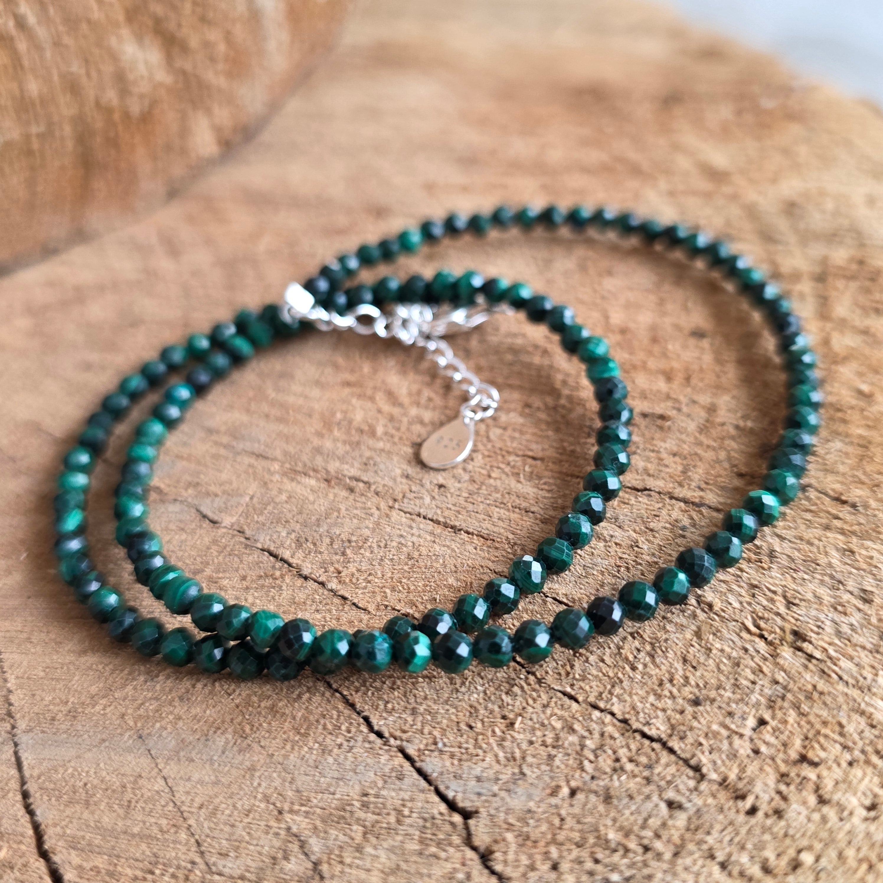 Egy nyaklánc, amely a föld mély énekét hordozza, az erő és megújulás visszhangját. A malachit intenzív zöld árnyalataival és folyékony csíkjaival élő kő — a átalakulás, védelem és belső újjászületés kifejezője. Minden 2 mm-es fazettált gyöngy egy önálló világ, a smaragd fényének és az erdő árnyékának tánca.