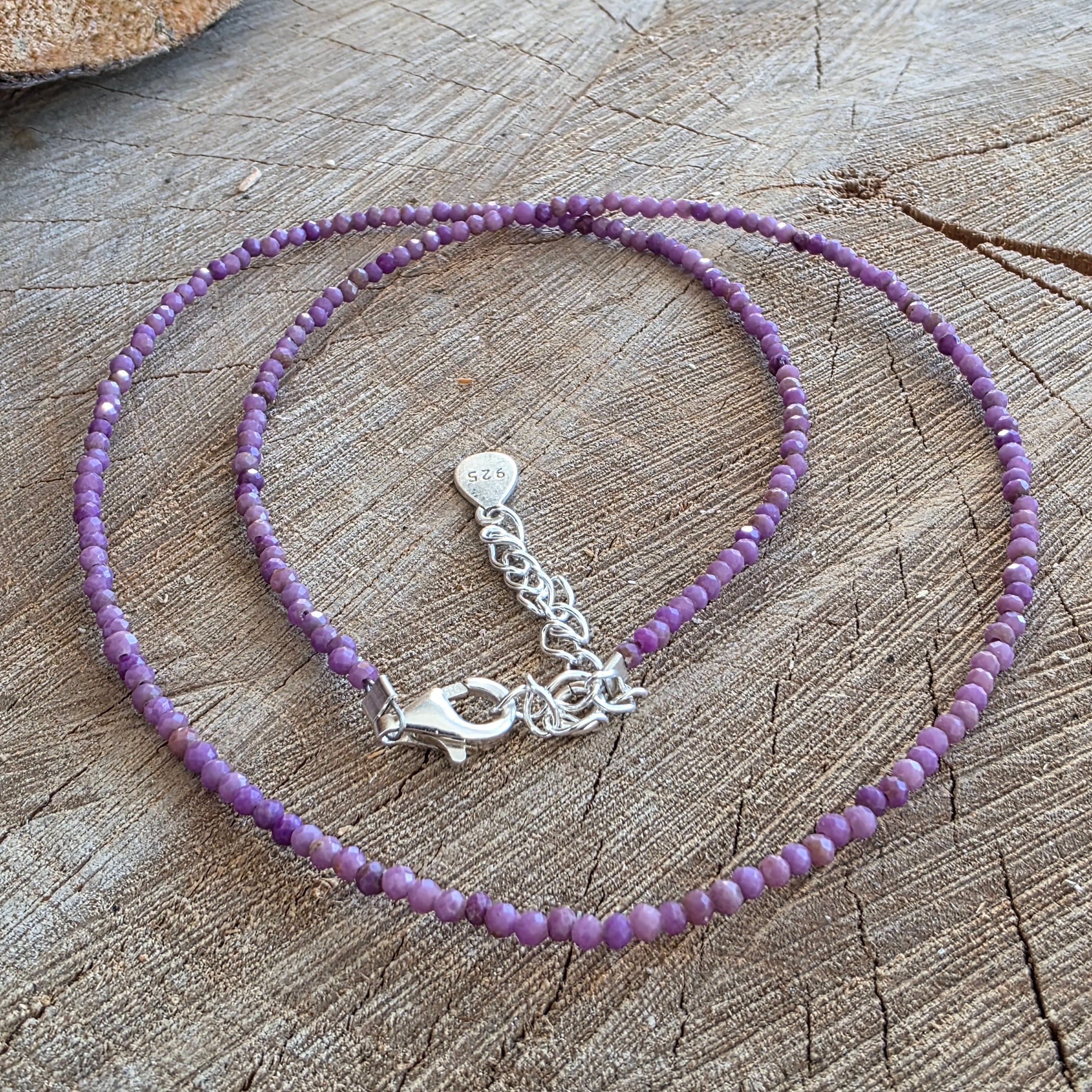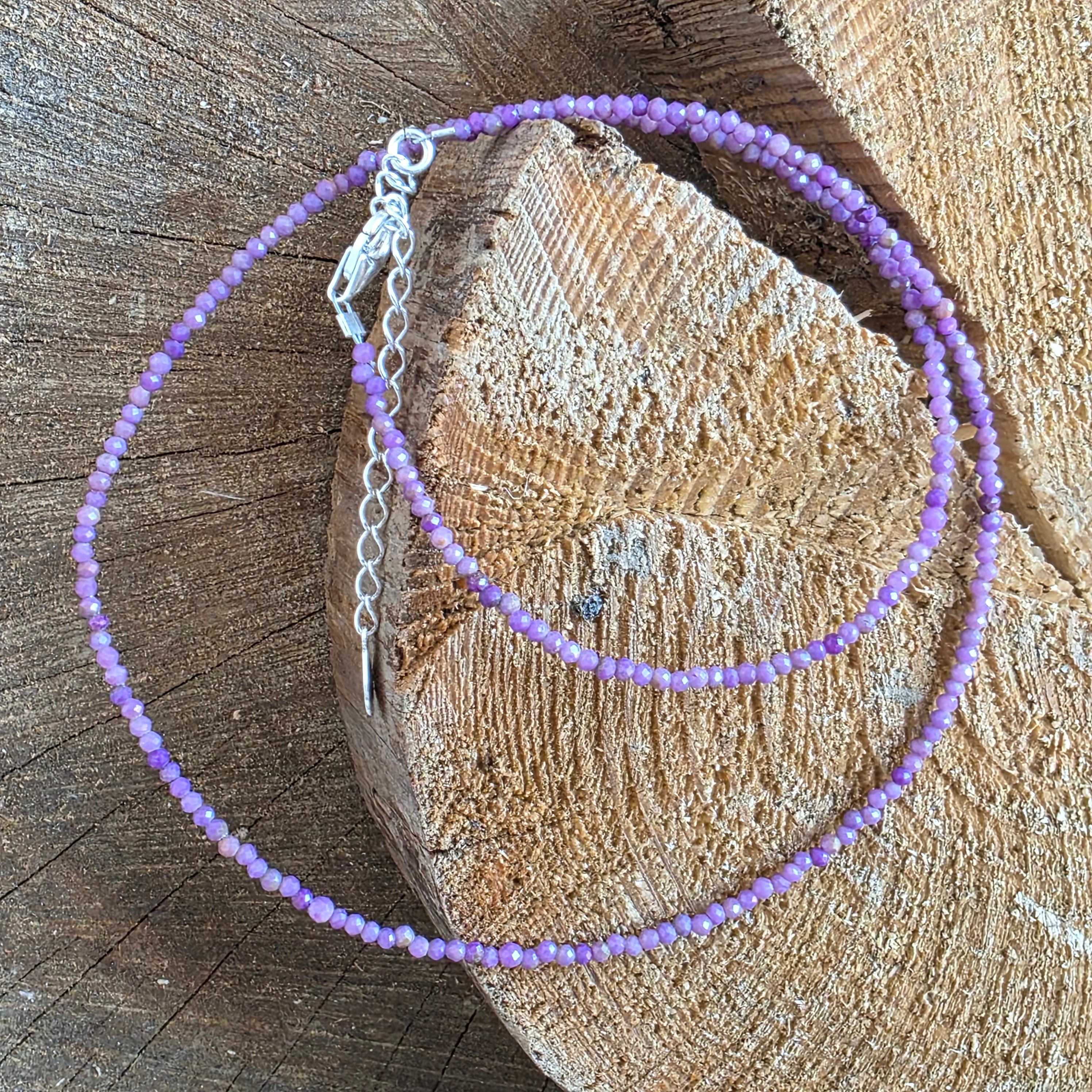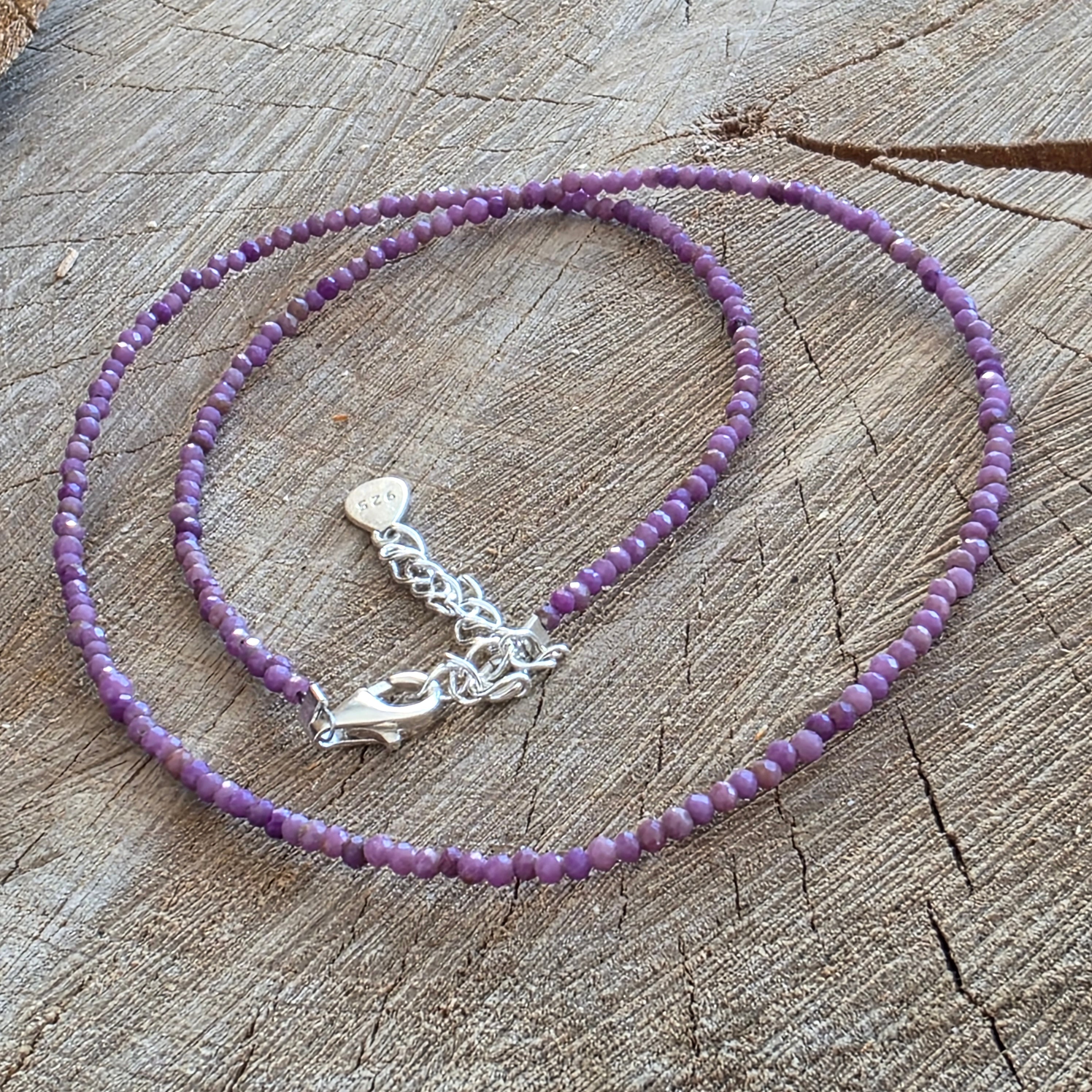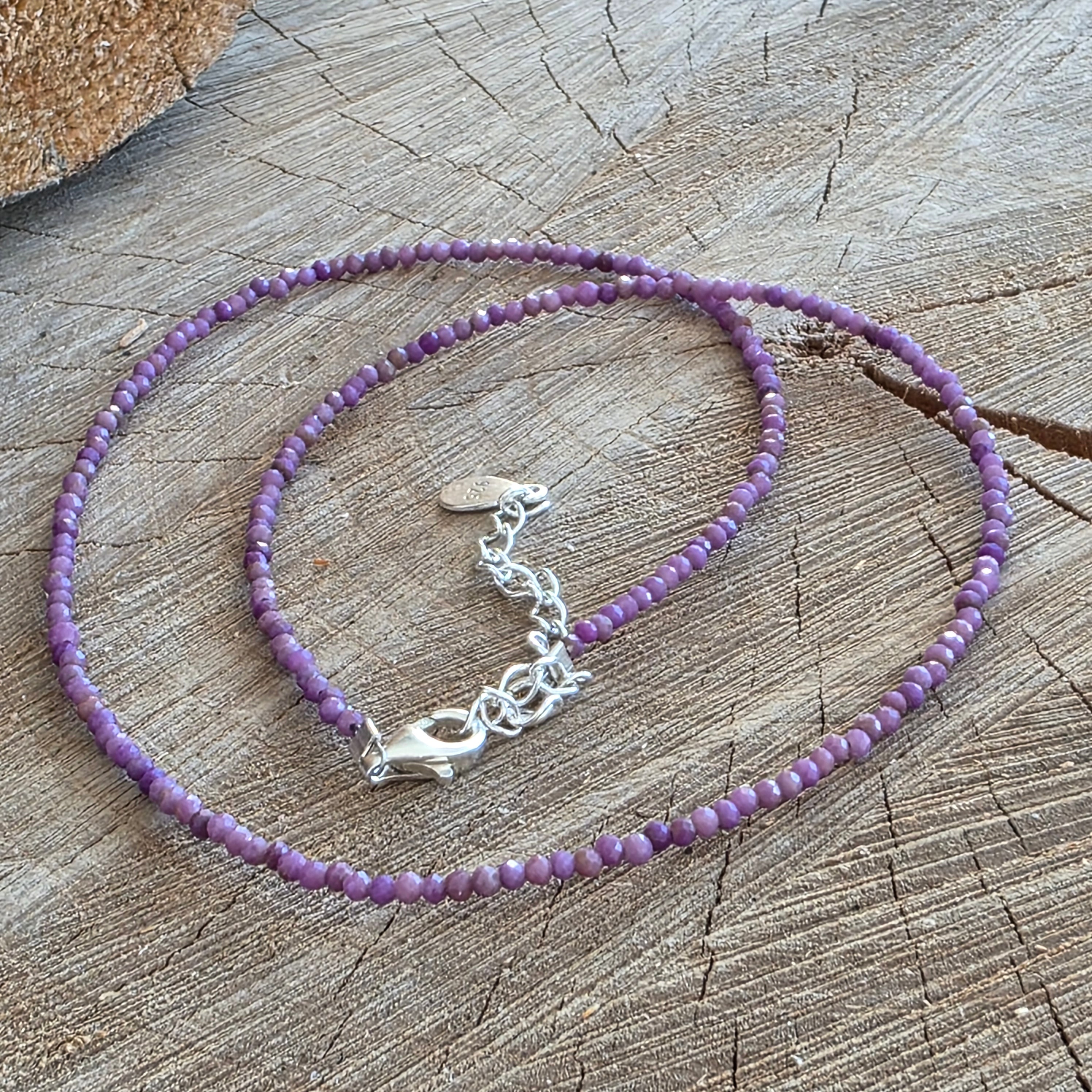 Egy finom és kiegyensúlyozott nyaklánc, 2 mm-es foszfoserit fazettált gyöngyökből, melyek finom sorozatban vannak elhelyezve, így folyamatos, diszkréten csillogó vonalat alkotnak. A pasztell lila árnyalatok, néha lilás vagy púder rózsaszín árnyalatokkal, lágy és kifinomult megjelenést kölcsönöznek az ékszernek, könnyen illeszthető mind hétköznapi, mind elegánsabb öltözékekhez. A finom fazettálás visszafogottan ragadja meg a fényt, anélkül hogy uralkodna rajta, megőrizve a nyugodt és rendezett hangulatot.