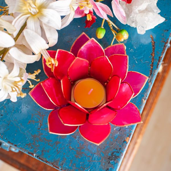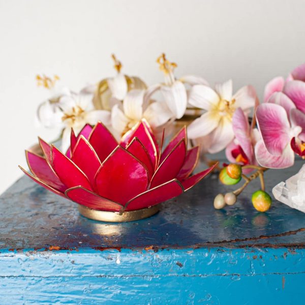 Fukszia színű, lótuszvirág mintás gyertyatartó a Fülöp-szigetekről, Capiz kagylóval