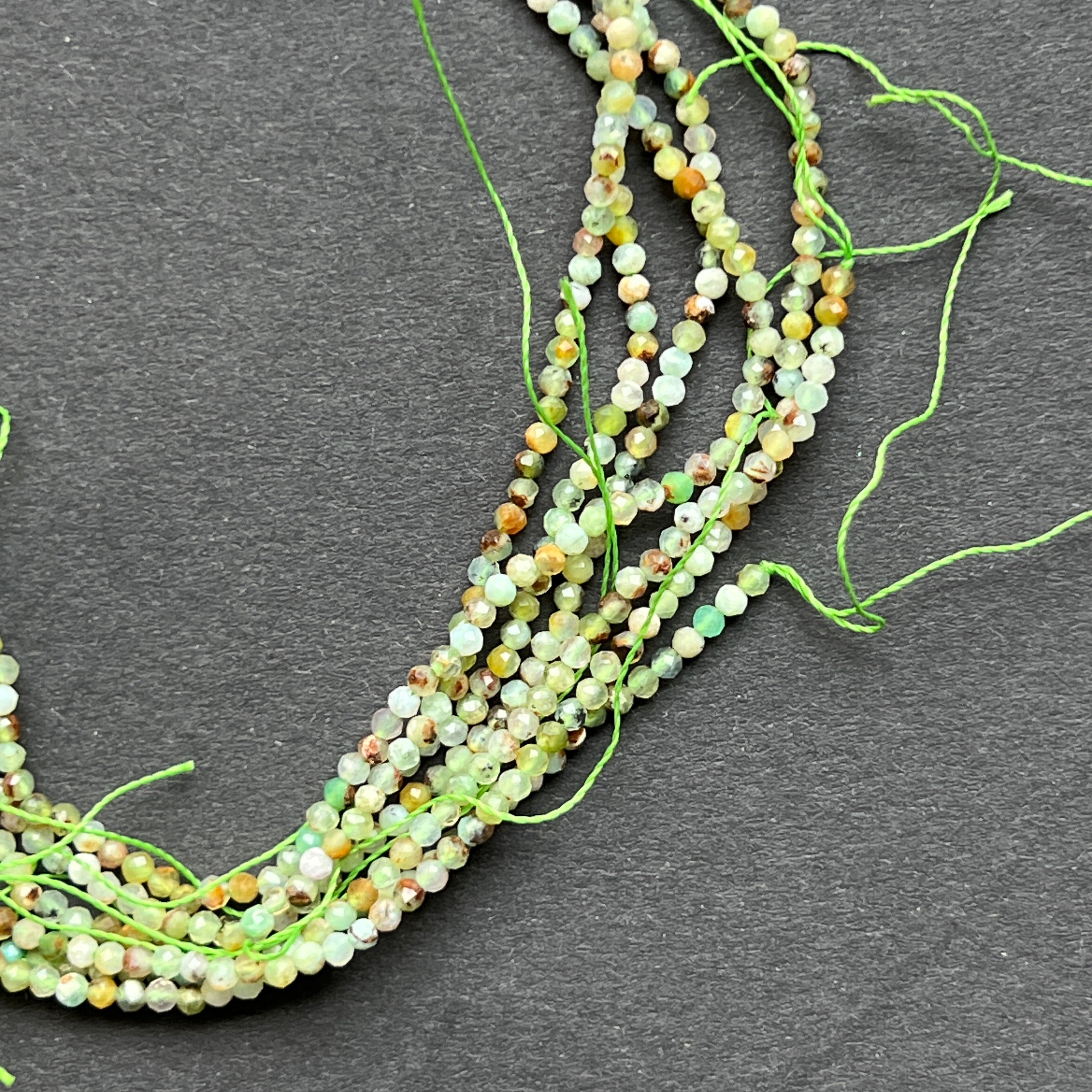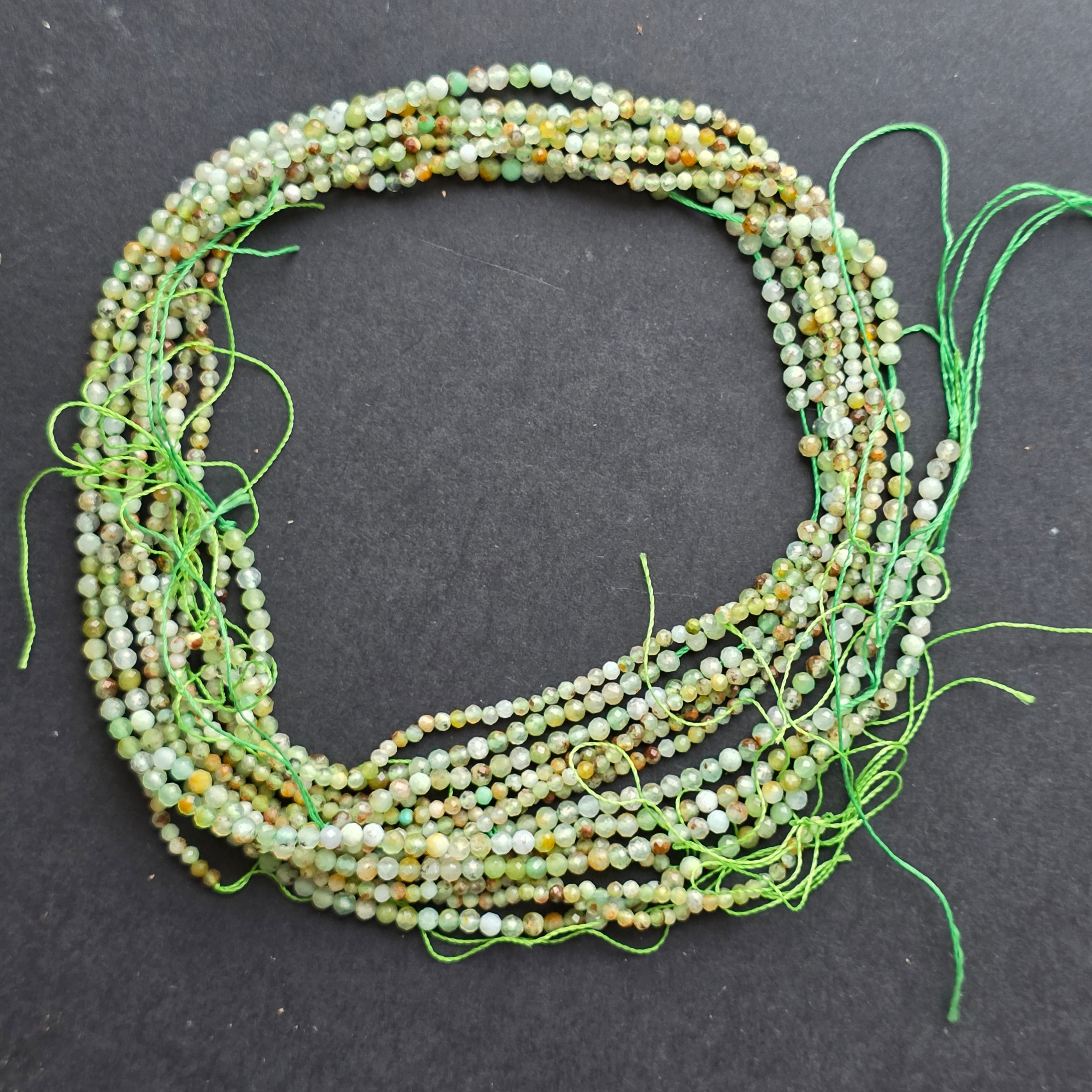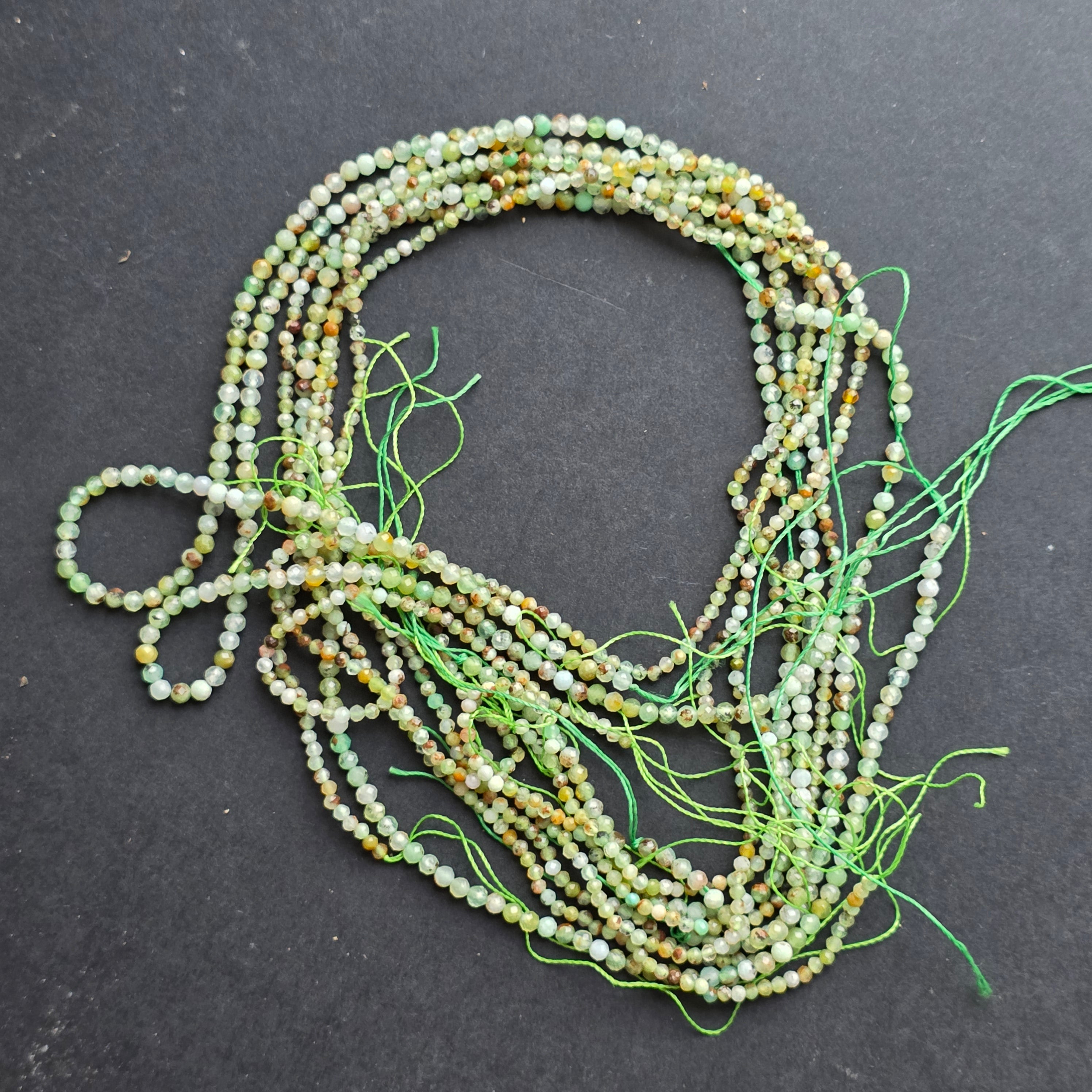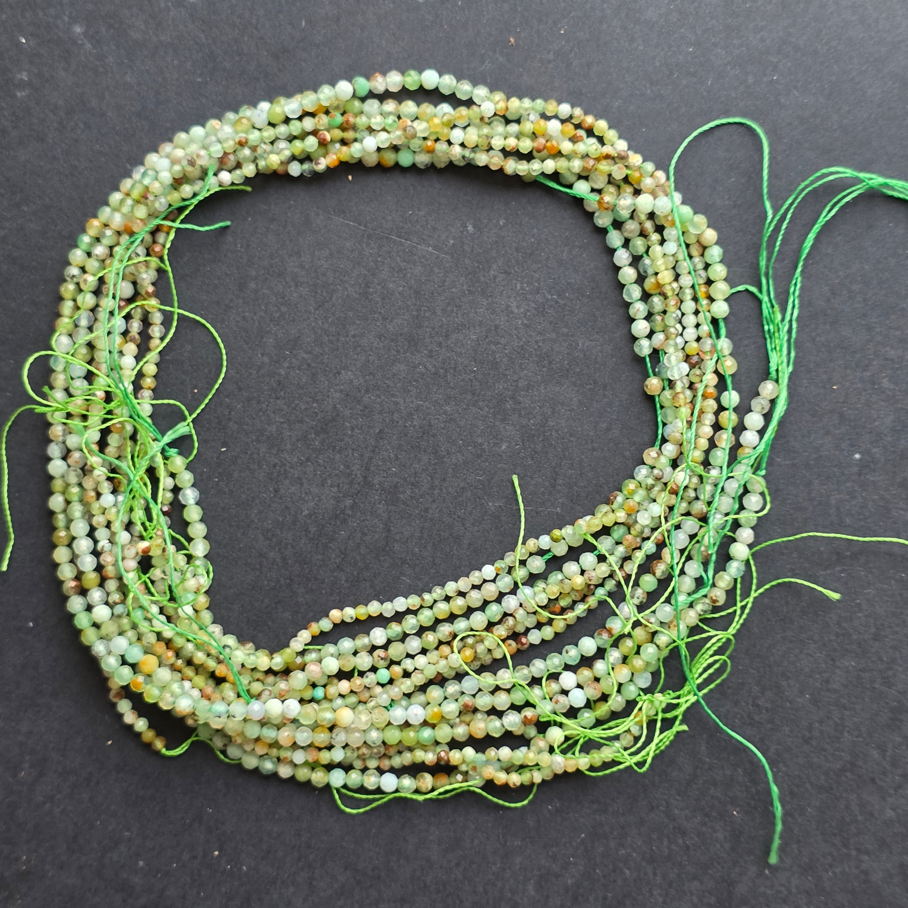 Krizopráz húr, amelyből áll természetes csiszolt gömb alakú gyöngyök, tökéletes nyaklánchoz, karkötőhöz vagy más kézzel készített ékszerhez.