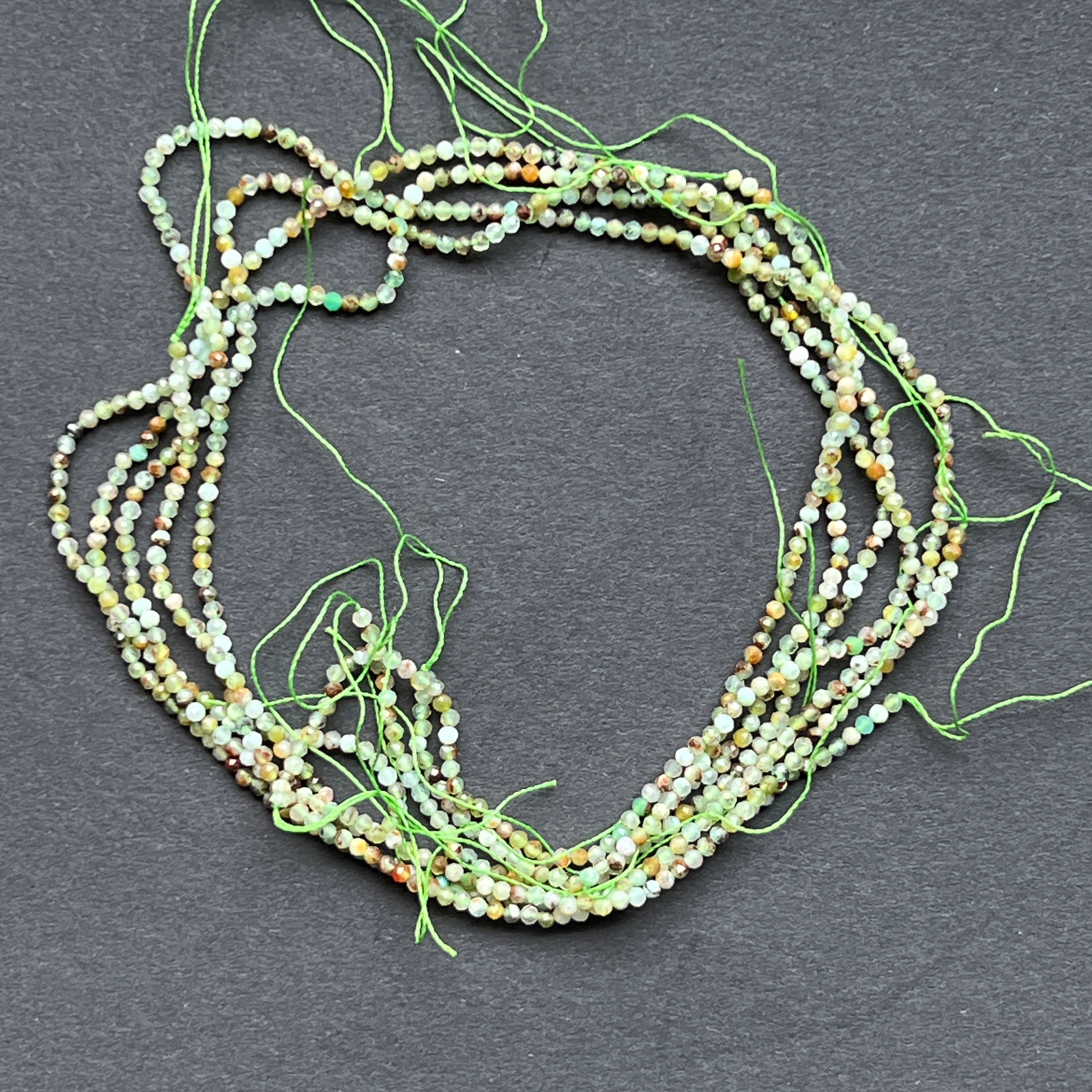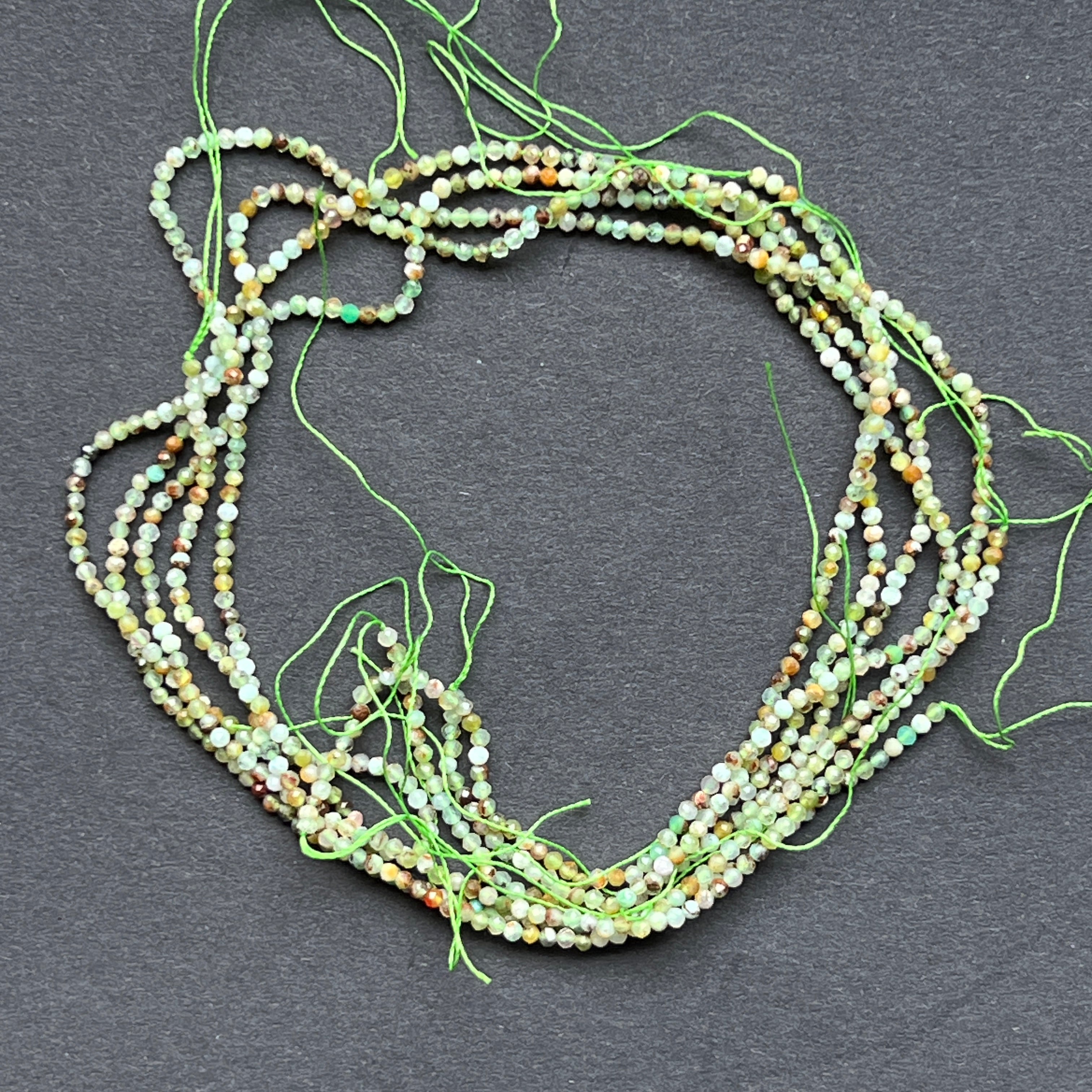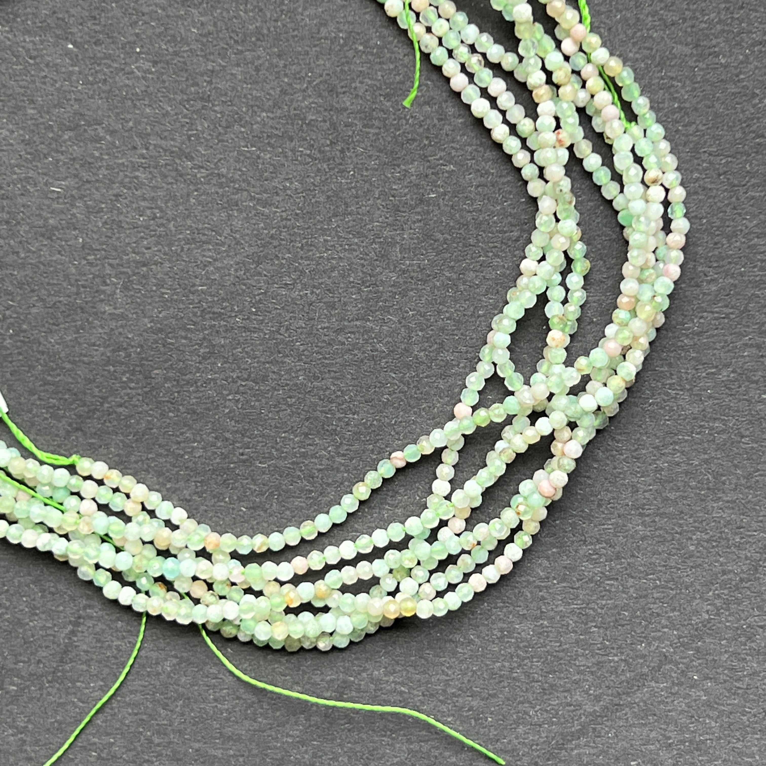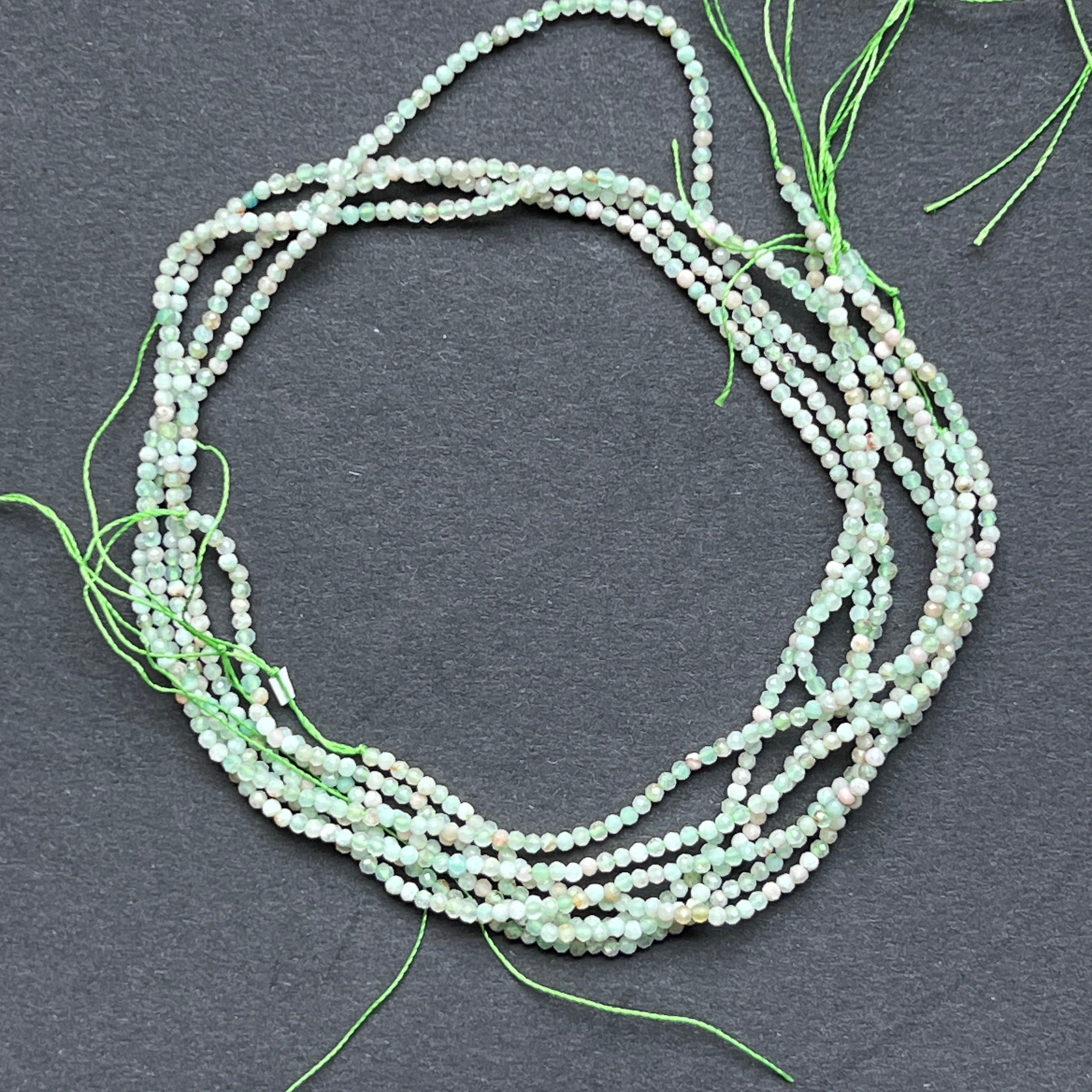 Krizopráz húr, amelyből áll természetes csiszolt gömb alakú gyöngyök, tökéletes nyaklánchoz, karkötőhöz vagy más kézzel készített ékszerhez.