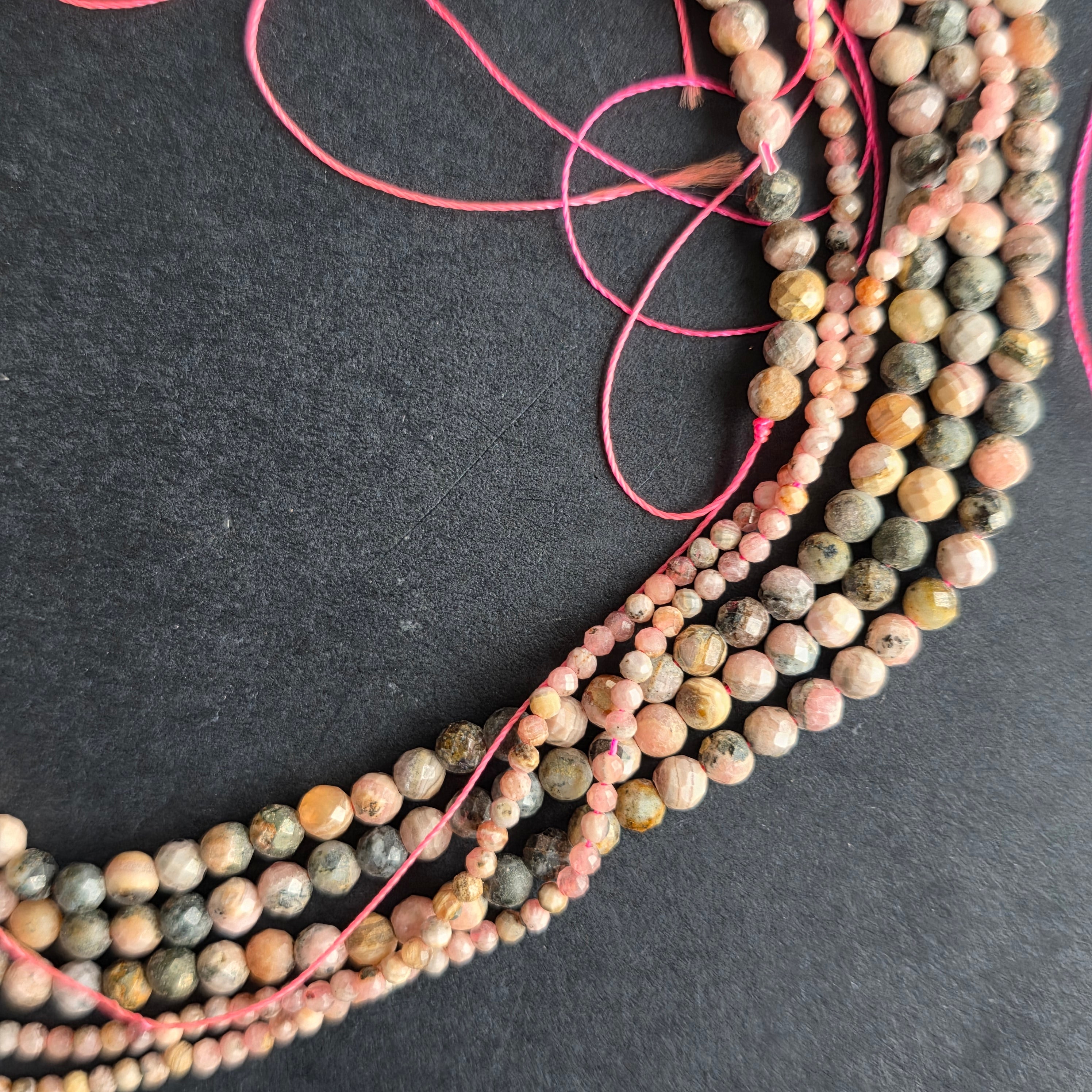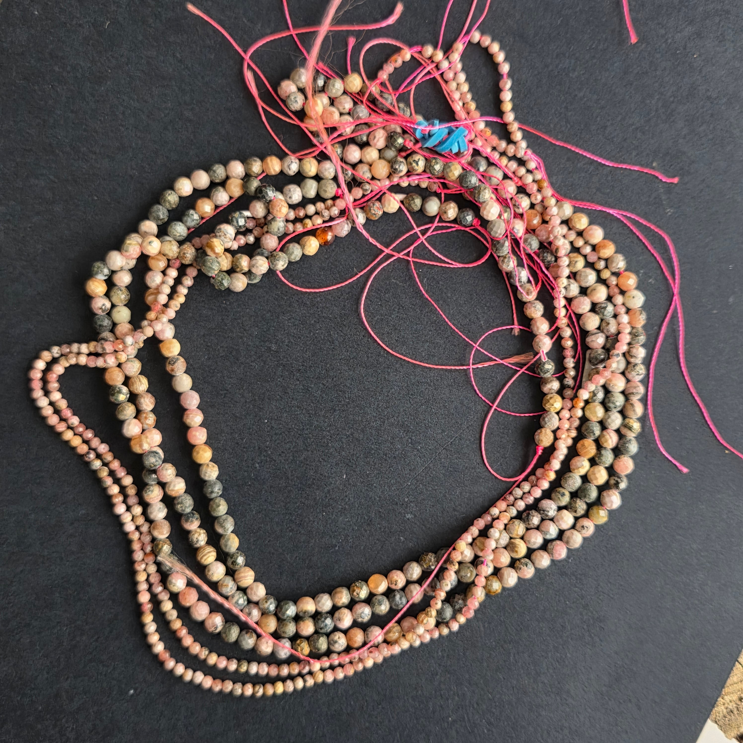 Rodokrozit szirup, amelyből áll természetes csiszolt gömb alakú gyöngyök, tökéletes nyaklánchoz, karkötőhöz vagy más kézzel készített ékszerhez.