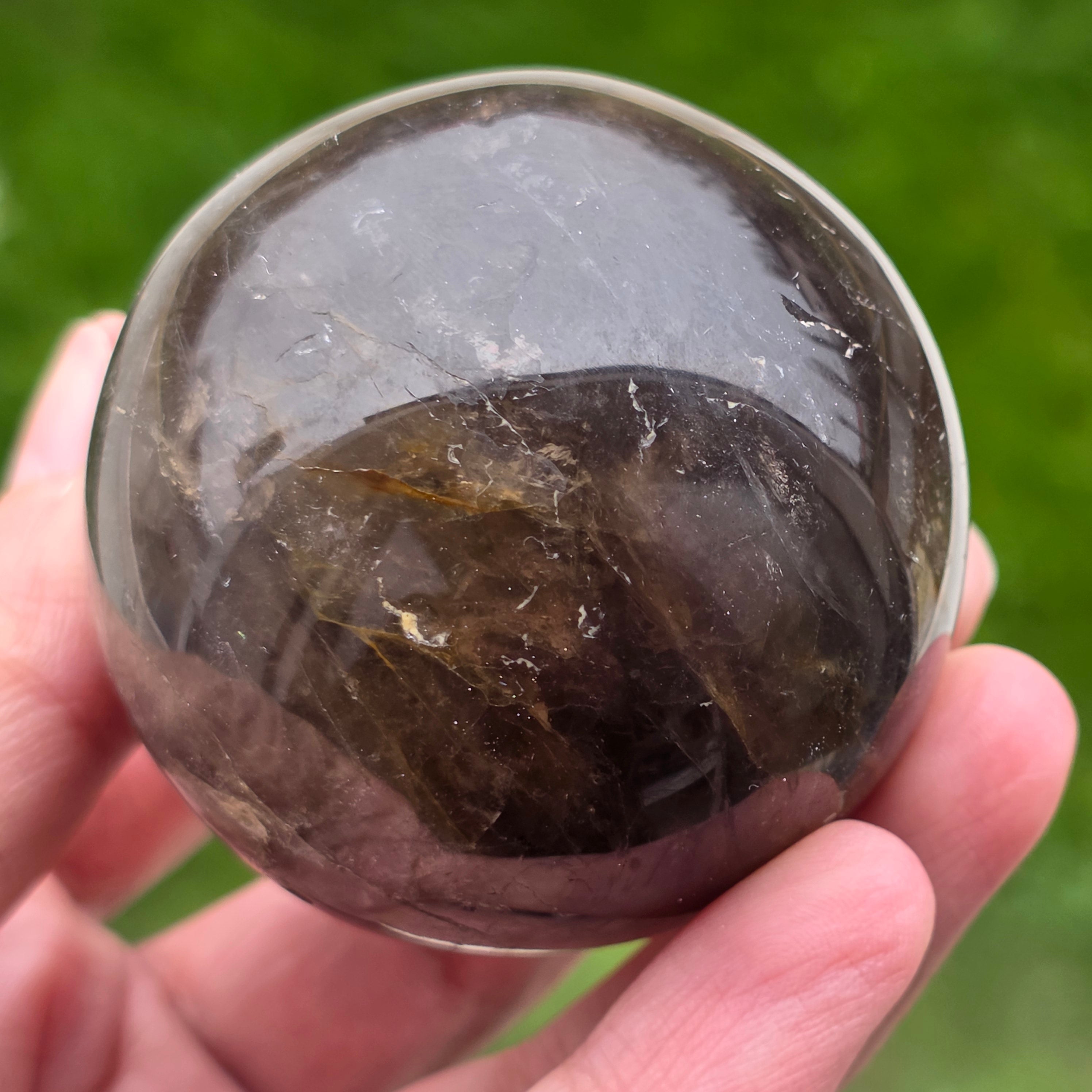 A morion kvarc gömb egy erőteljes és elegáns darab, amely mély, füsthöz vagy átlátszó obszidiánhoz hasonló árnyalatáról ismert. A morion a füstkvarc legsötétebb változata, és ebben a tökéletesen kerek formában diszkrét fényvisszaverődéseket, finom belső részleteket és valóban kifinomult vizuális jelenlétet tár fel.