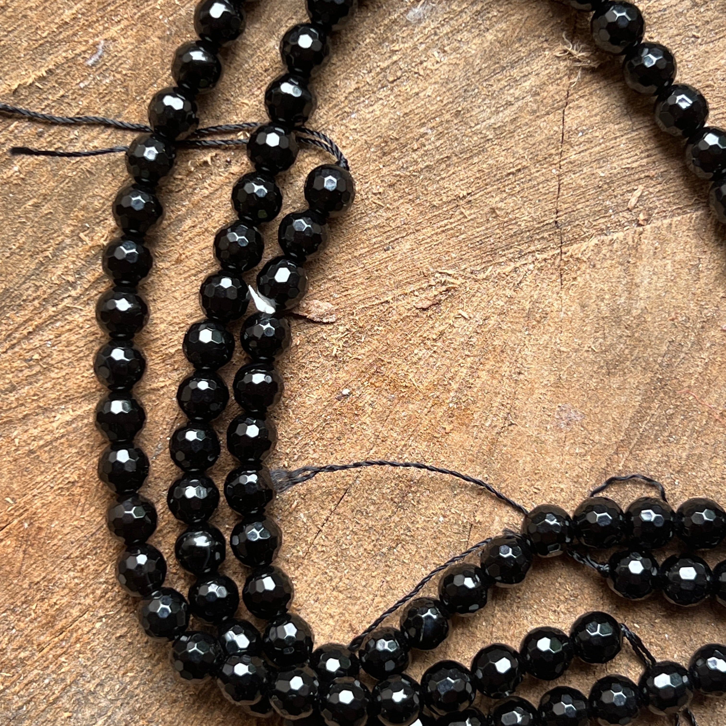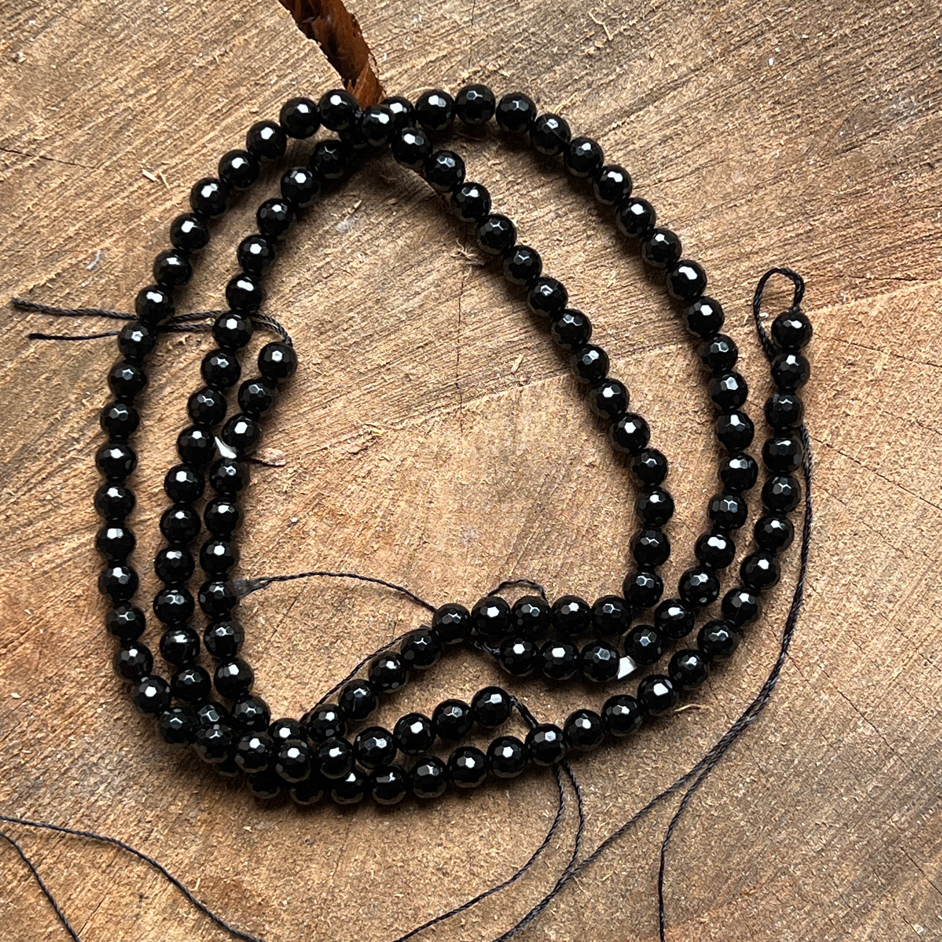 Fekete onix gyöngysor, amely természetes, csiszolt gömbgyöngyökből áll, tökéletes nyakláncokhoz, karkötőkhöz vagy más kézműves ékszerekhez.