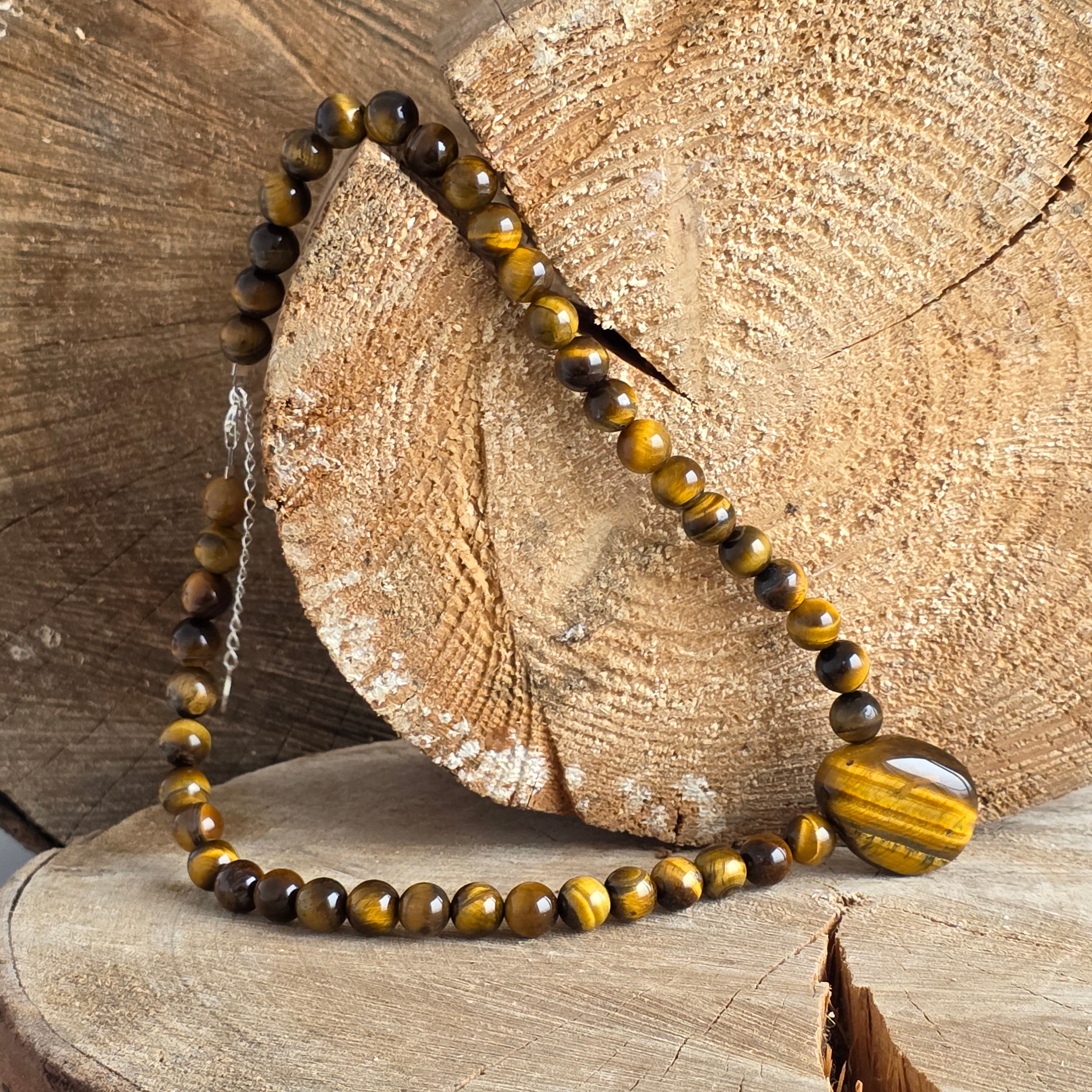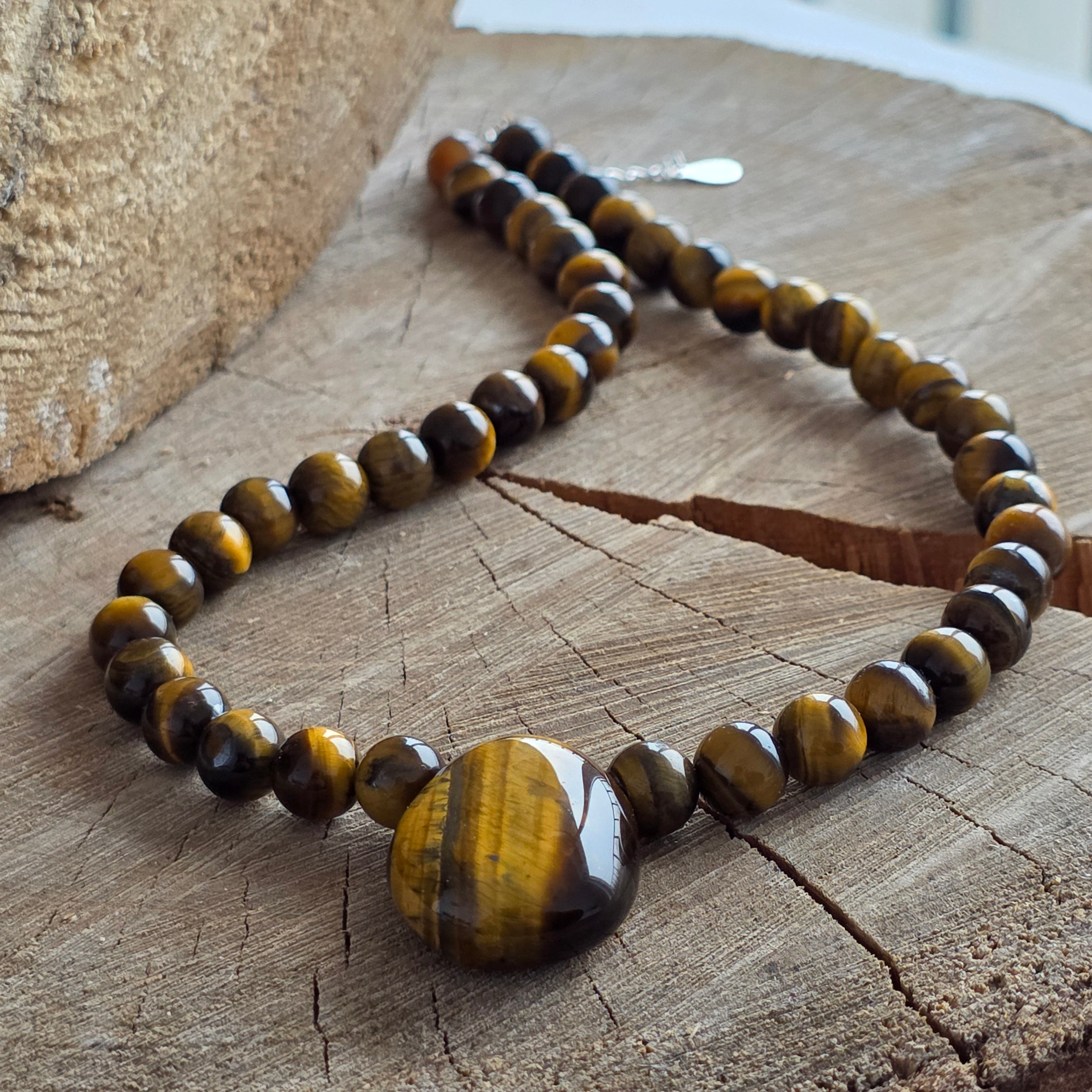 Nyaklánc meleg fényekkel és ősi védelemmel – 8 mm-es tigrisszem gömbökből készült, arany és barna árnyalatokkal, amelyek úgy táncolnak a fényben, mint a napfény az erdőben. Úgy tűnik, hogy minden kő csendes erőt, stabilitást és éber ösztönt lehel.