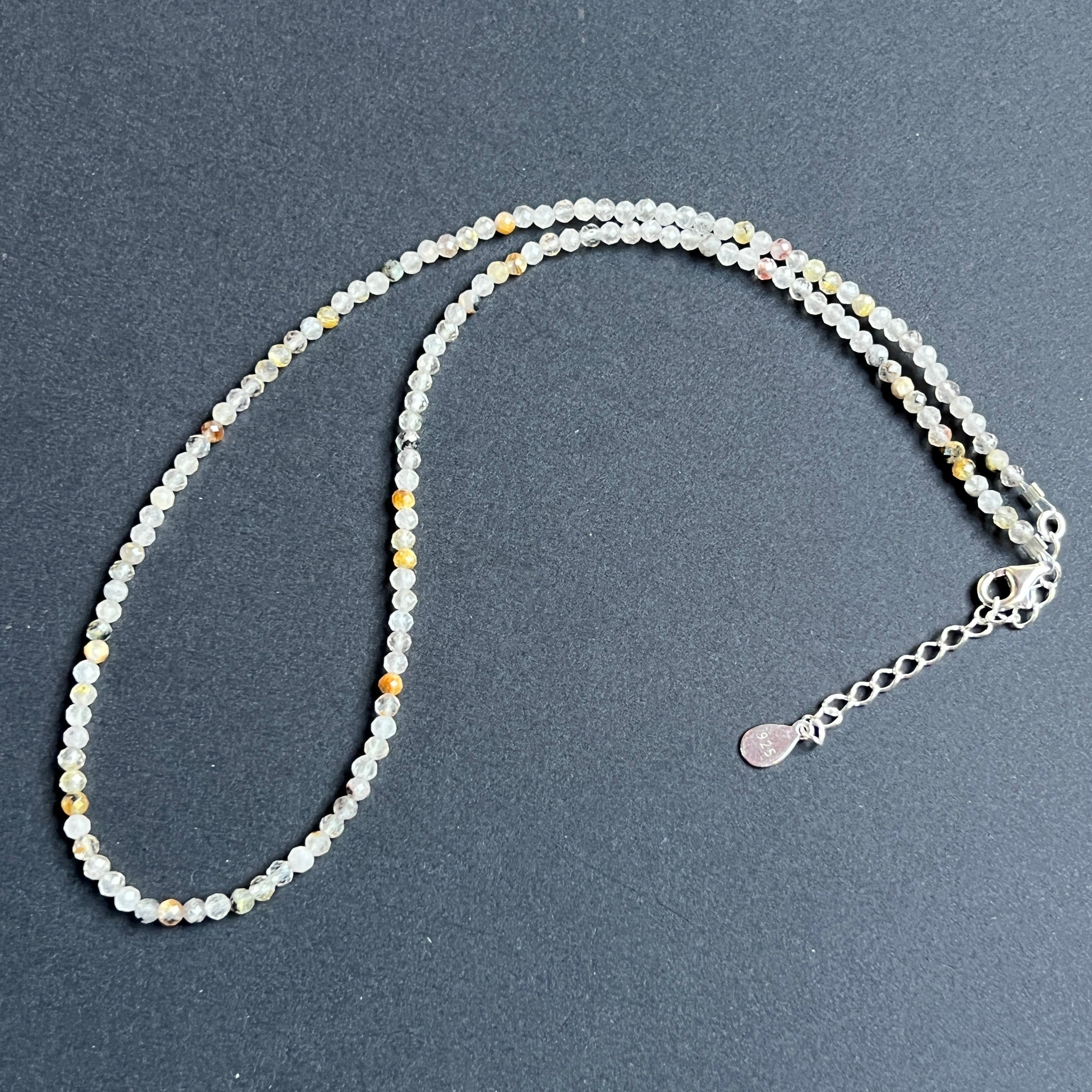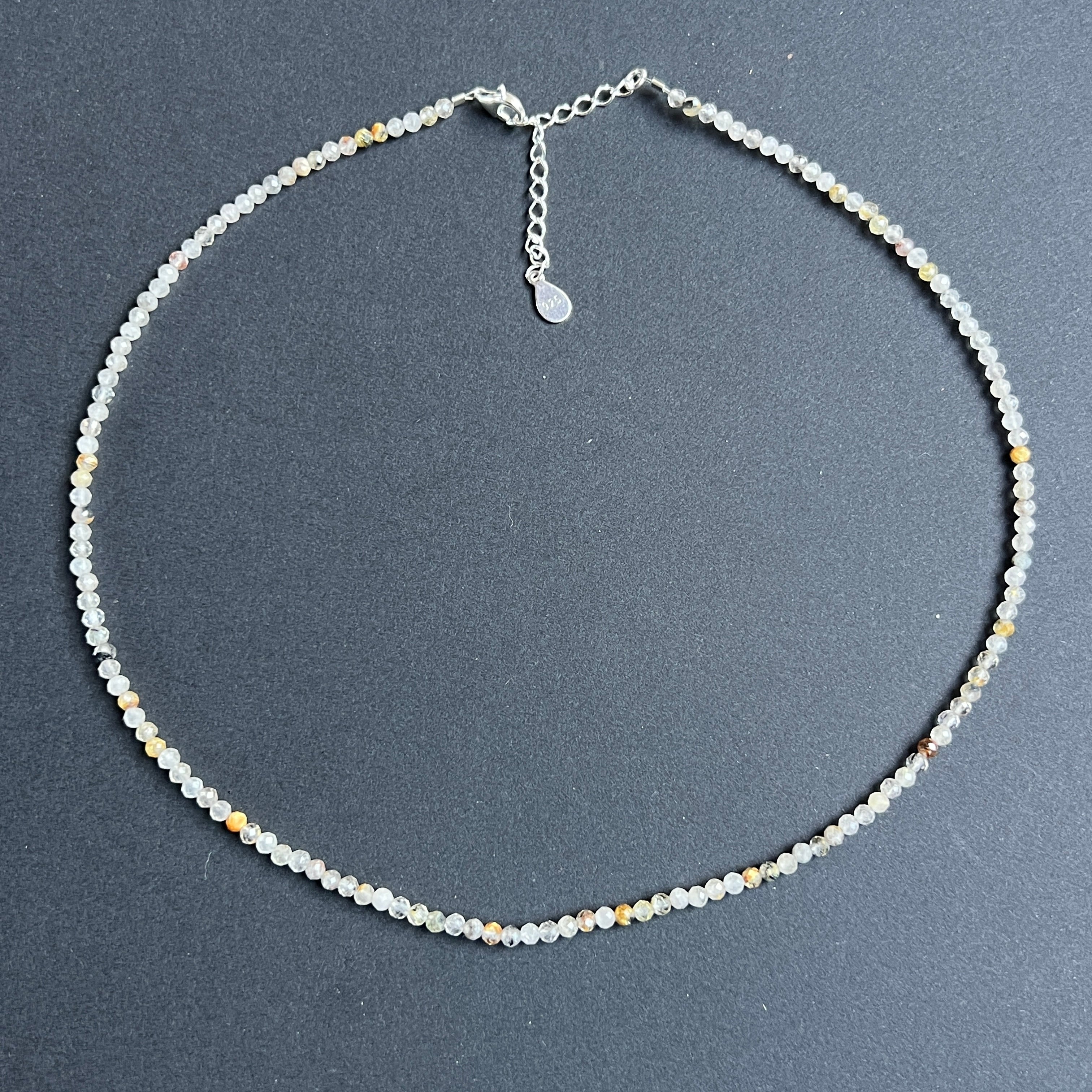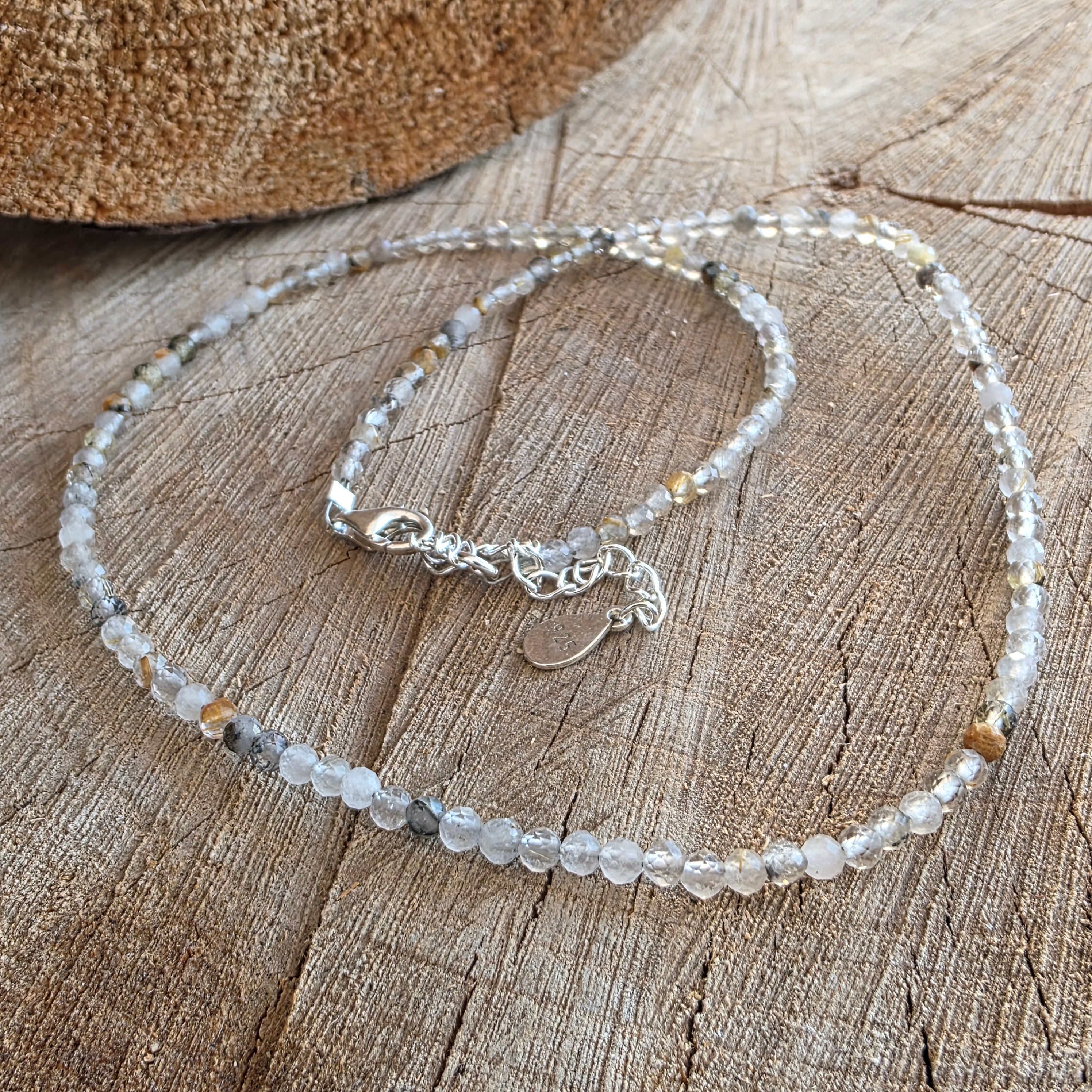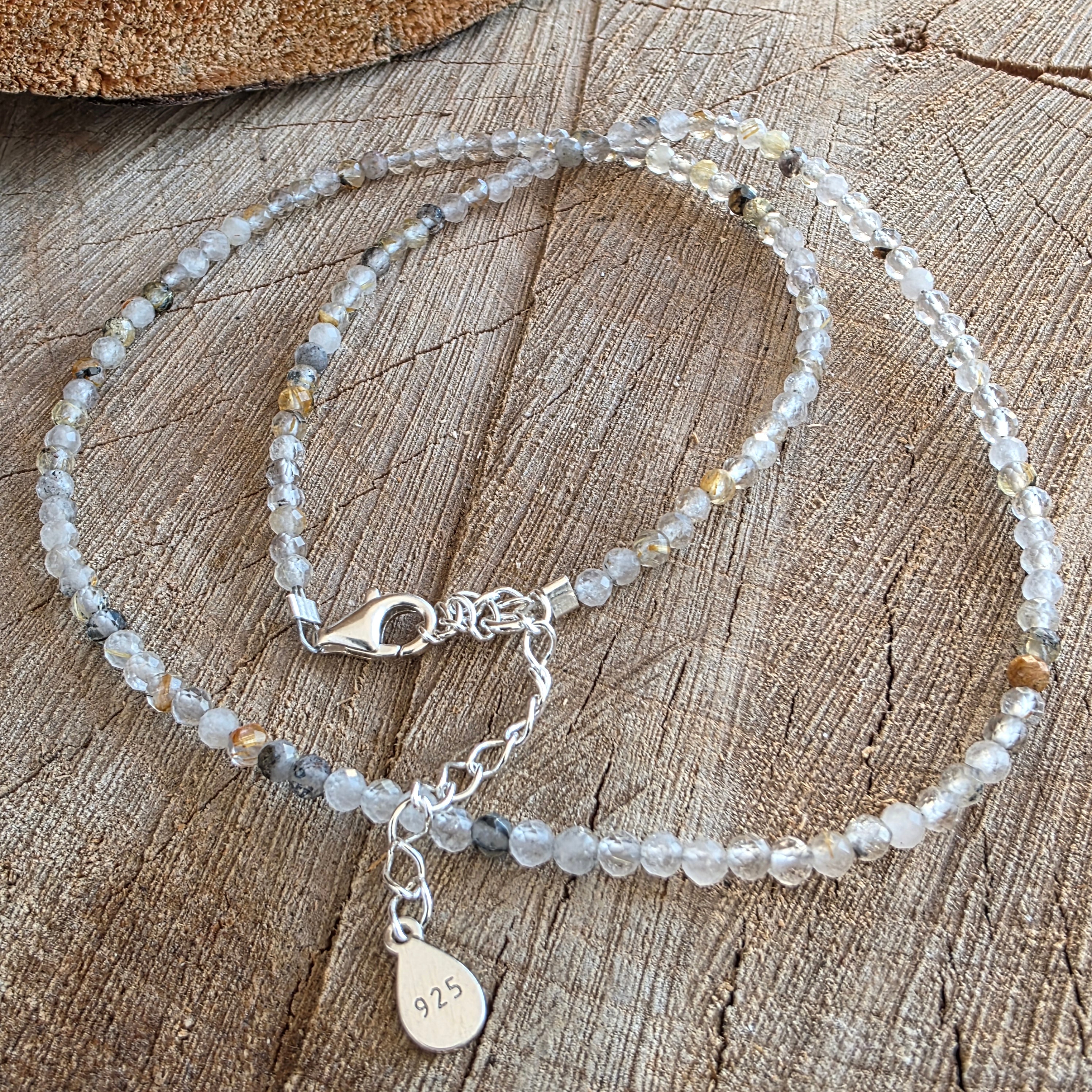 A szál csiszolt gyöngyökből áll 3 mm-es rutilált kvarc, mindegyik egy egész világot tart magában. Ez a ritka kvarcfajta finom rutiltűket tartalmaz – arany- vagy rézszálakat, amelyek átlátszóságban vannak felfüggesztve, mint a kristályban rekedt napszálak. Diszkrét reflexei finom szögekben fogják fel a fényt, élénk, mégis nyugodt mozgás benyomását keltve.