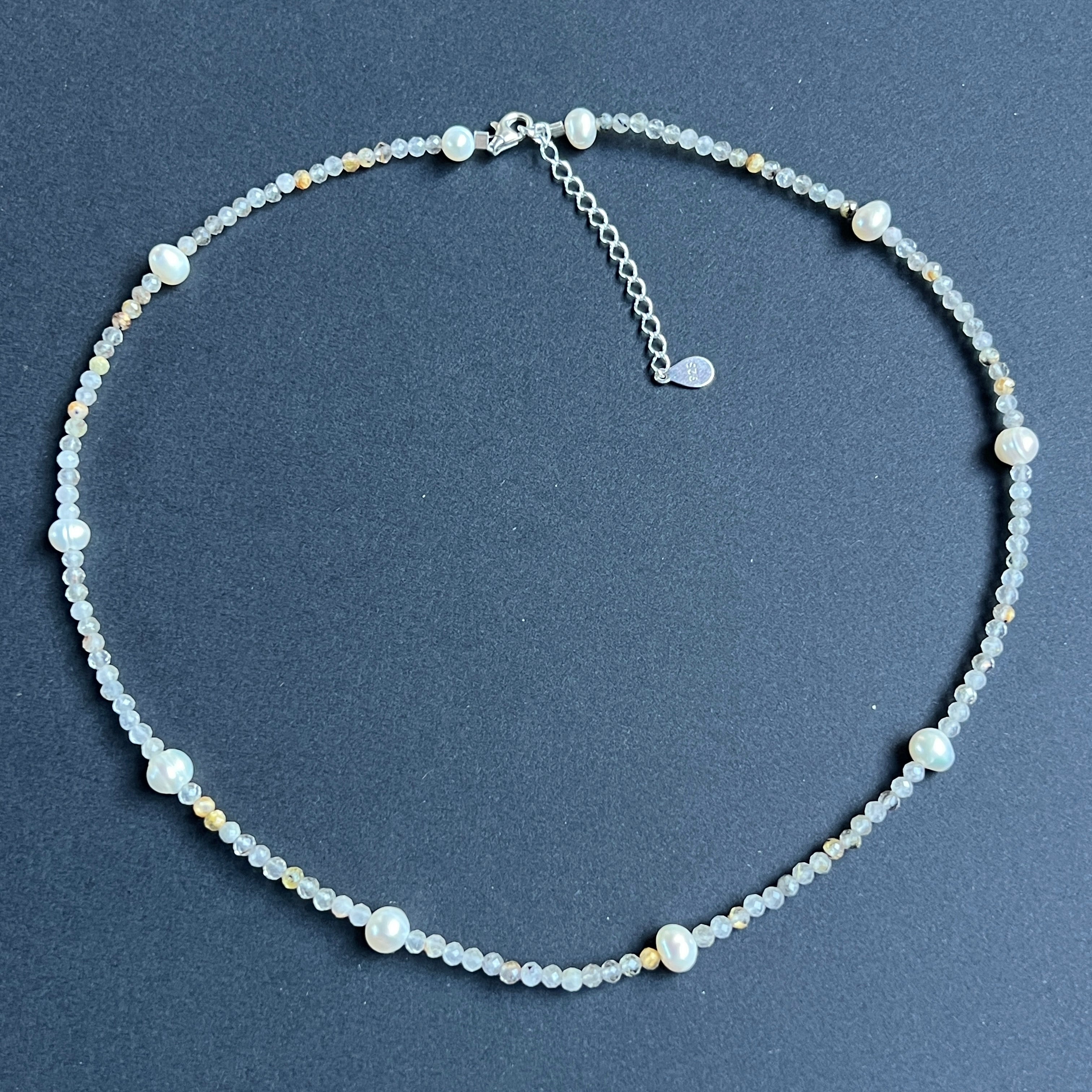 Ez a váltakozás finom játékot hoz létre a fény és a textúra között – a tisztaság és a forma, az éter és az anyag között. A gyöngyök gyöngyházas, tökéletlen felületükkel a klasszikus költészetet adják, egyensúlyt és lágyságot kölcsönözve a rutilált kvarc agyi ragyogásába.