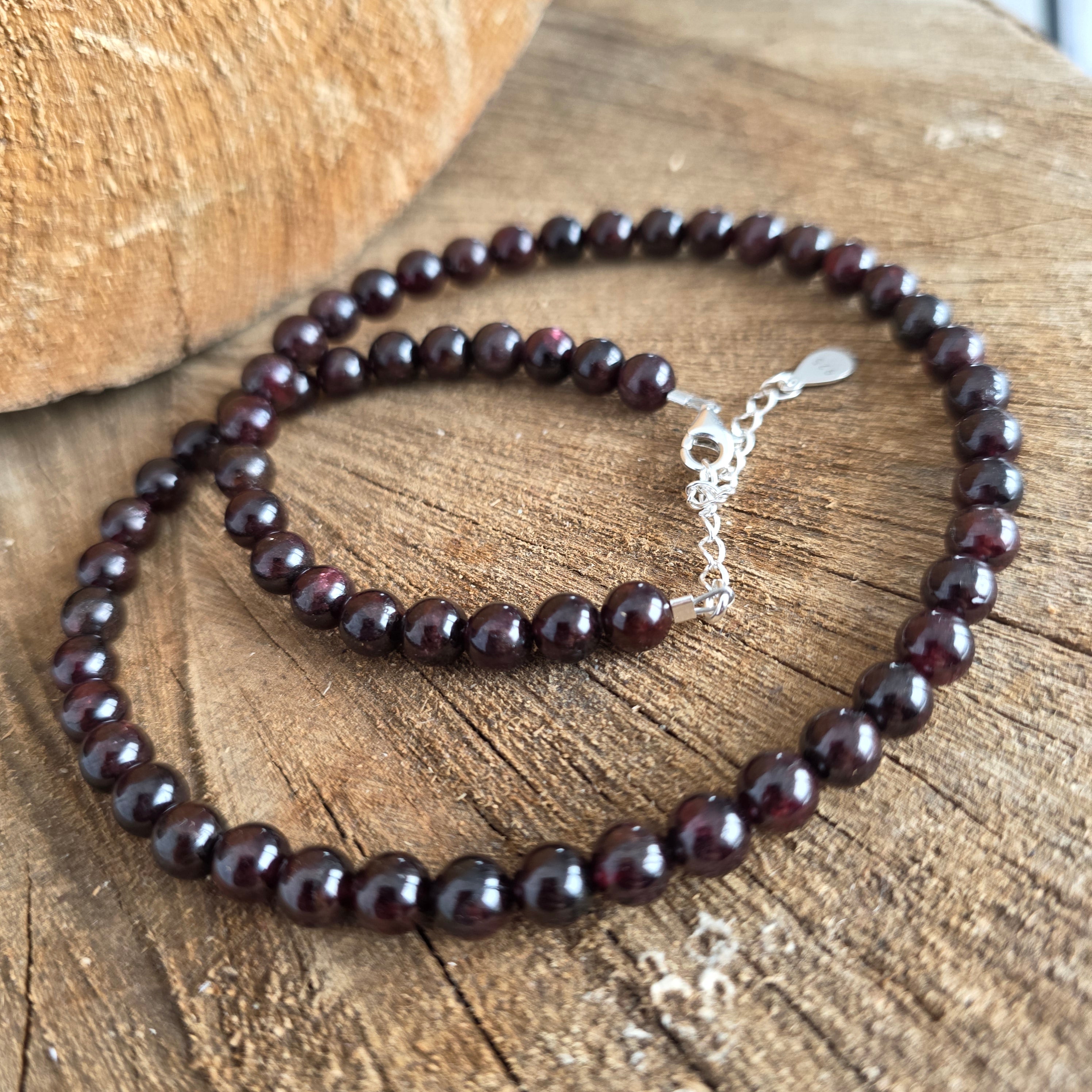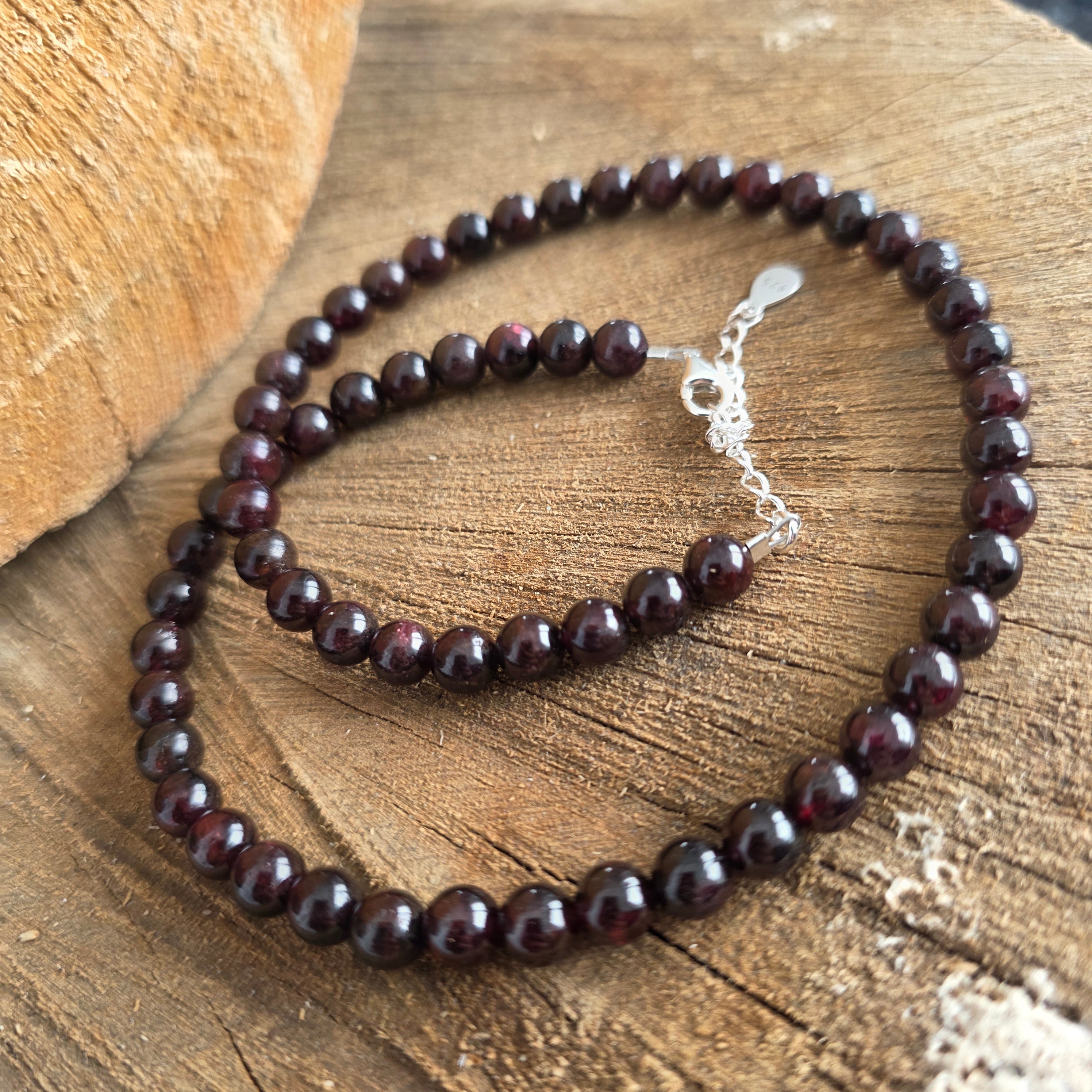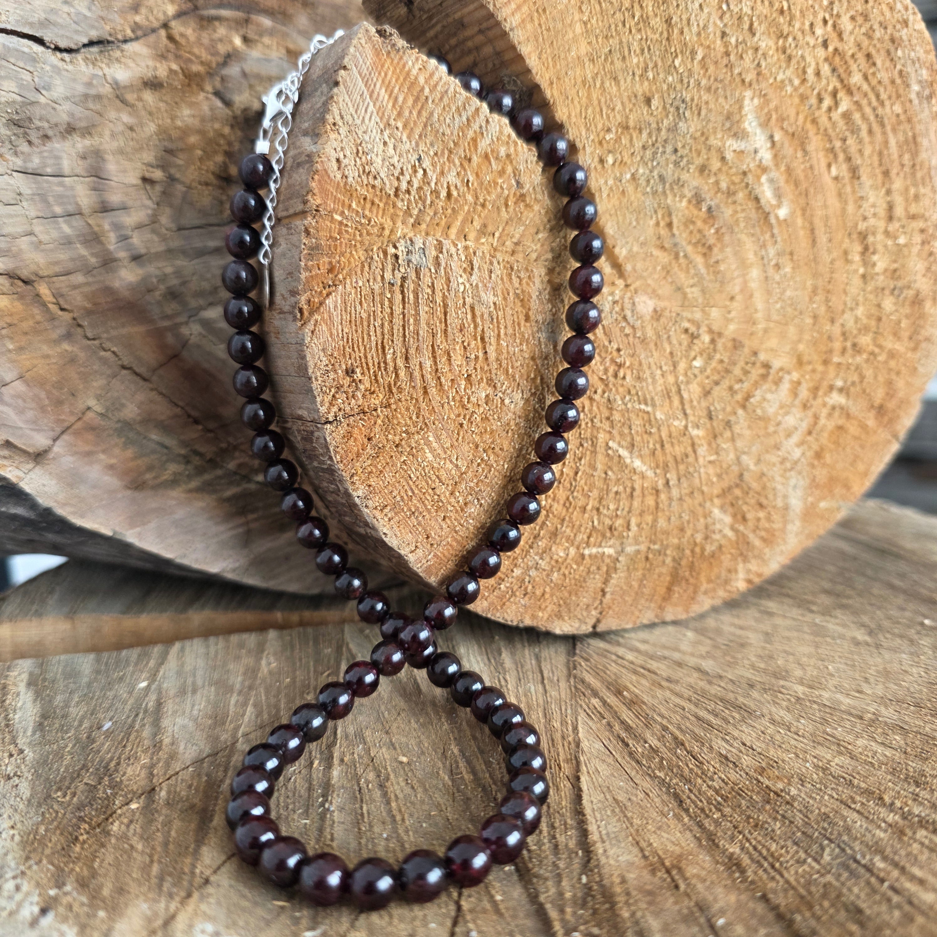 Egy nyaklánc, amely megragadja az életenergia és a természetes elegancia lényegét. A 6 mm-es természetes gránát mélyvörös árnyalataival diszkrét csillogást hordoz, mintha egy szív csendesen dobogna a föld mélyén. A sima gömbök egyszerűsége klasszikus és időtlen megjelenést kölcsönöz, kiemelve a kő valódi szépségét.