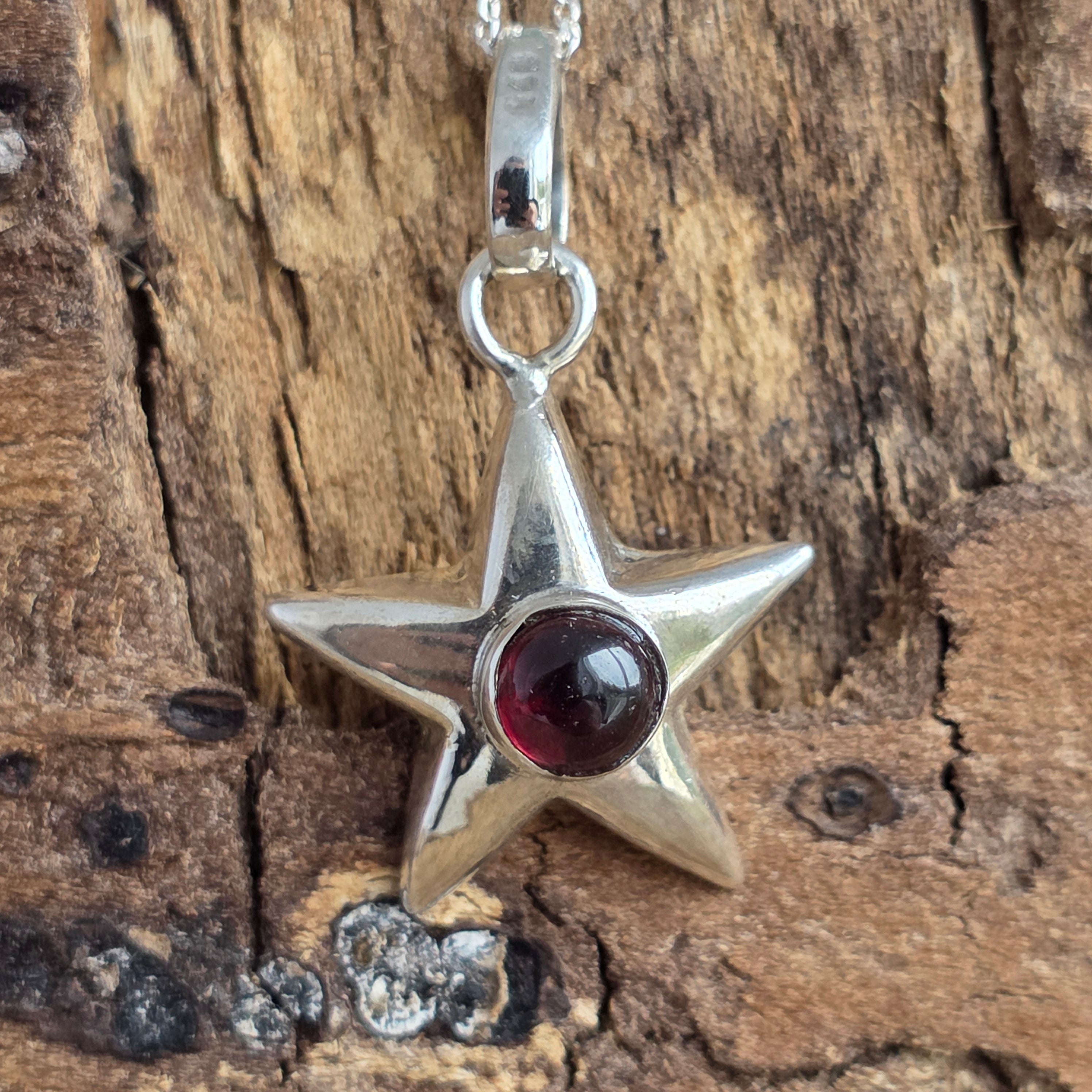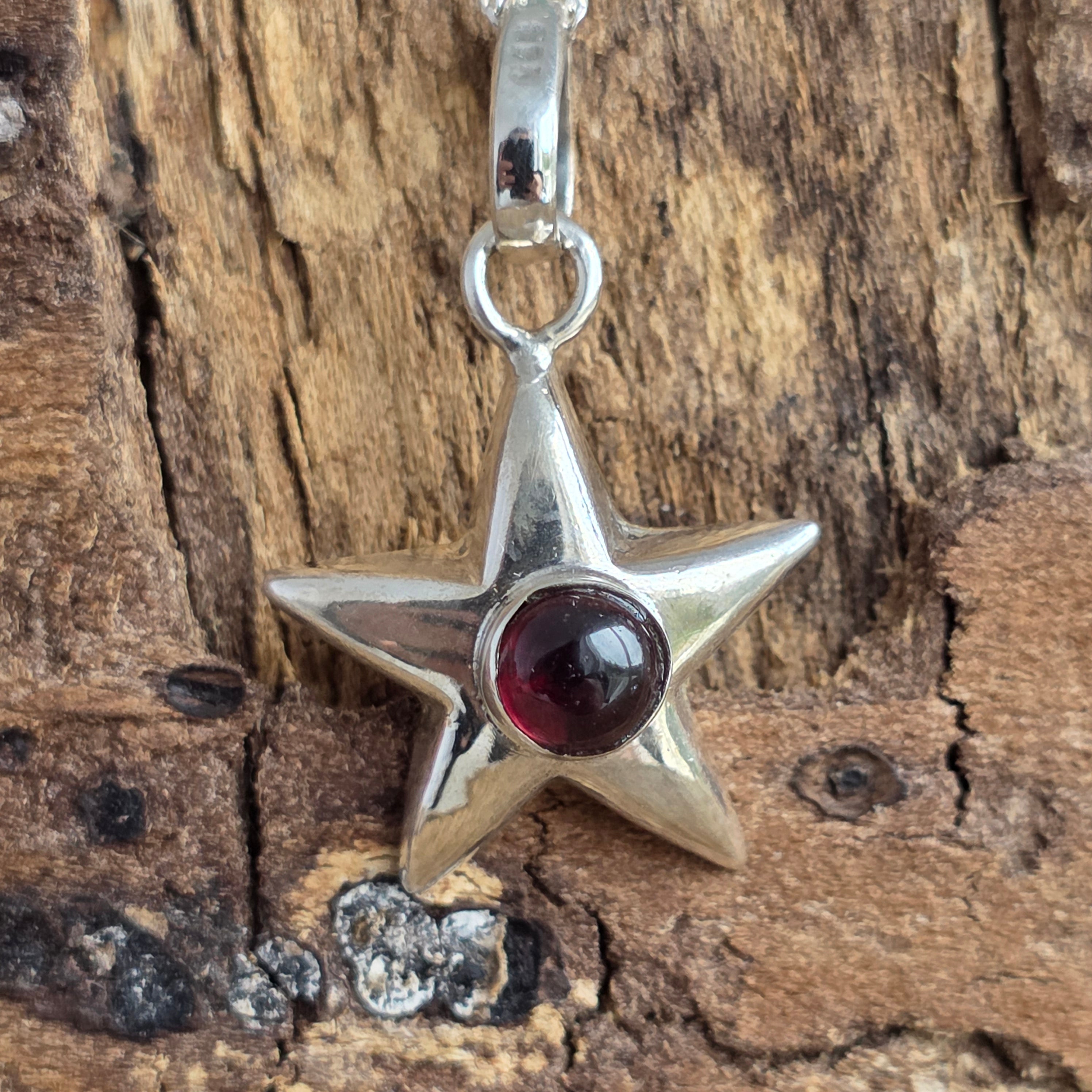 Finom medál tőle 925 ezüst, fényes csillag formájában mintázva, amely a közepén egy követ hordoz természetes gránát – mélyvörös és élettel teli.