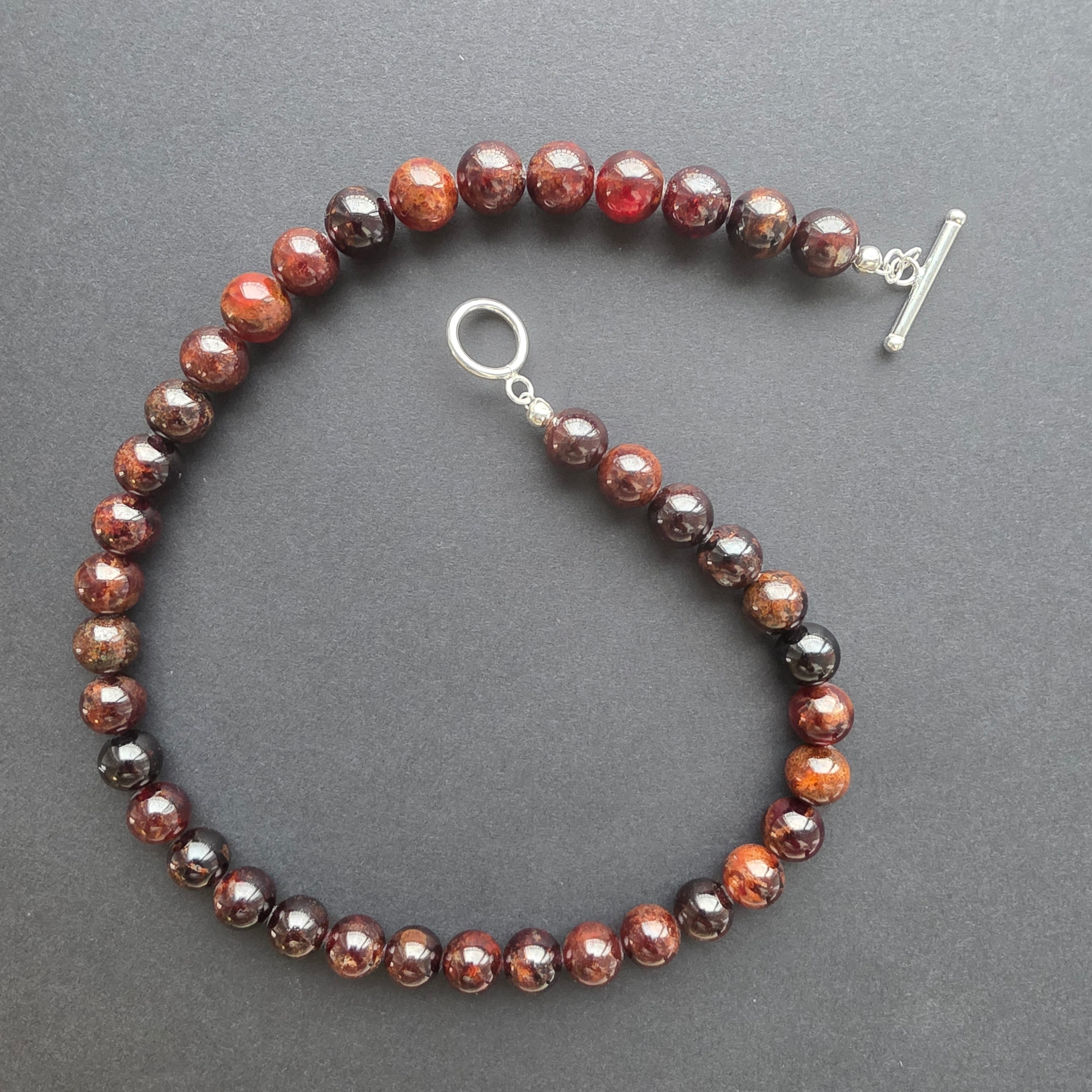 Egy nyaklánc, amely magában hordozza a föld tüzét és a mélység nemes eleganciáját. A természetes gránát mélyvörös tónusaival és finom rubinboros tükröződéseivel élénk szenvedélyt, életenergiát és belső erőt ébreszt. Minden 10 mm-es gömb olyan, mint egy ásványszív, tele élettel és titokzatos fénnyel.