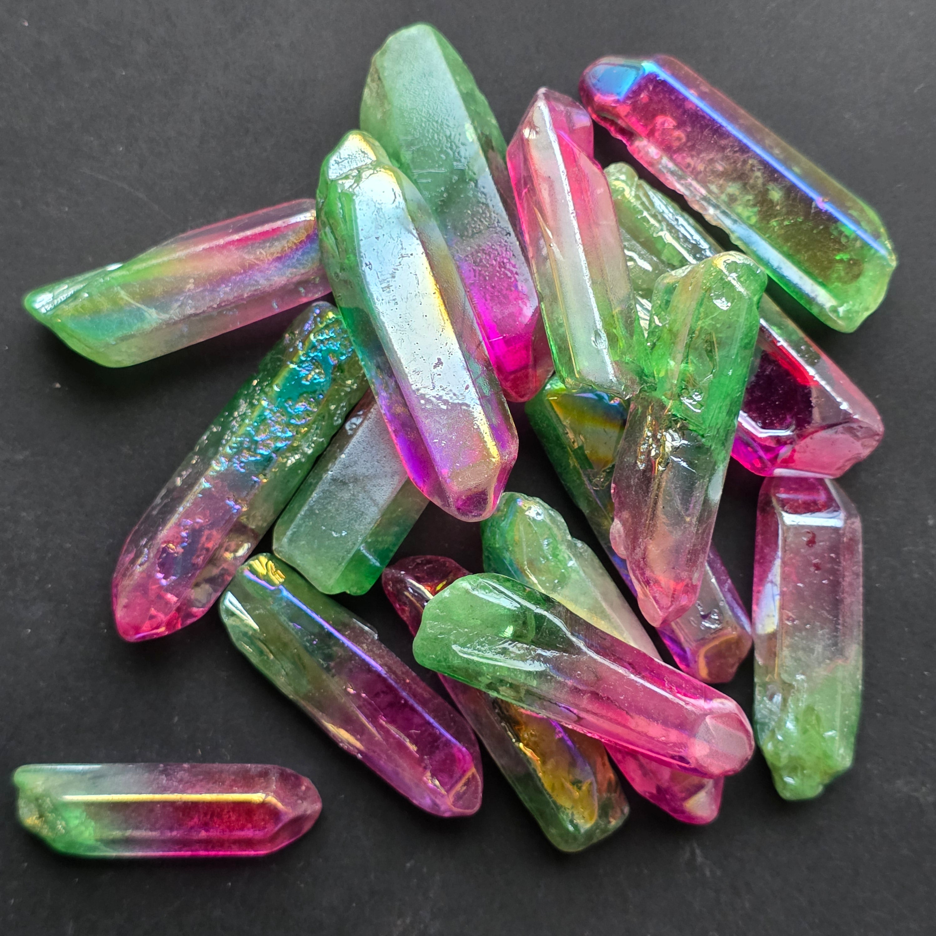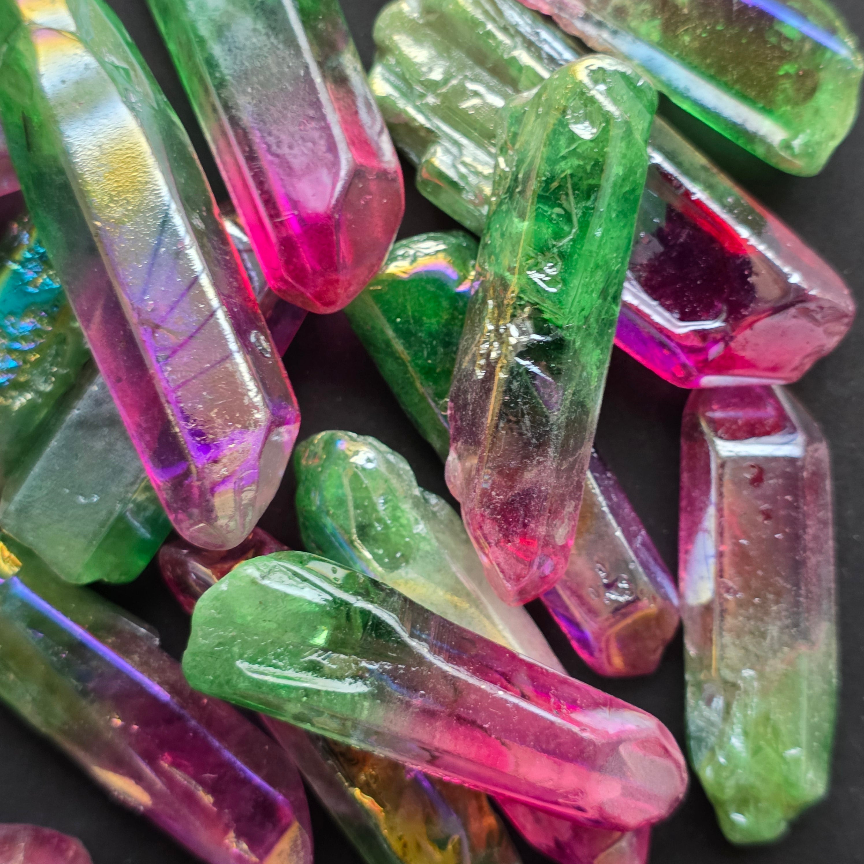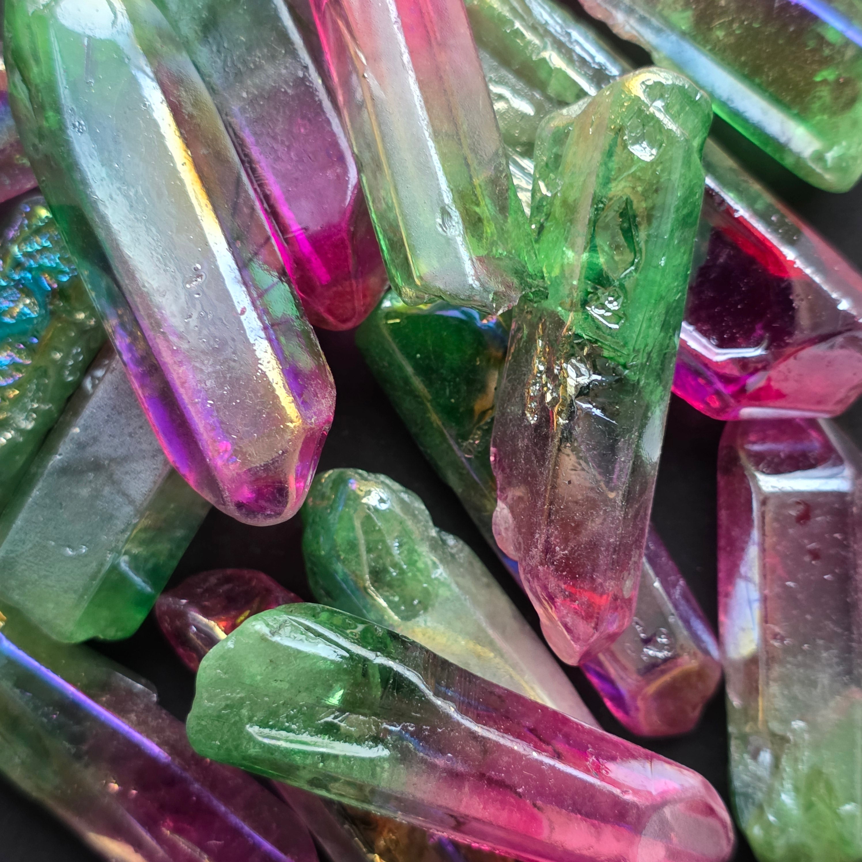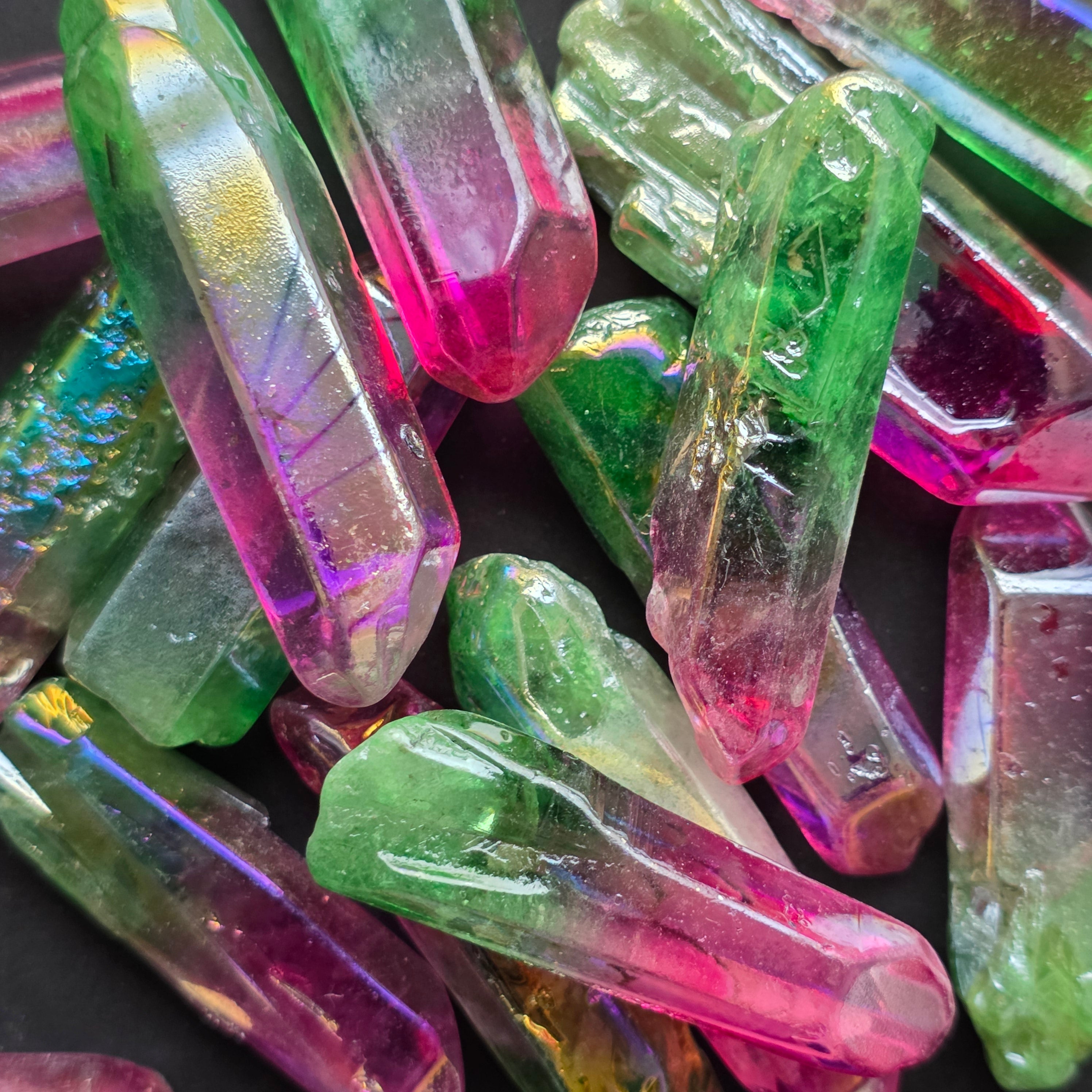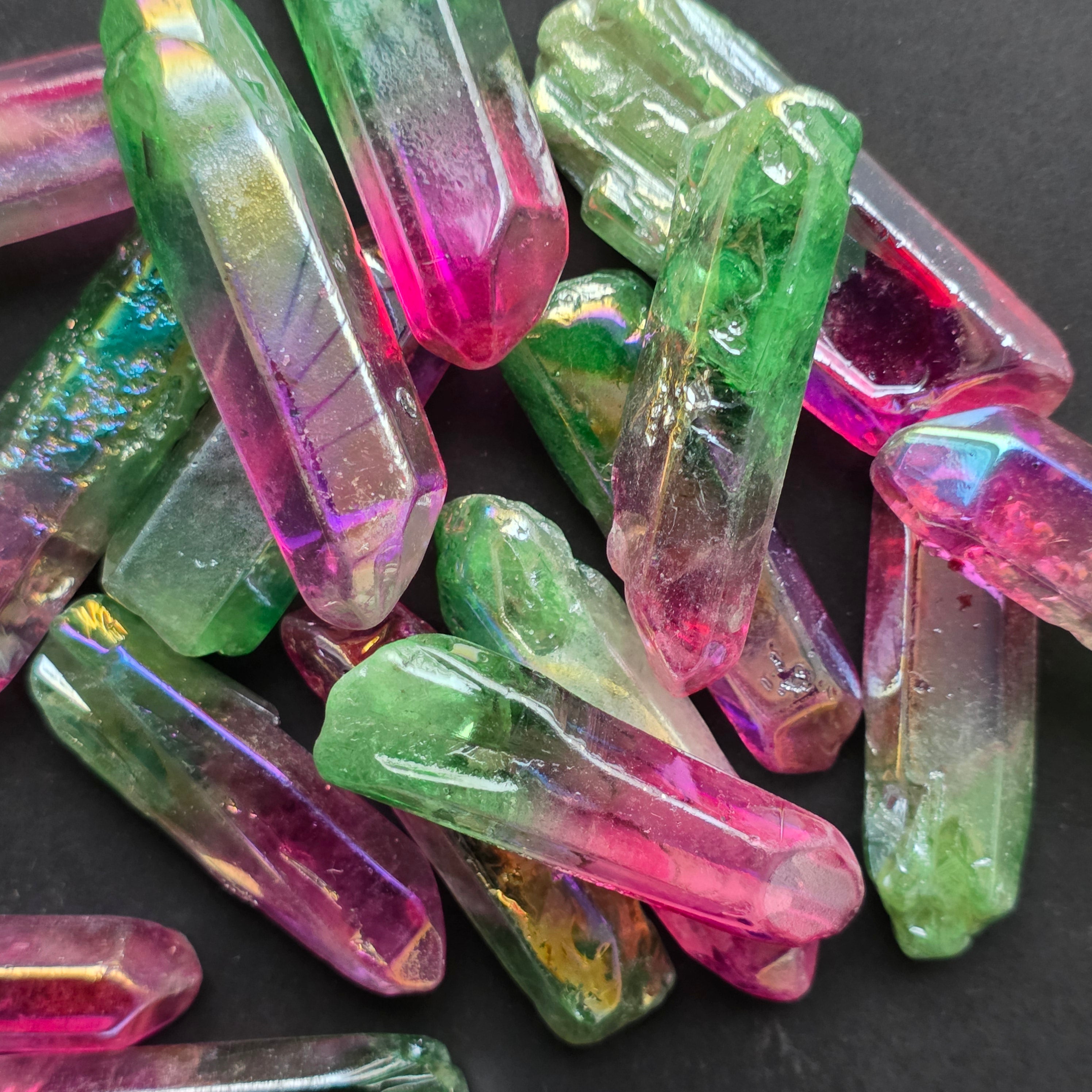 Ez a kvarc színezett, az úgynevezett aura bevonat folyamatán keresztül, hogy fokozza az irizáló fényeket és a kristály vibráló energiáját.