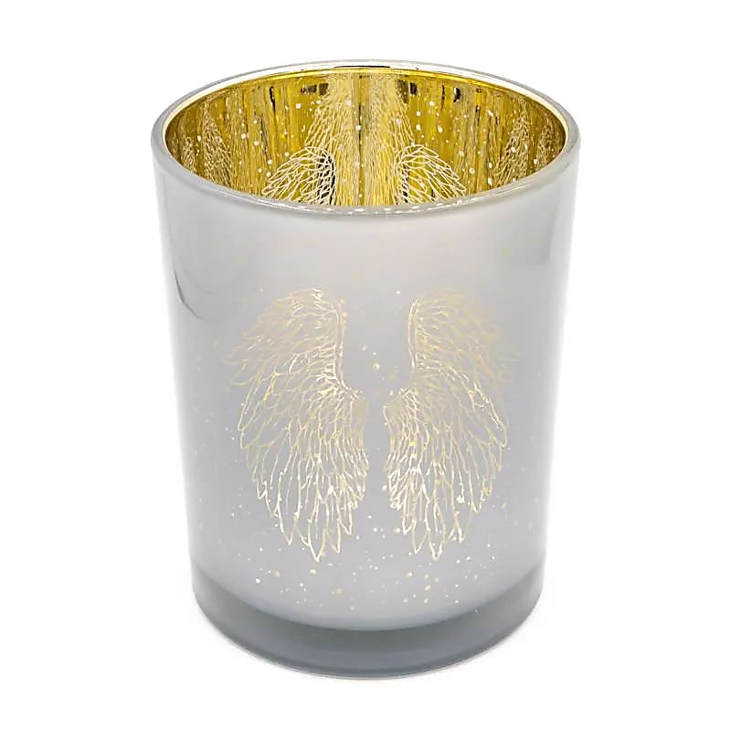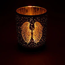 Angyal szárnyai az isteni védelmet, a tisztaságot és a belső fénybe vetett bizalmat szimbolizálja. Ezt üveg gyertyatartóA finom mintával és finom csillogással díszített, a gyertya lángját az angyalok jelenlétére és a lélek békéjére emlékezteti.