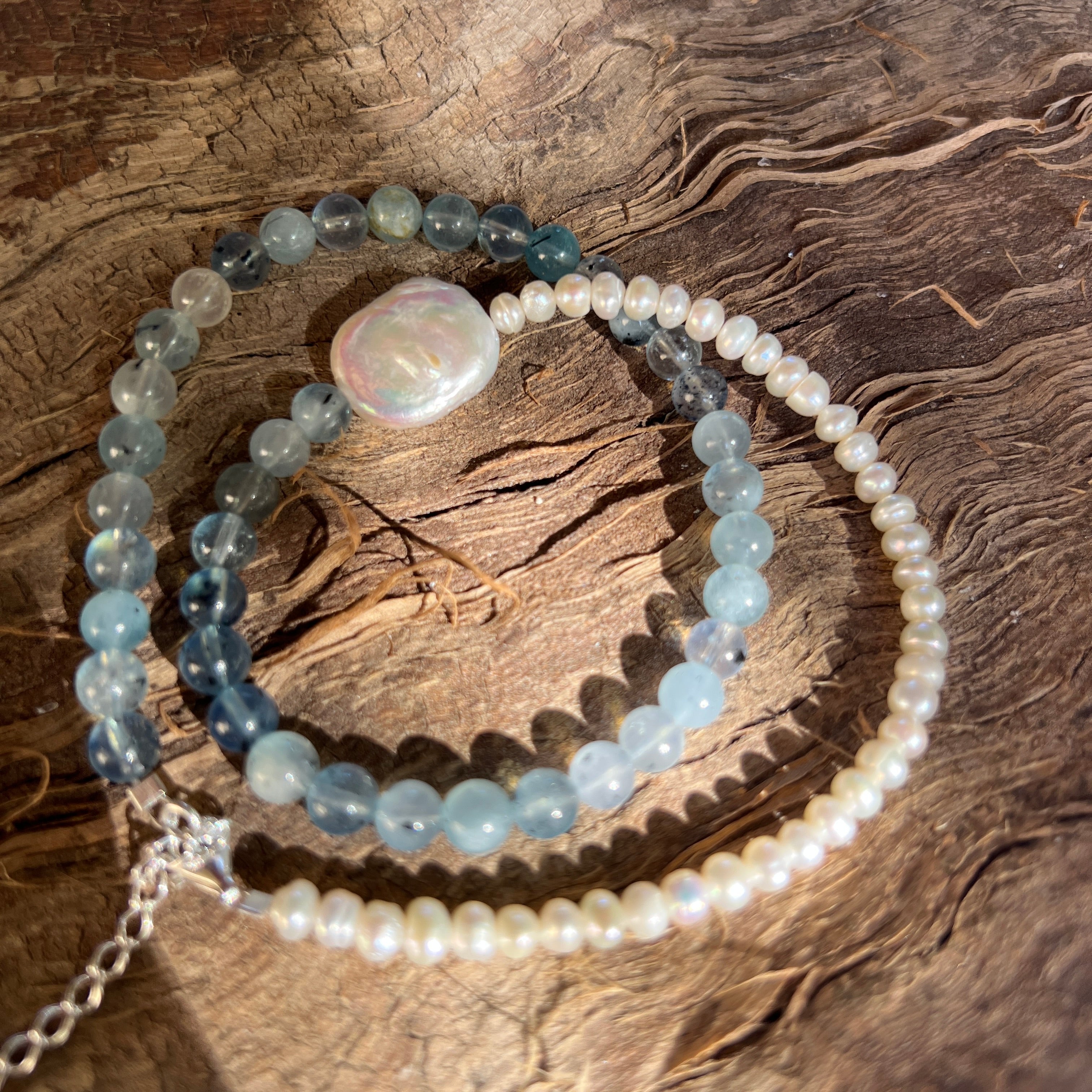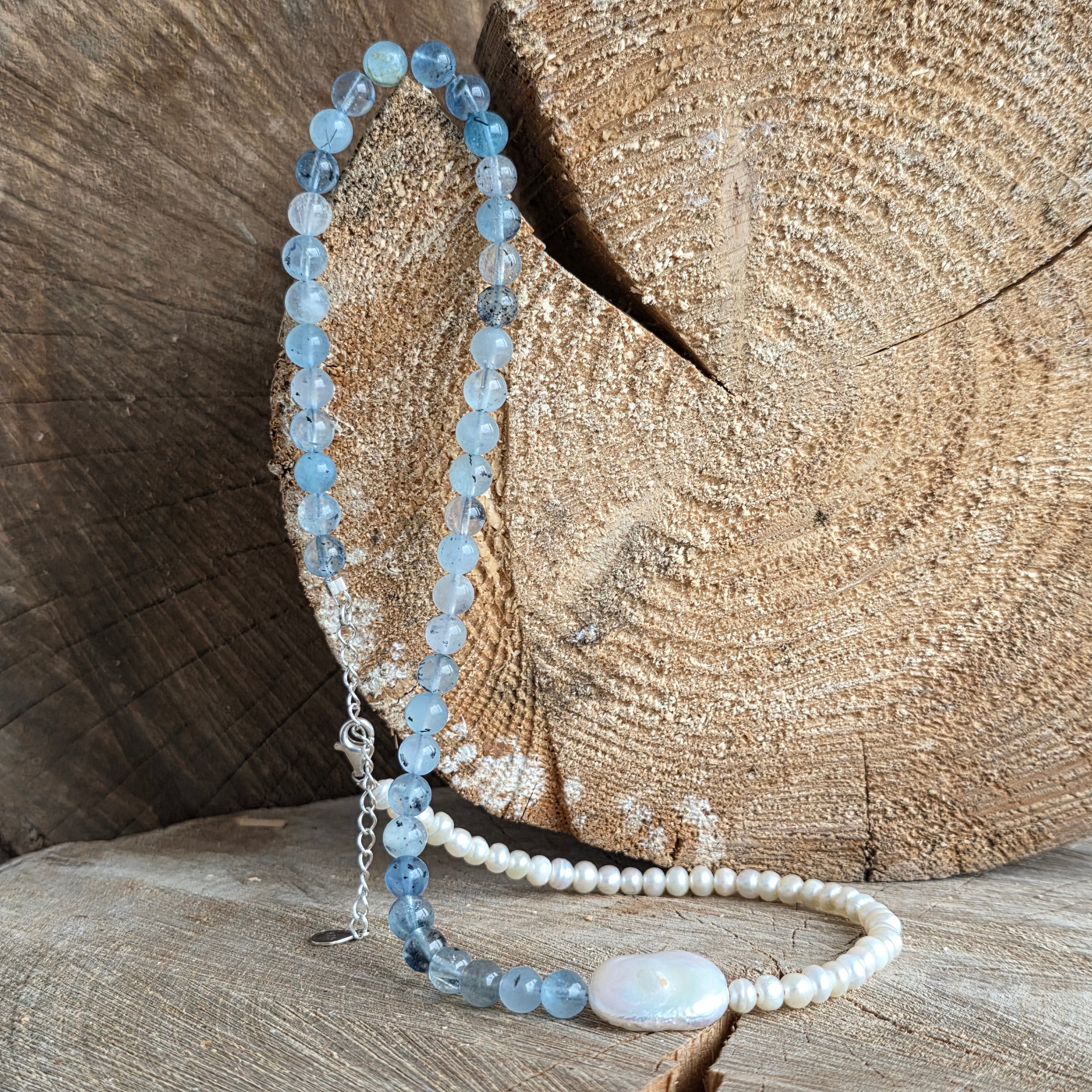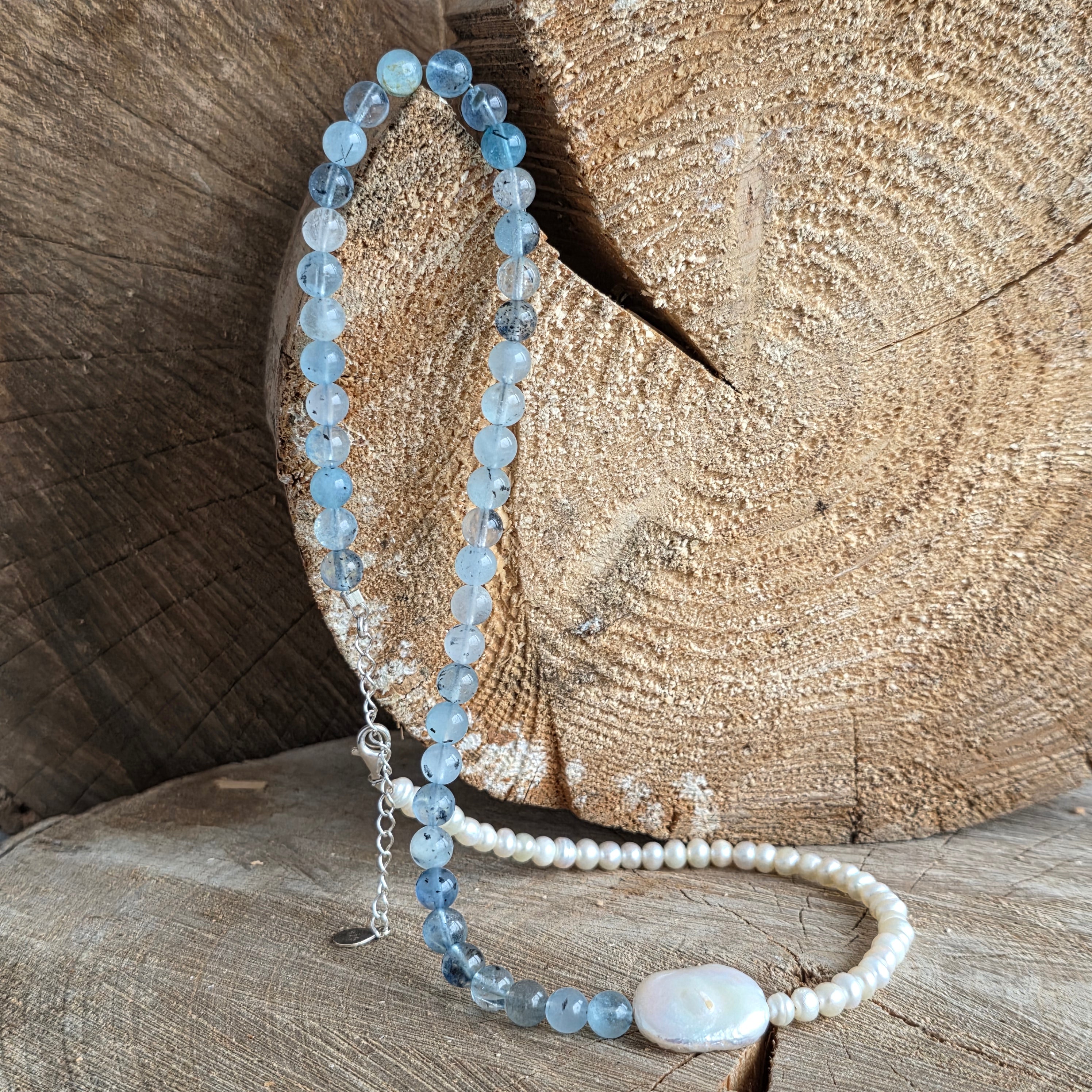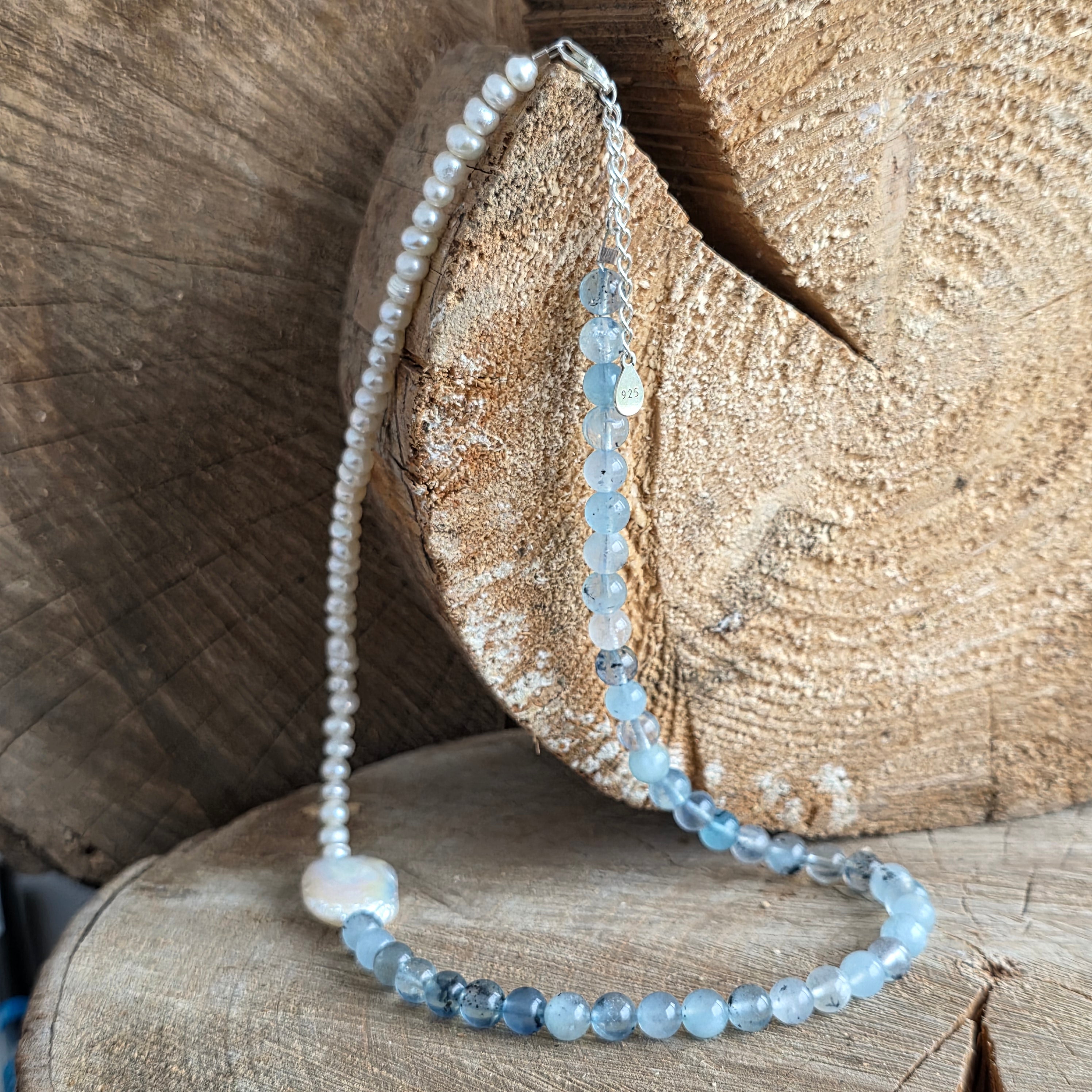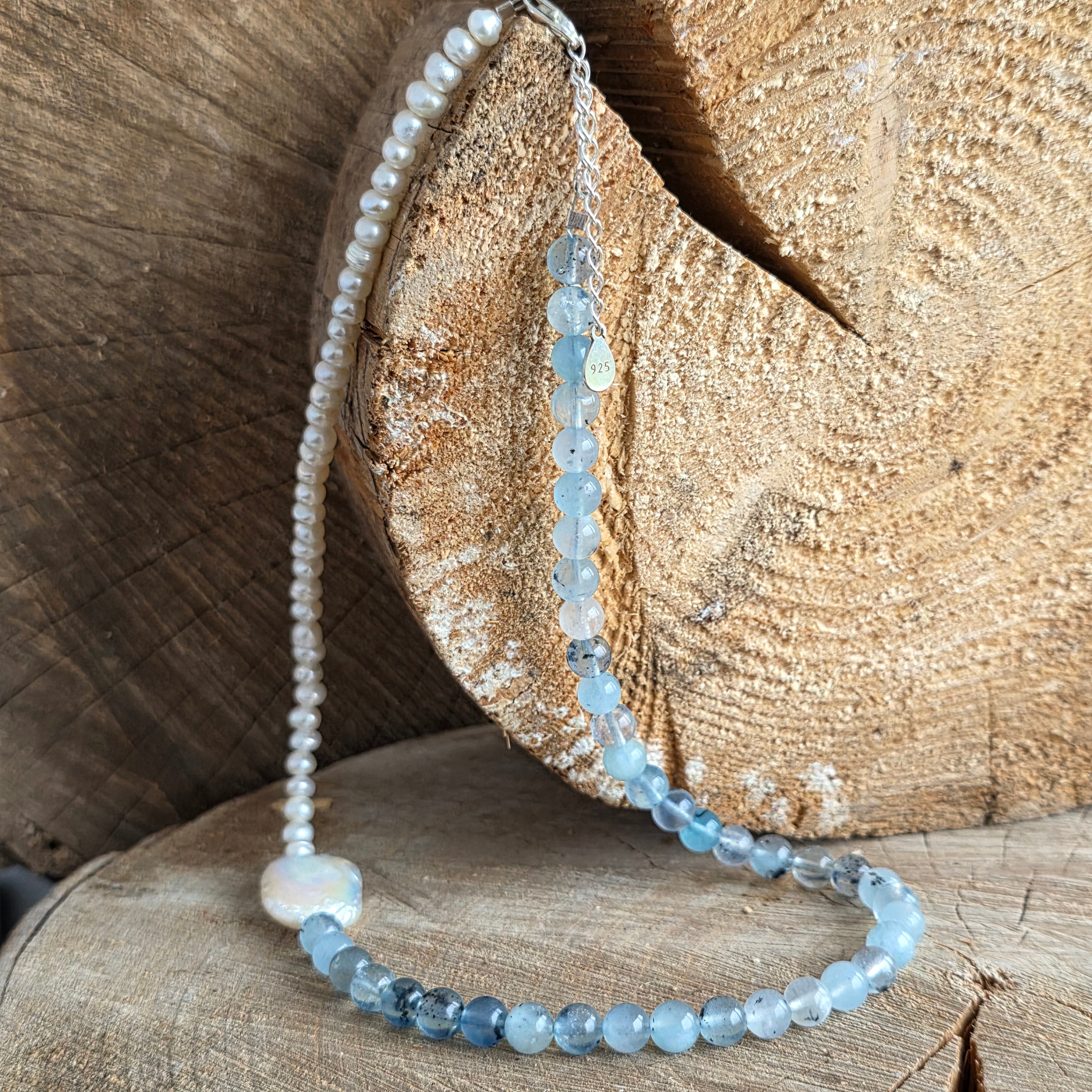 Készült 6 mm-es természetes akvamarin, a halványkék lágy árnyalataival és az óceán tiszta mélyére emlékeztető finom átlátszó fóliákkal a nyakláncot kiegészíti természetes gyöngyök, melyeket finom ragyogásuk és időtlen kifinomultságuk miatt választottak.