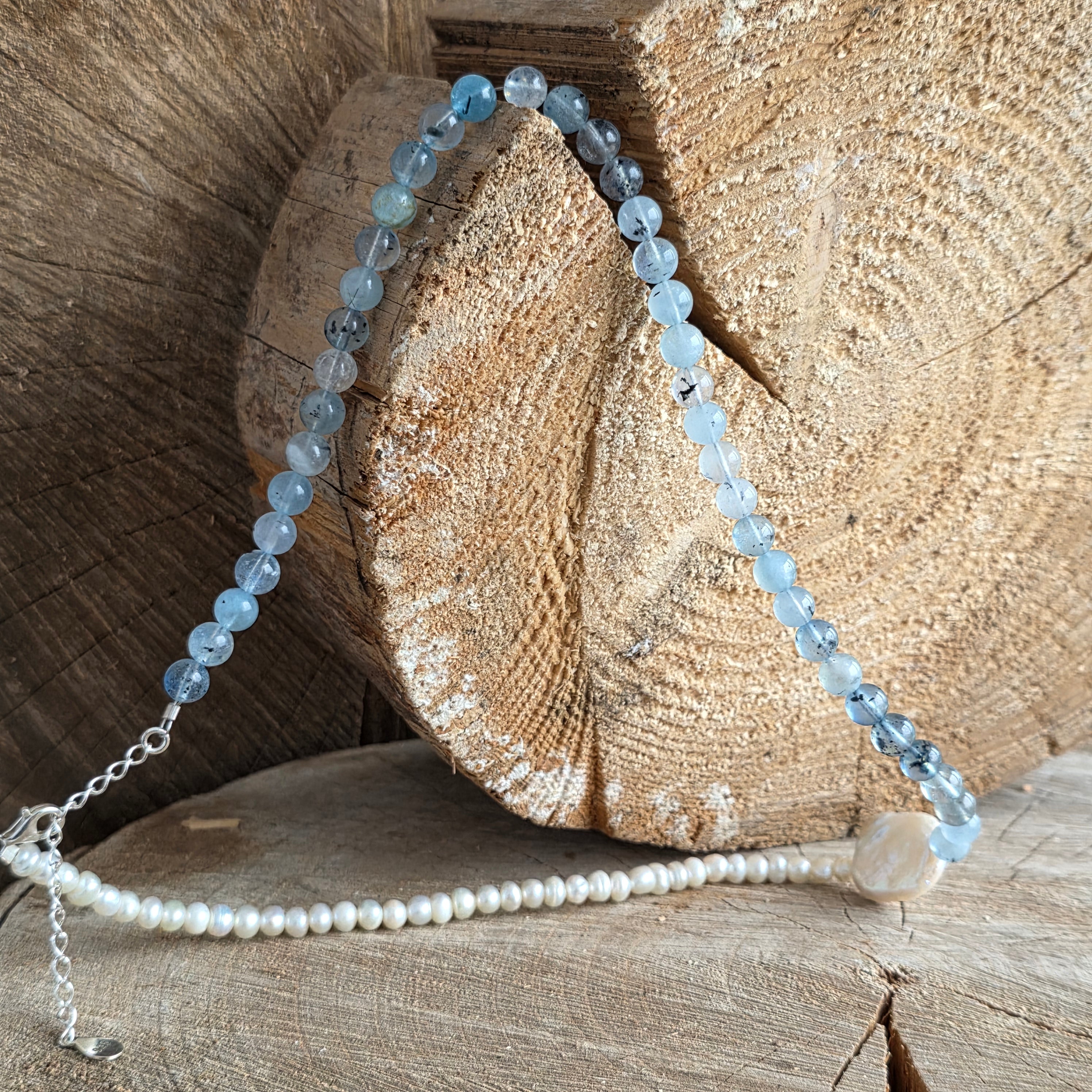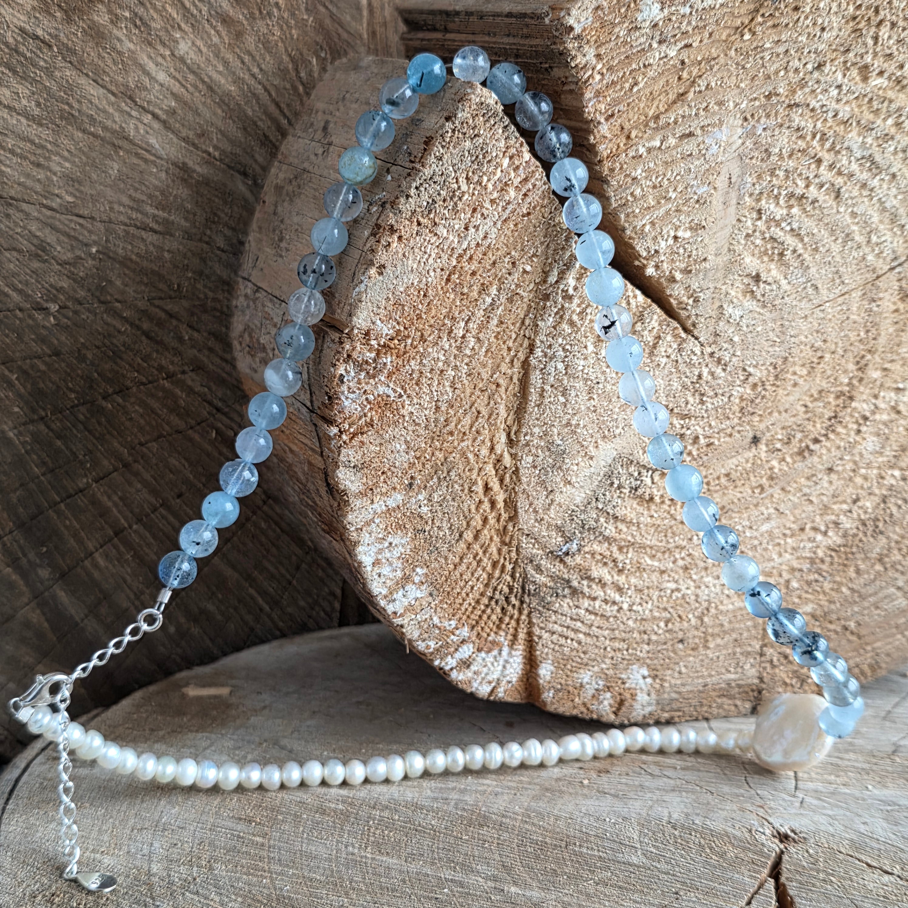 Anyagok: természetes akvamarin 6 mm, természetes gyöngyök, 925 ezüst